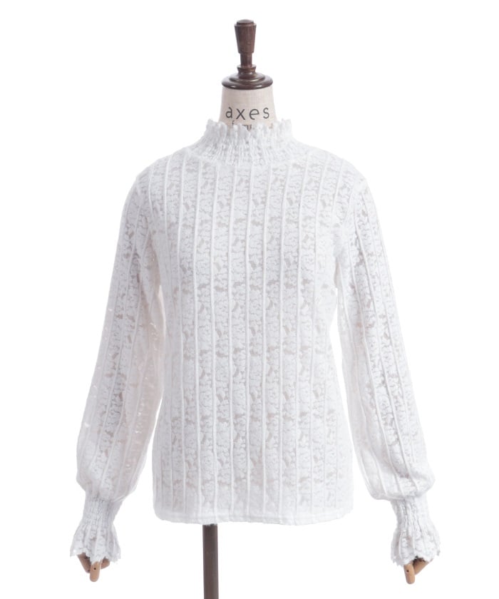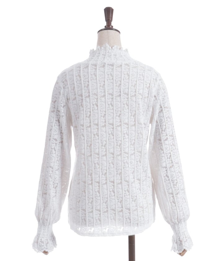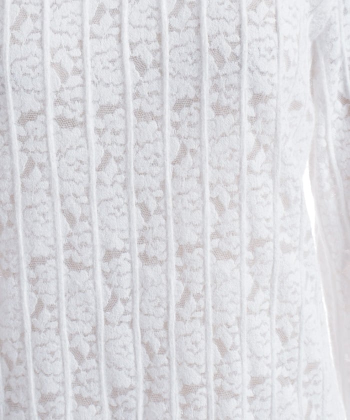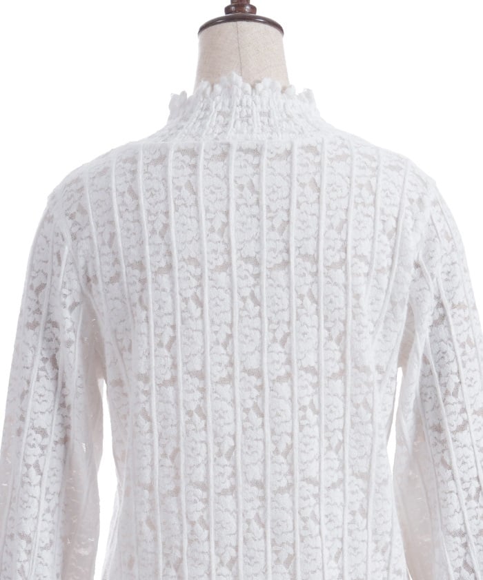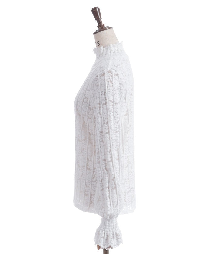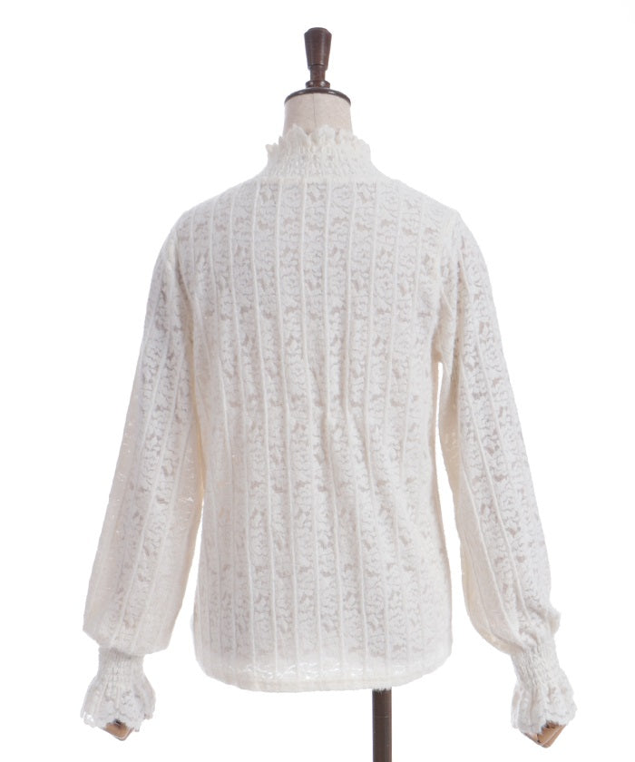 This carefully crafted design combines a classic striped pattern with gorgeous floral lace. The stand-up collar adds elegance, while the gently voluminous sleeves create a sense of light movement. The subtle sheer lace adds depth to any outfit, making it versatile for both dressy and casual looks.