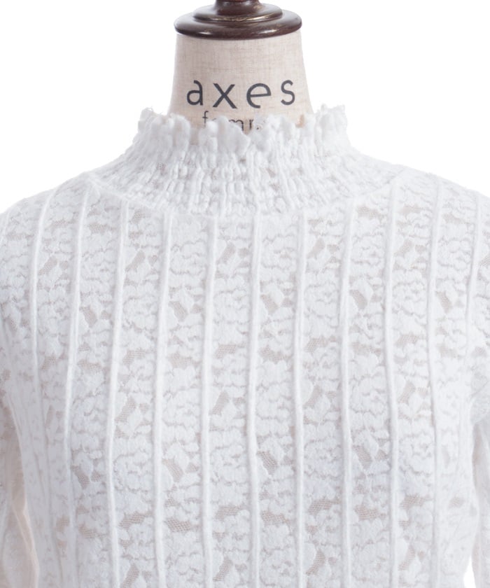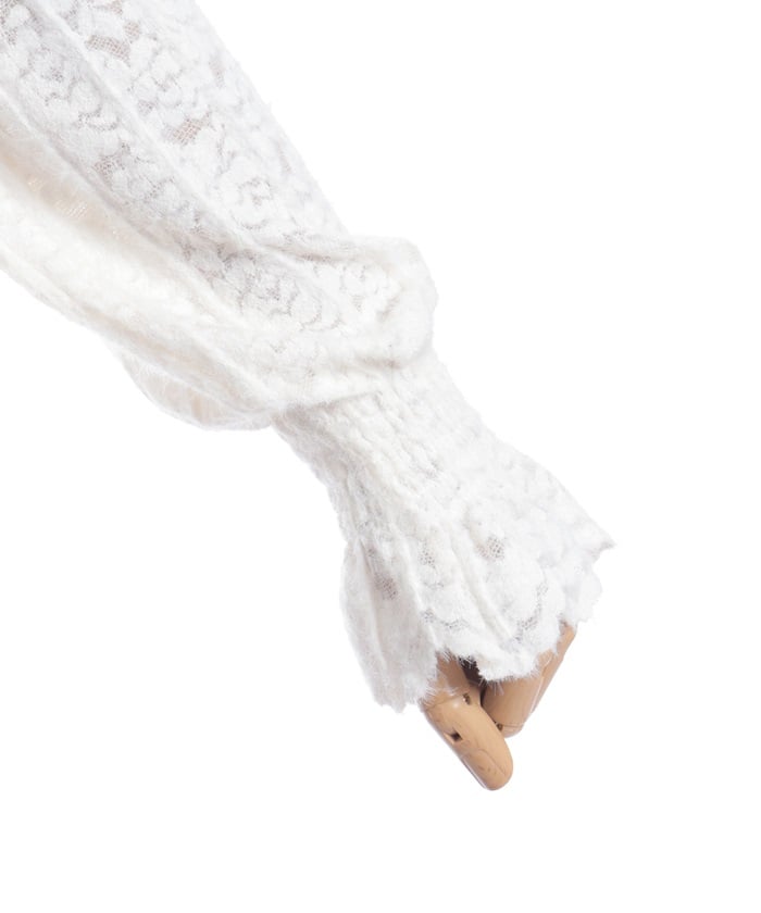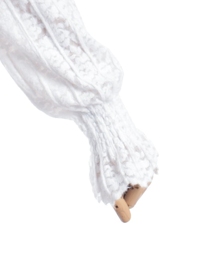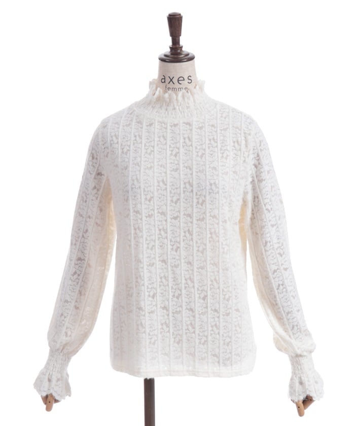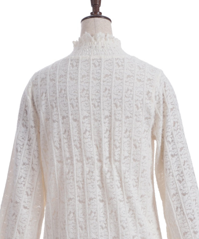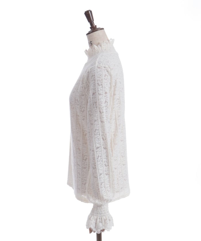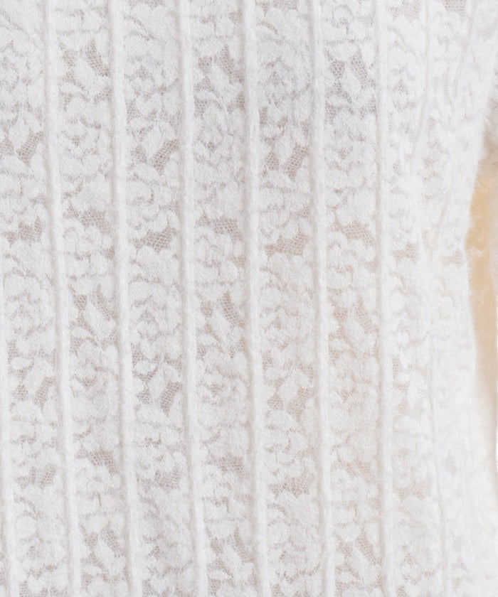 This carefully crafted design combines a classic striped pattern with gorgeous floral lace. The stand-up collar adds elegance, while the gently voluminous sleeves create a sense of light movement. The subtle sheer lace adds depth to any outfit, making it versatile for both dressy and casual looks.