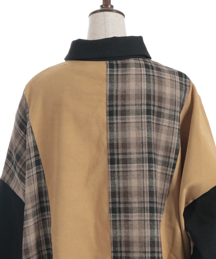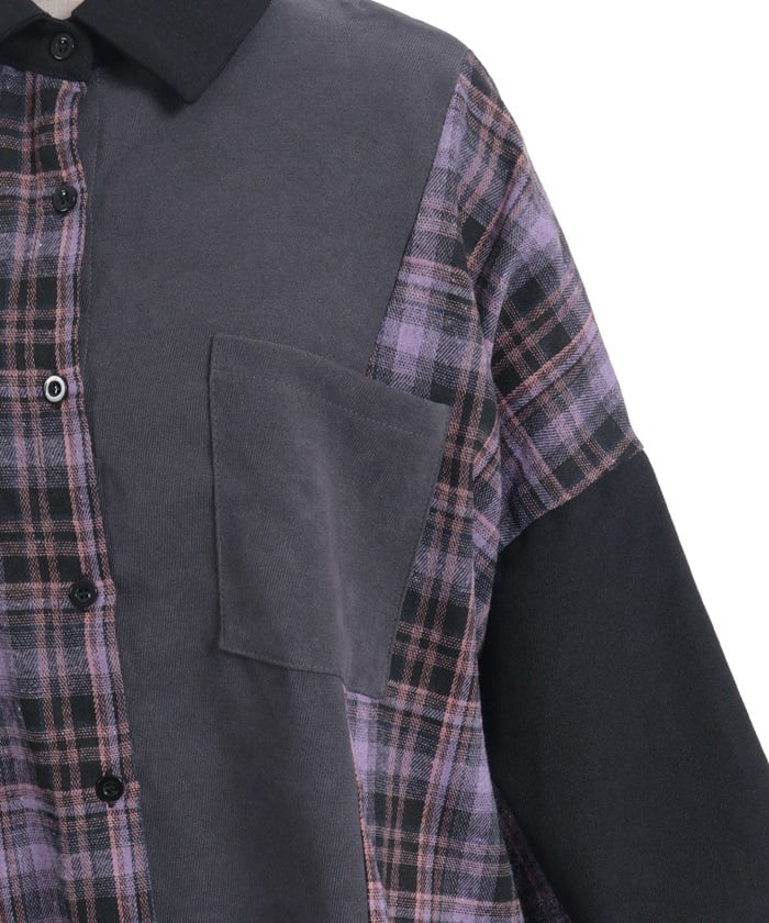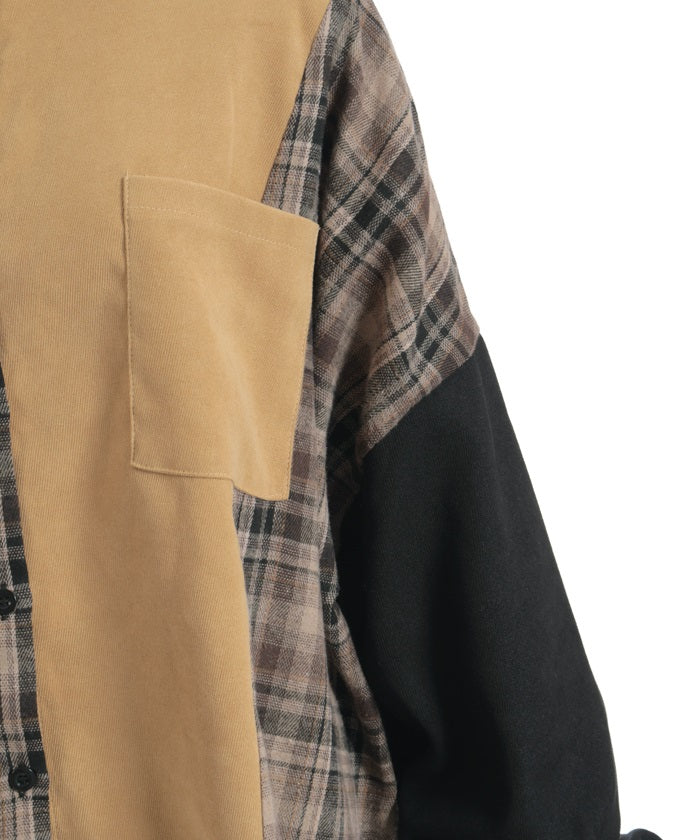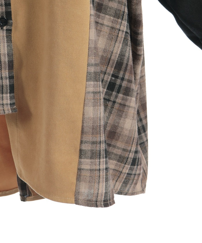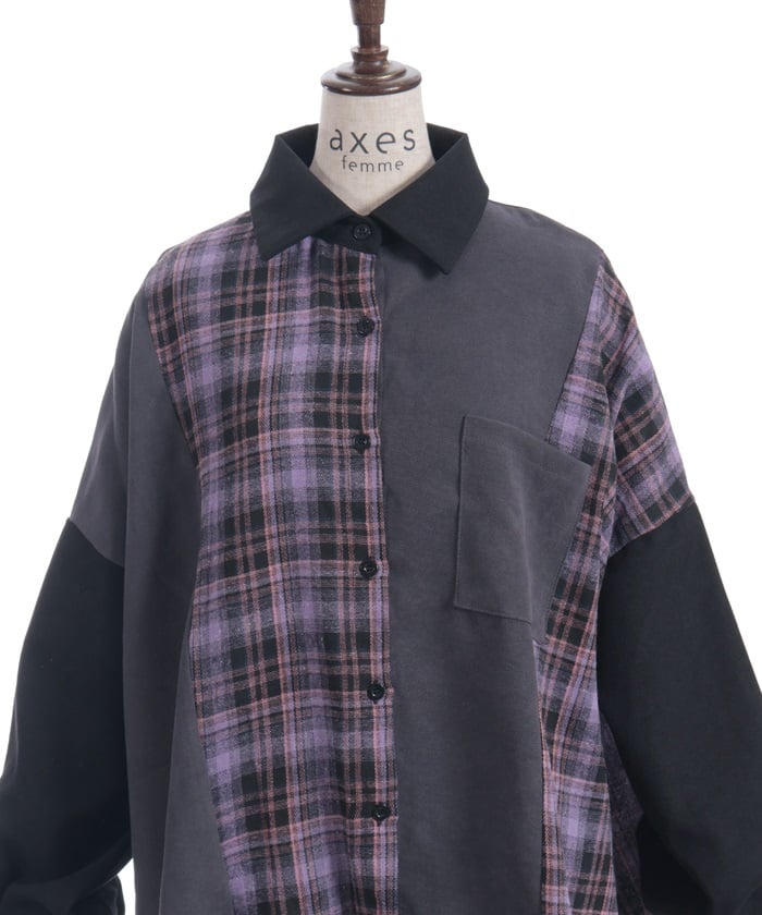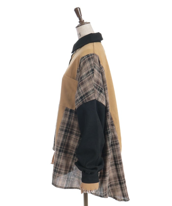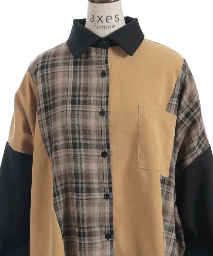 This eye-catching shirt features a patchwork design that combines different materials and a check pattern. The relaxed silhouette allows for a casual look, while also elevating its sophisticated cuteness.