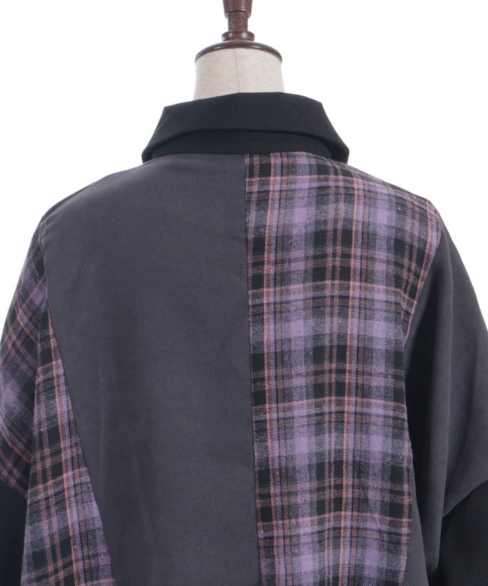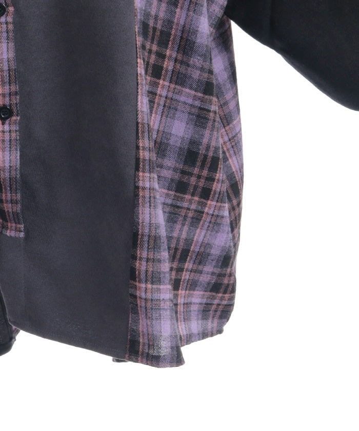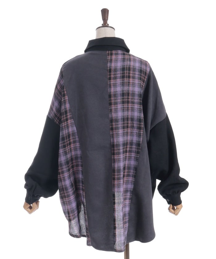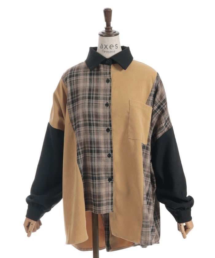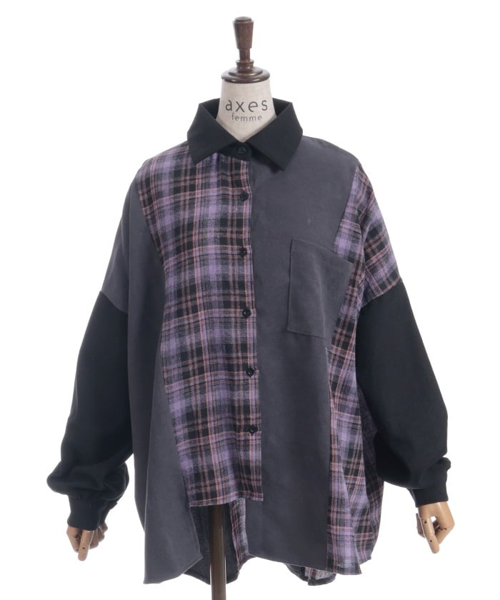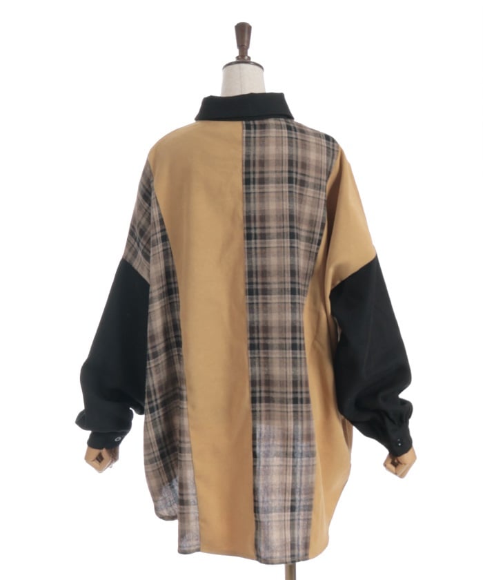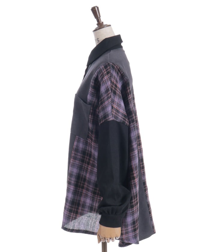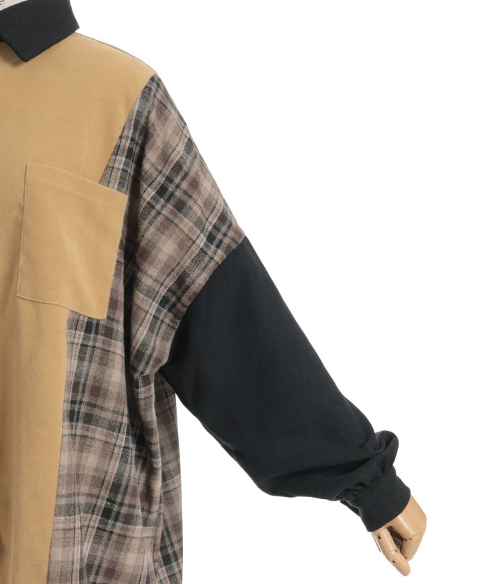 This eye-catching shirt features a patchwork design that combines different materials and a check pattern. The relaxed silhouette allows for a casual look, while also elevating its sophisticated cuteness.