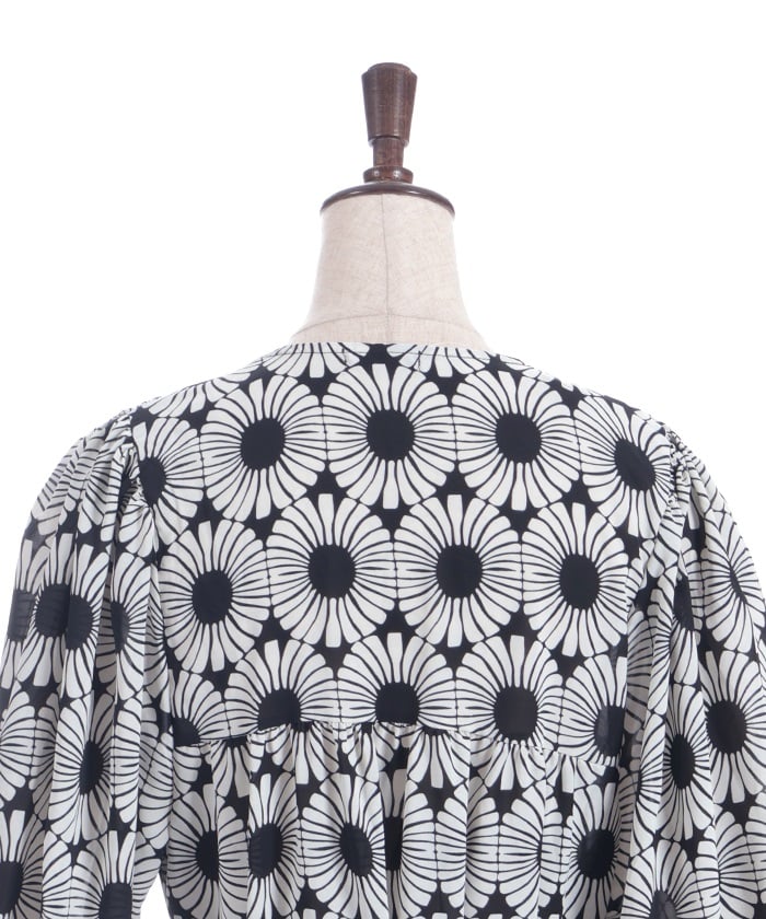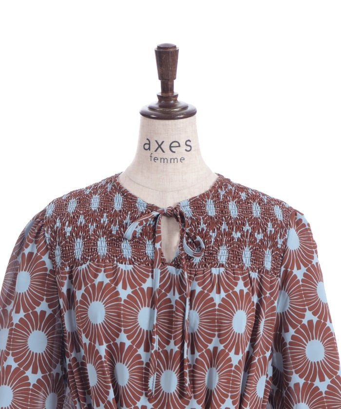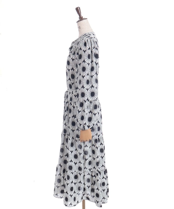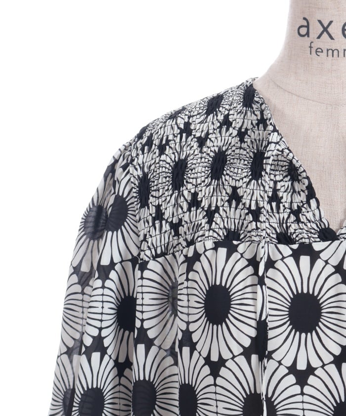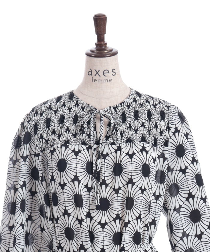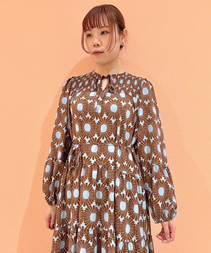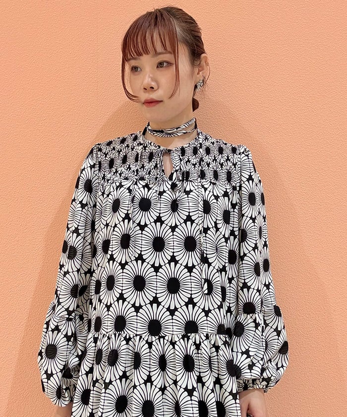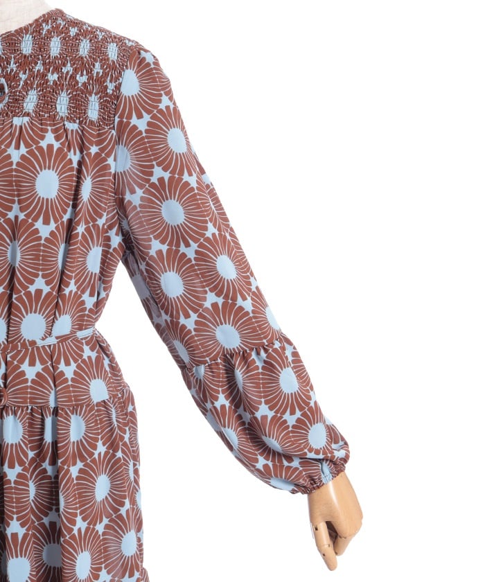 This all-over print dress exudes a nostalgic vibe. Generously shirred around the neck and shoulders creates a three-dimensional, fitted look while flattering the face.