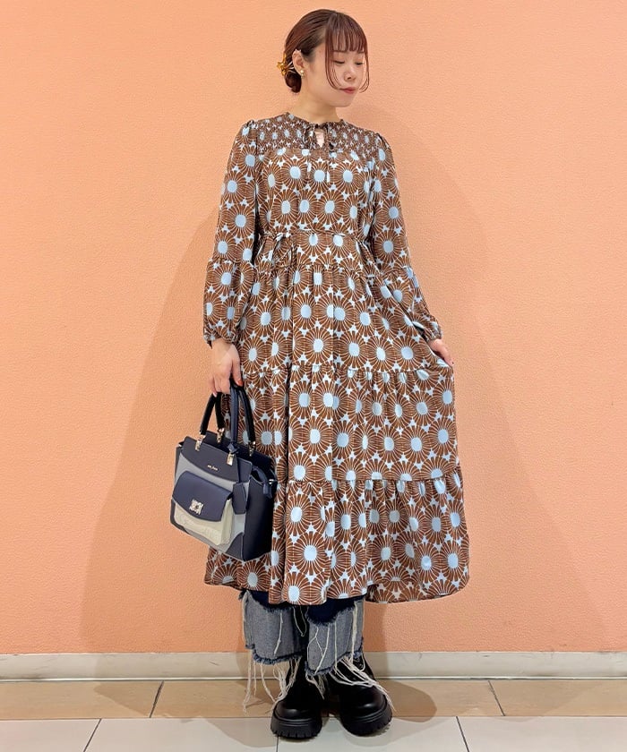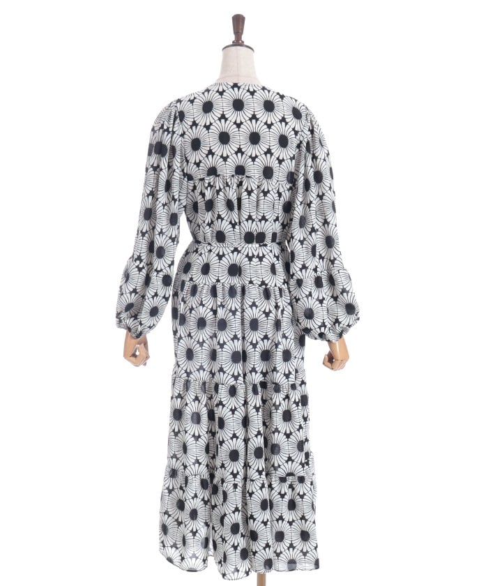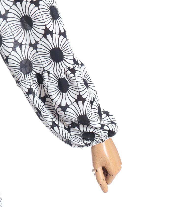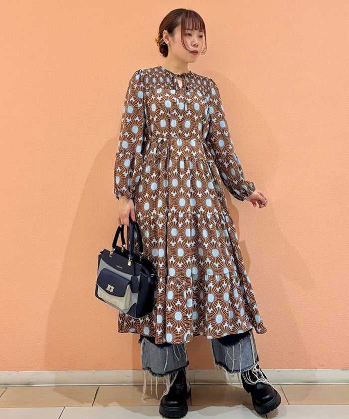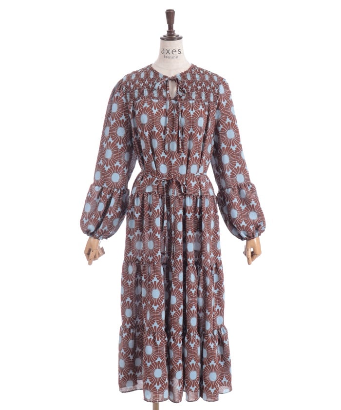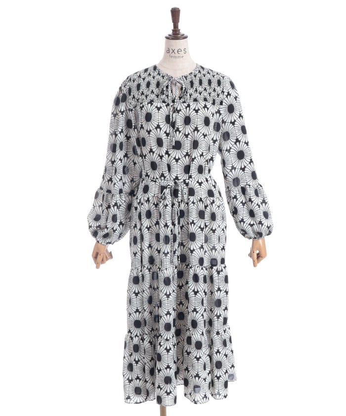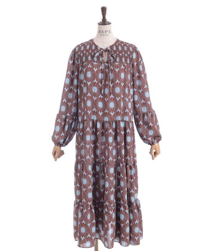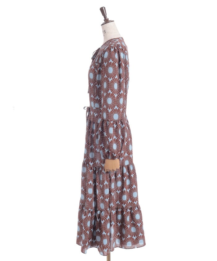 This all-over print dress exudes a nostalgic vibe. Generously shirred around the neck and shoulders creates a three-dimensional, fitted look while flattering the face.