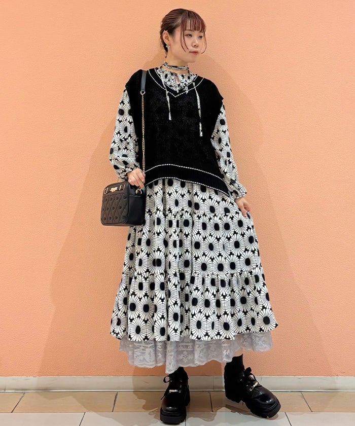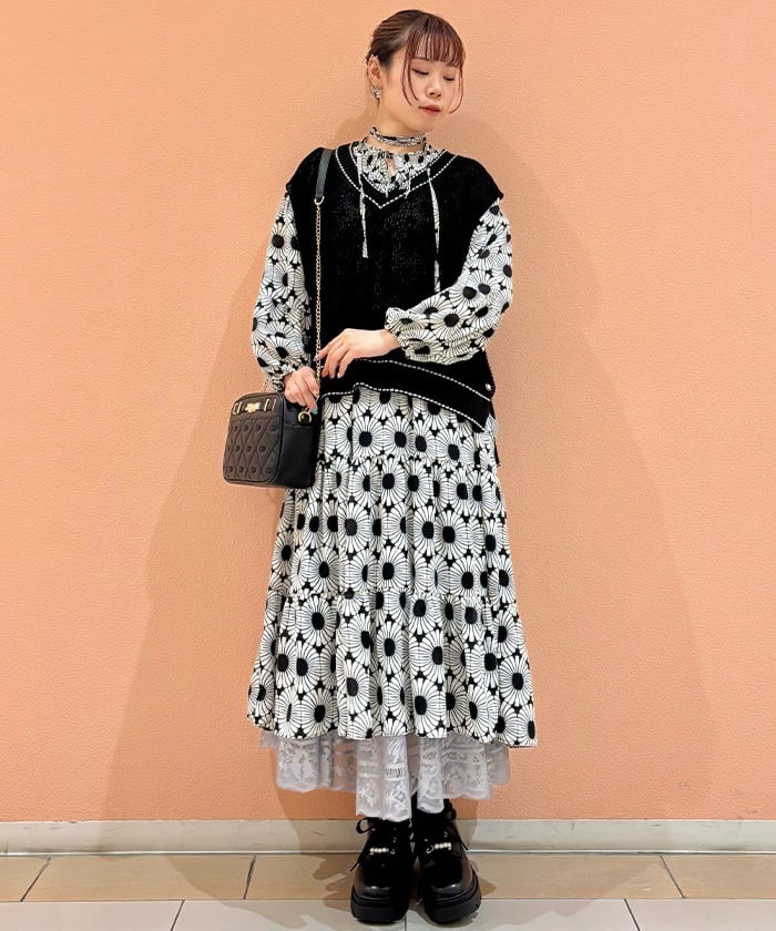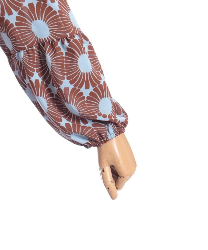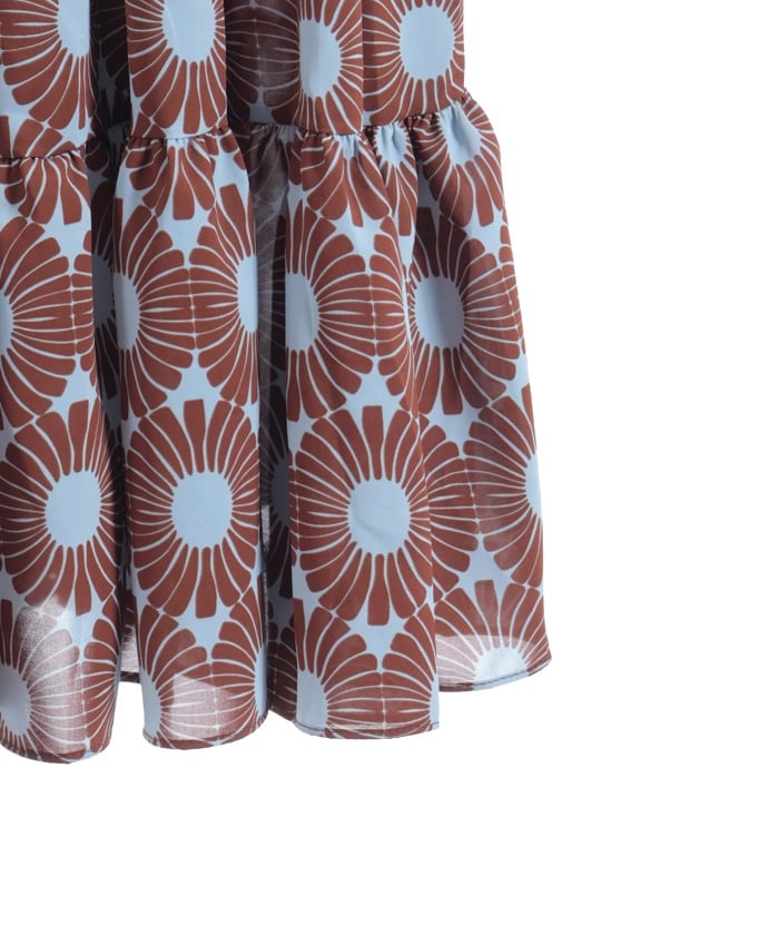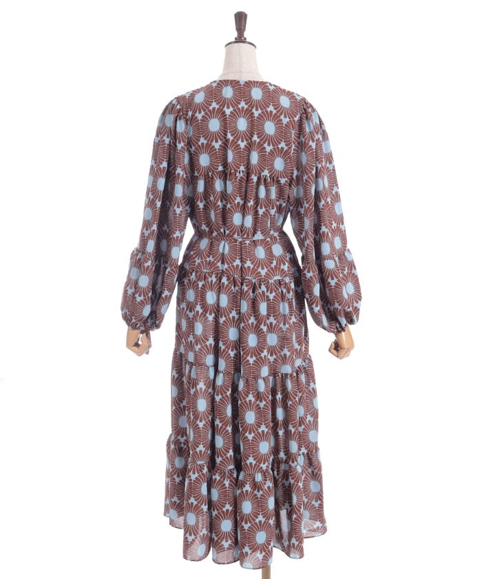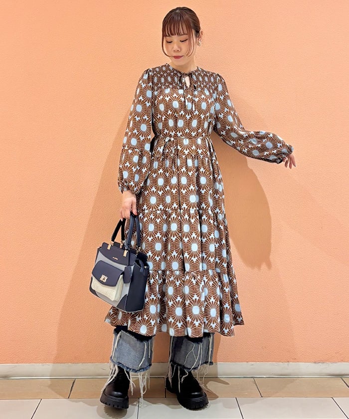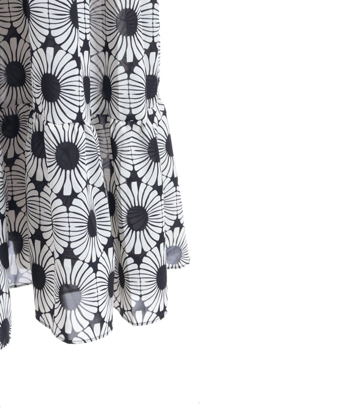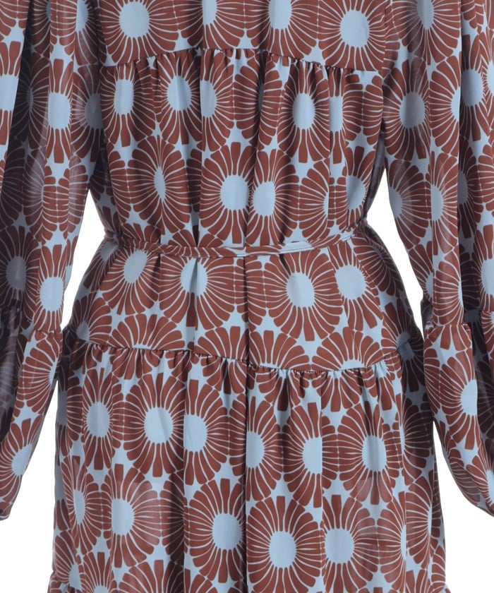 This all-over print dress exudes a nostalgic vibe. Generously shirred around the neck and shoulders creates a three-dimensional, fitted look while flattering the face.