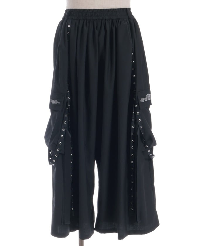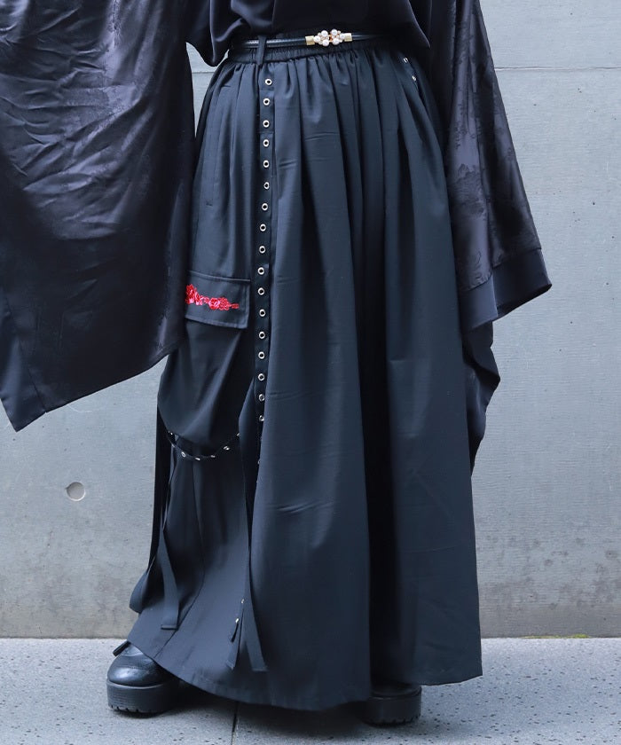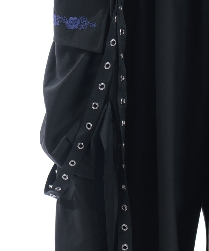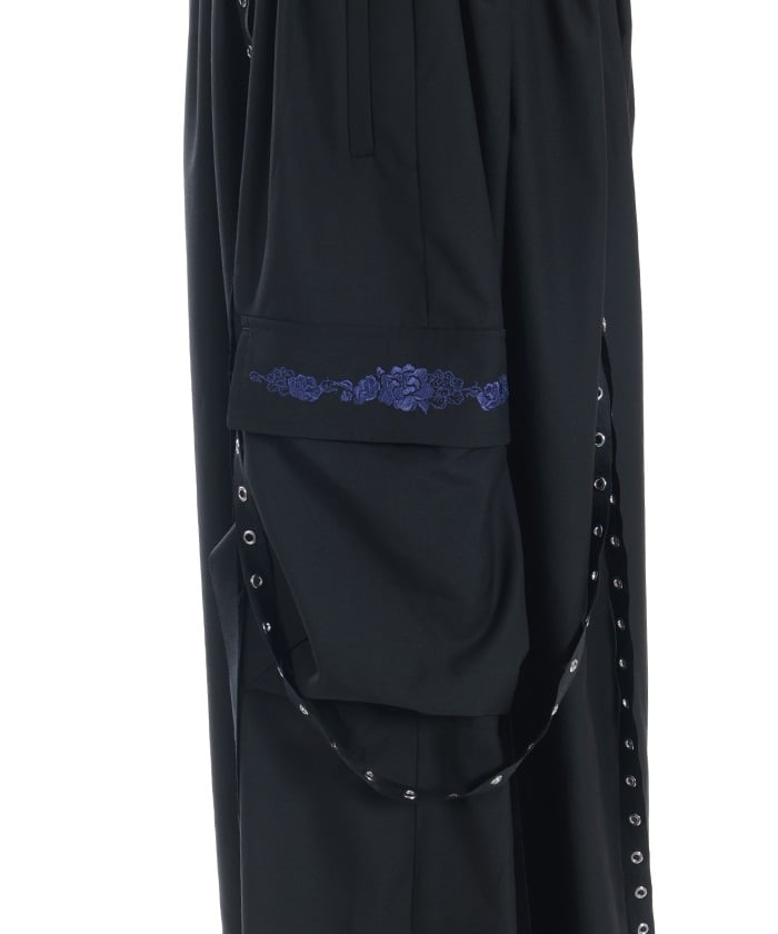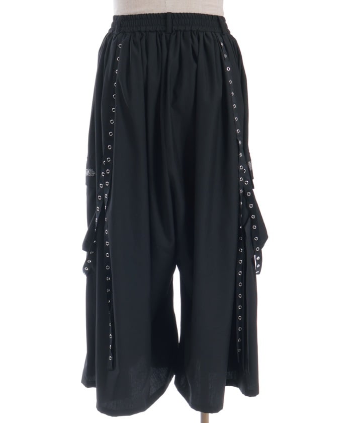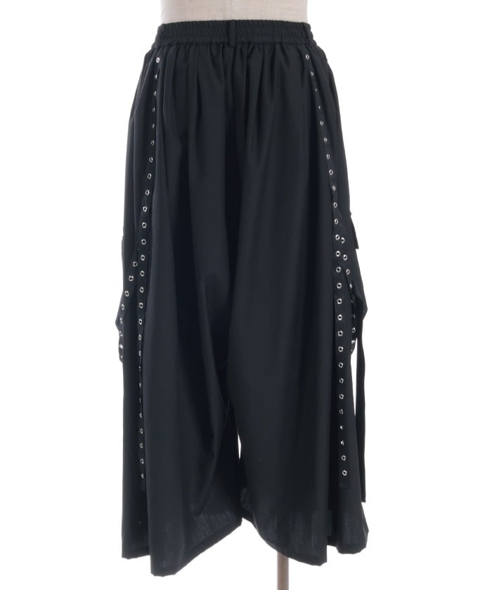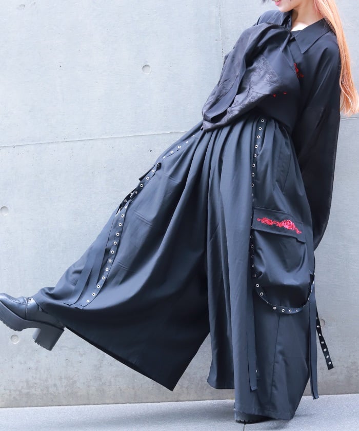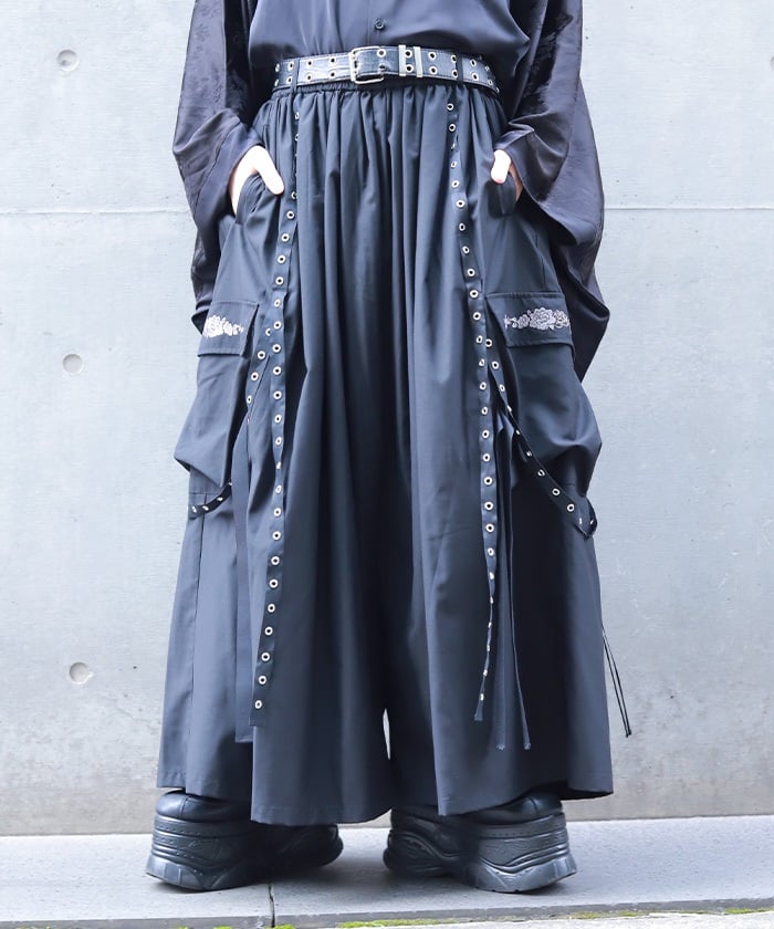 The traditional hakama silhouette is combined with cargo pants pockets, cords, and tape with eyelets to create an eclectic Japanese-Western design.