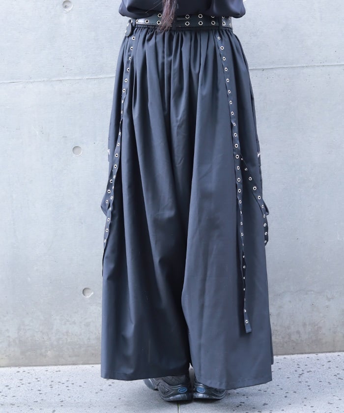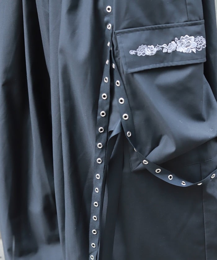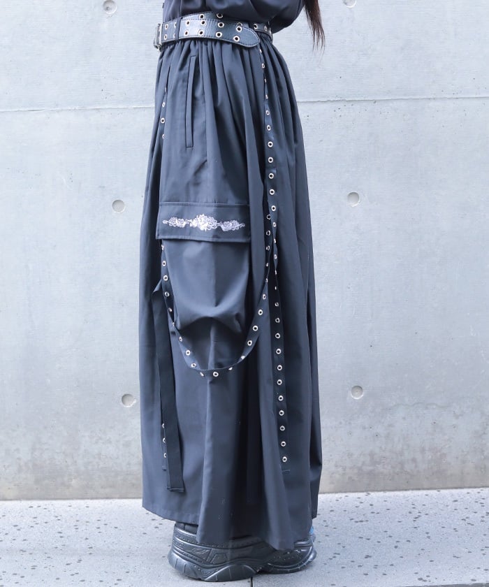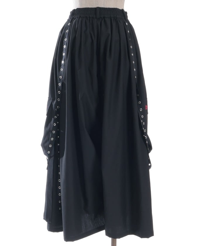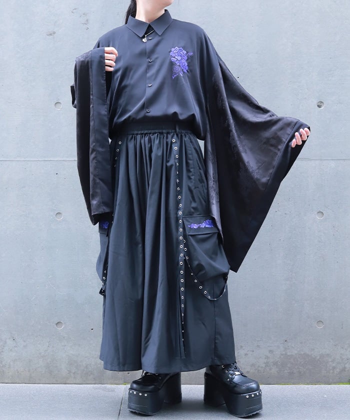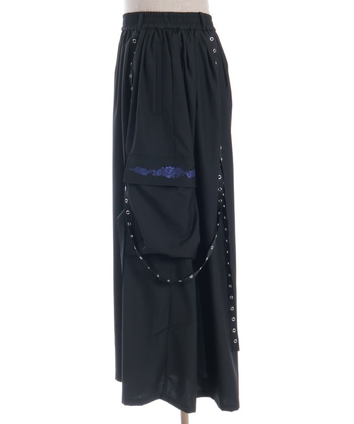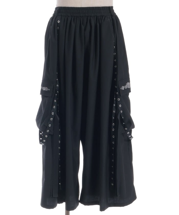 The traditional hakama silhouette is combined with cargo pants pockets, cords, and tape with eyelets to create an eclectic Japanese-Western design.