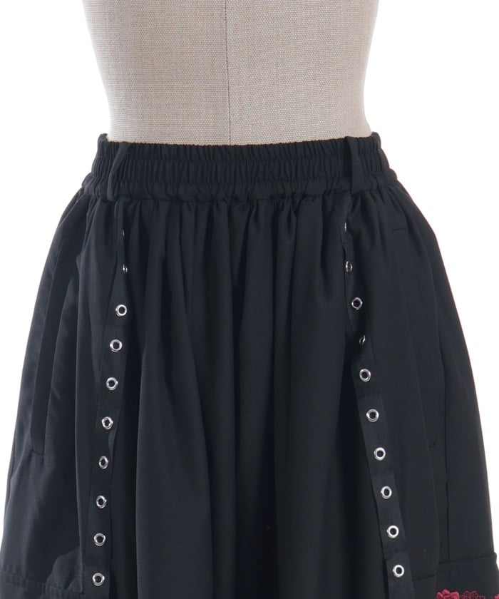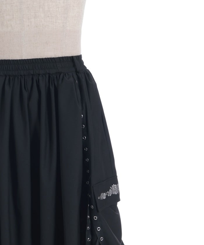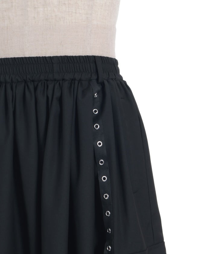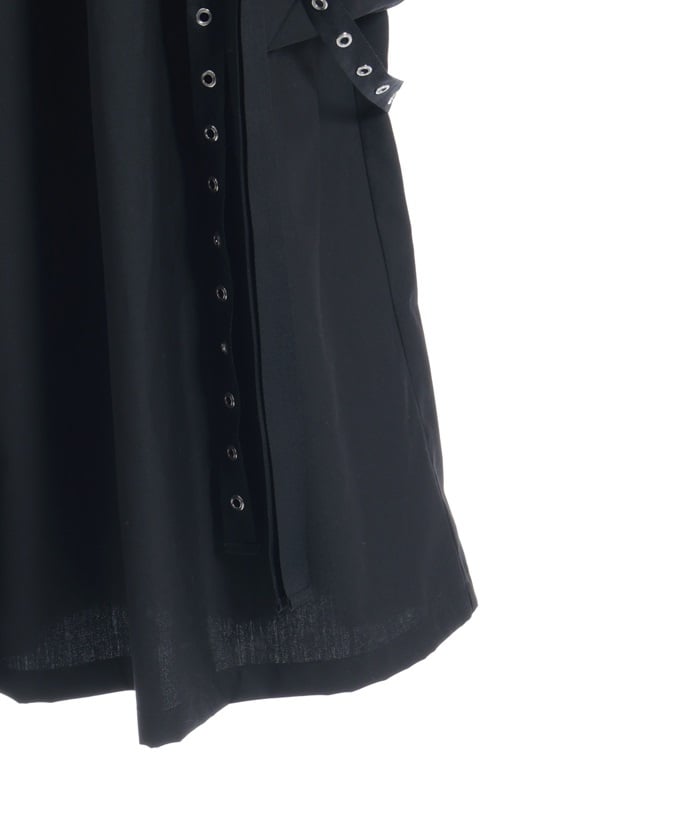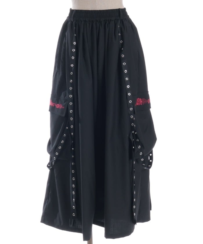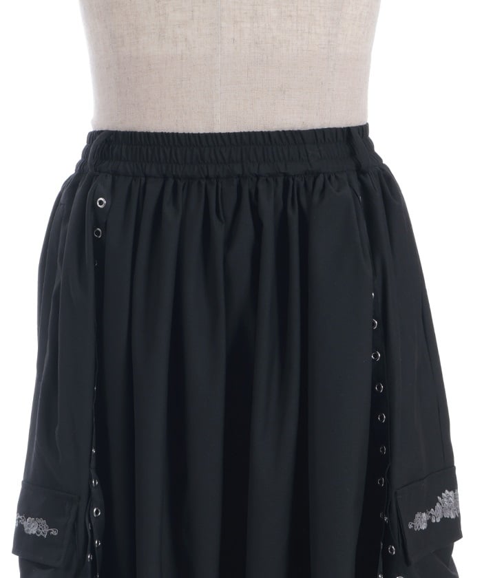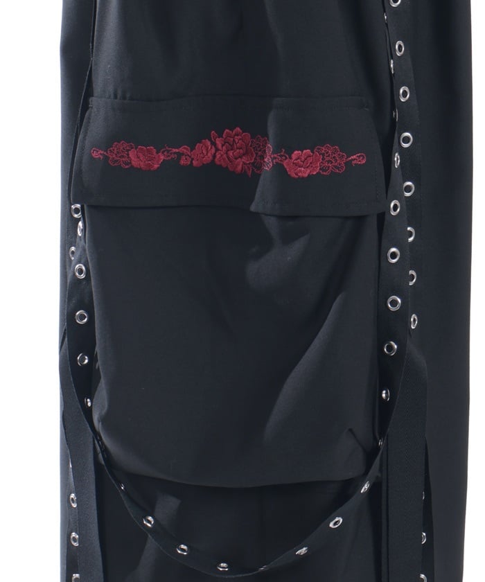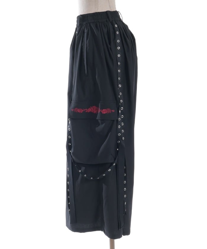 The traditional hakama silhouette is combined with cargo pants pockets, cords, and tape with eyelets to create an eclectic Japanese-Western design.
