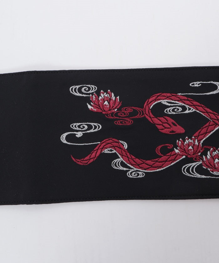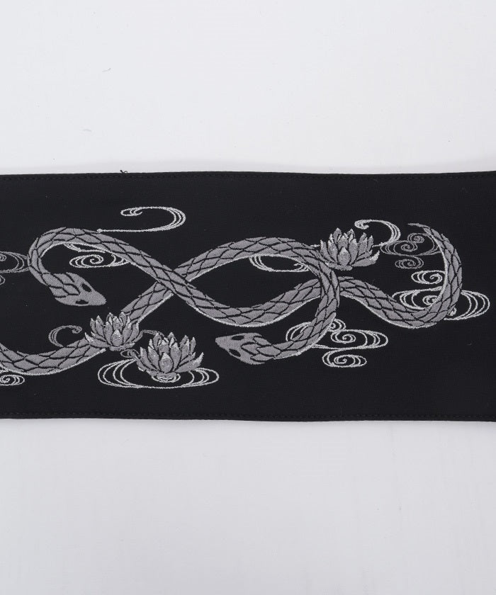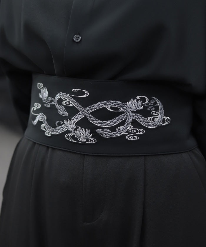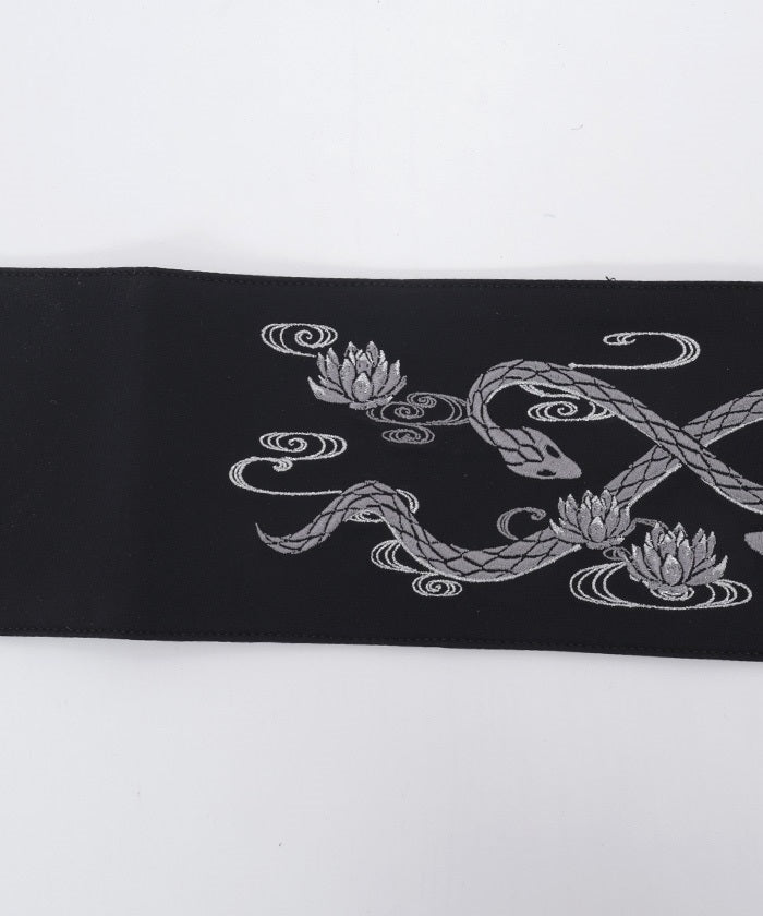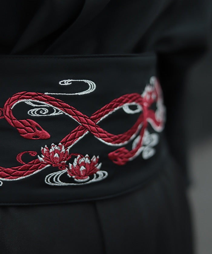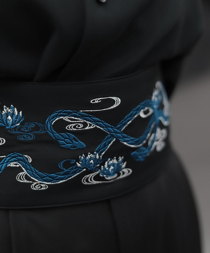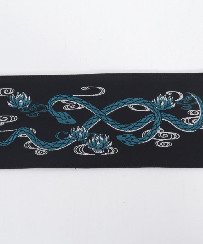 The strength of the snake and the elegance of the lotus floating on the water's surface are expressed through delicate embroidery.