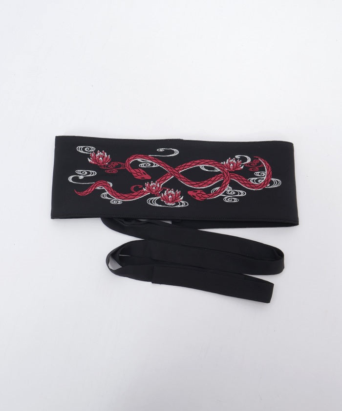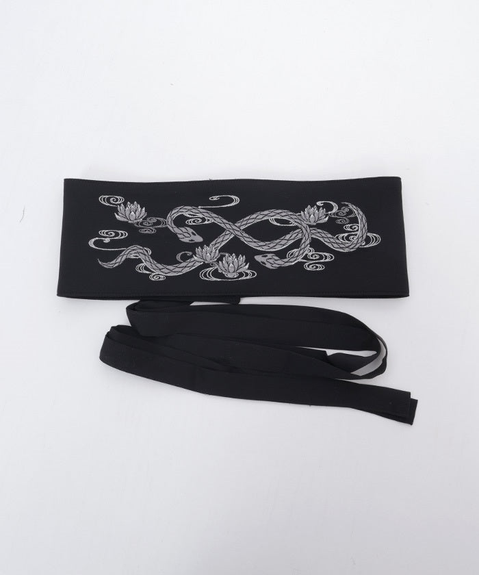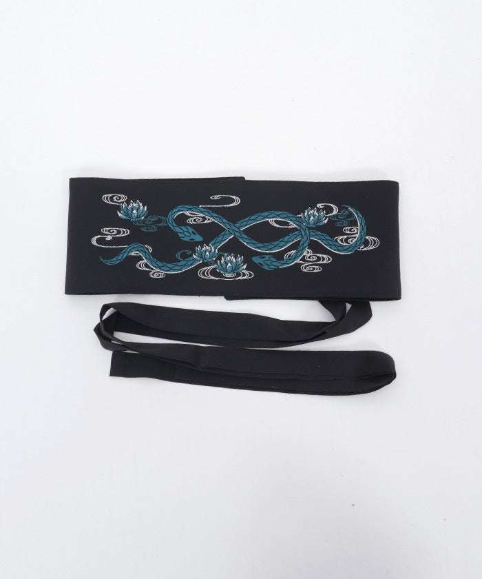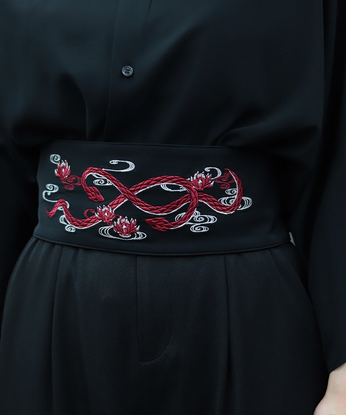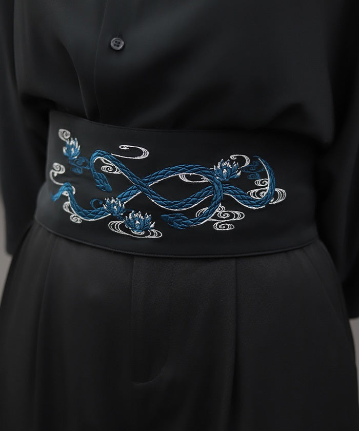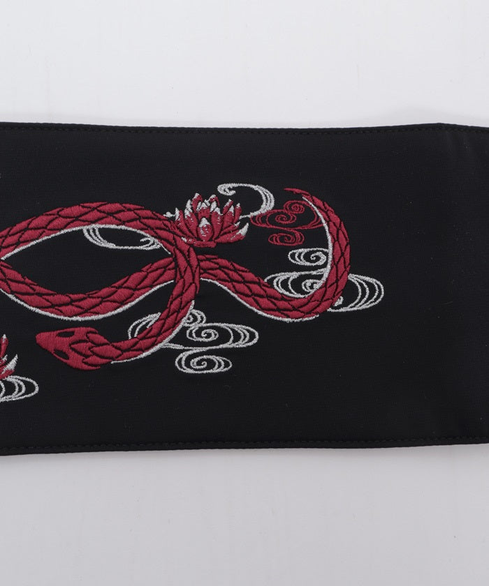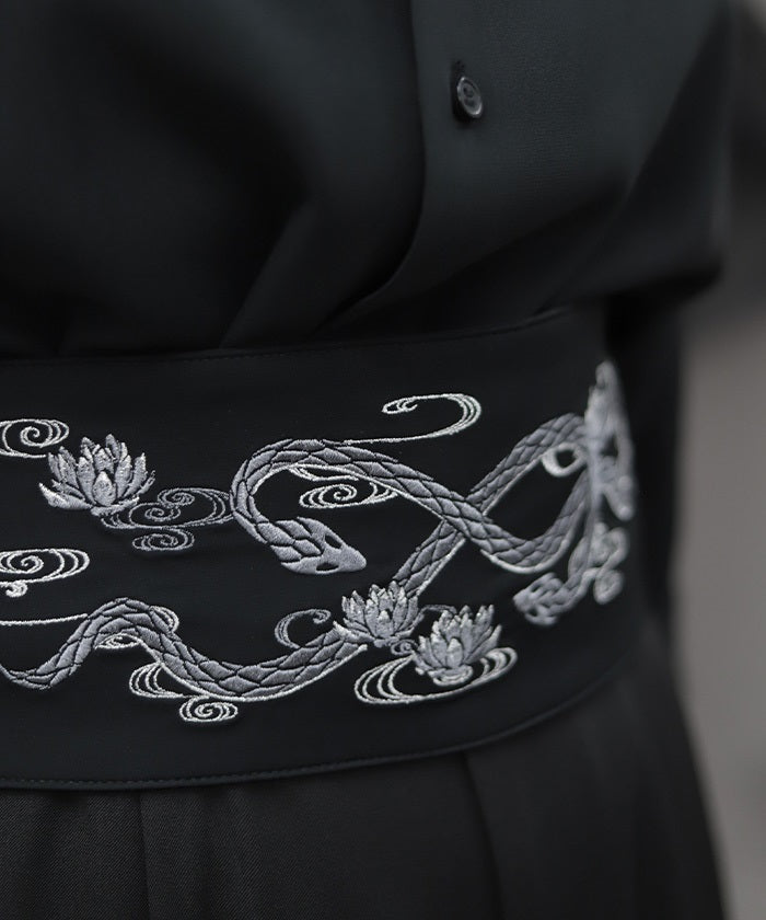 The strength of the snake and the elegance of the lotus floating on the water's surface are expressed through delicate embroidery.