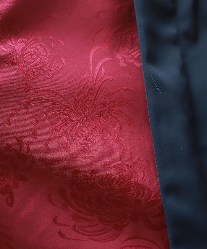 The collar and cuffs feature not only chrysanthemums, but also folding fans and hairpins for a graceful appearance.