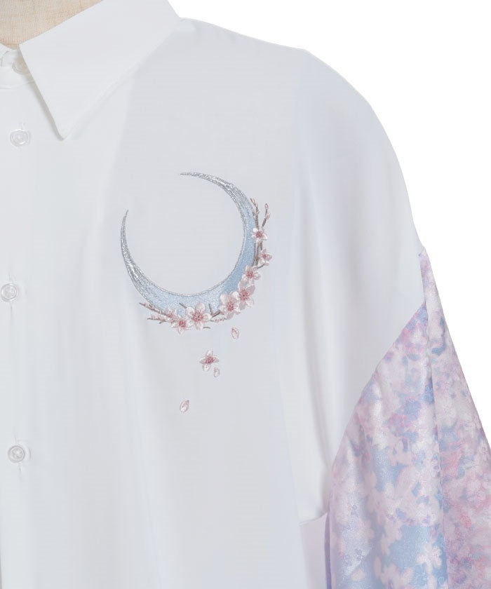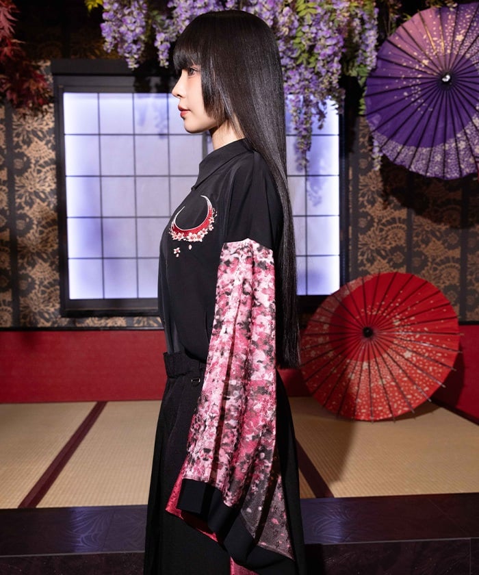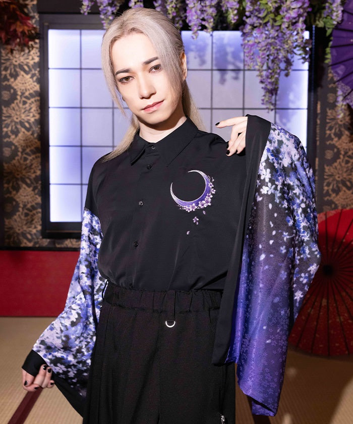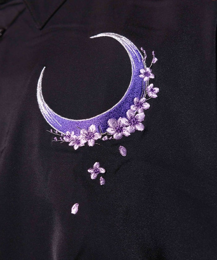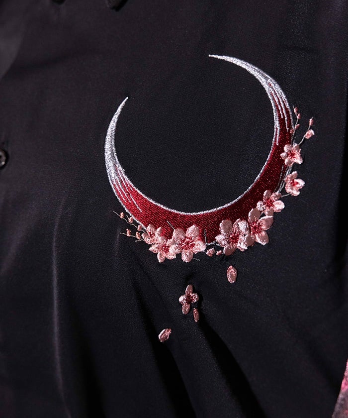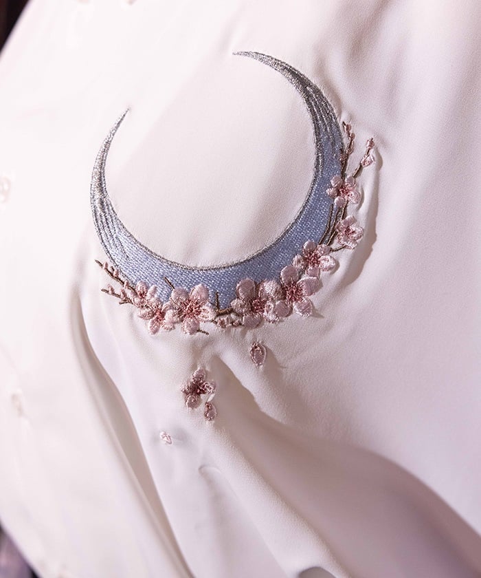 Crescent-shaped cherry blossom embroidery on the chest evokes the fleeting yet elegant atmosphere of cherry blossoms at night.