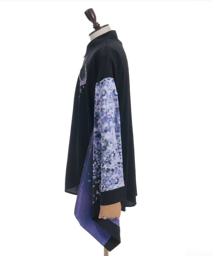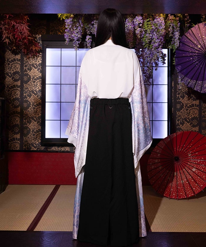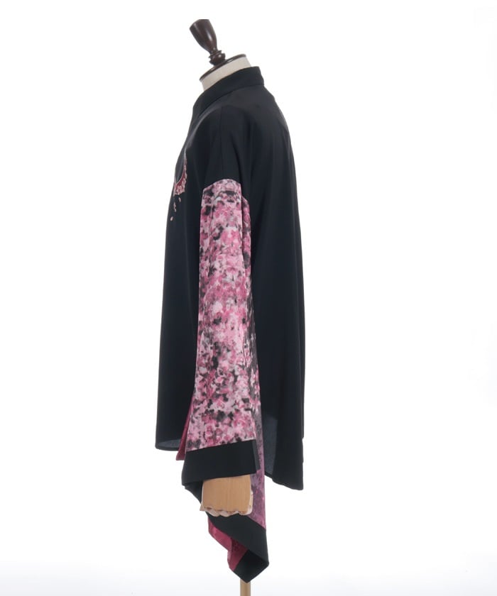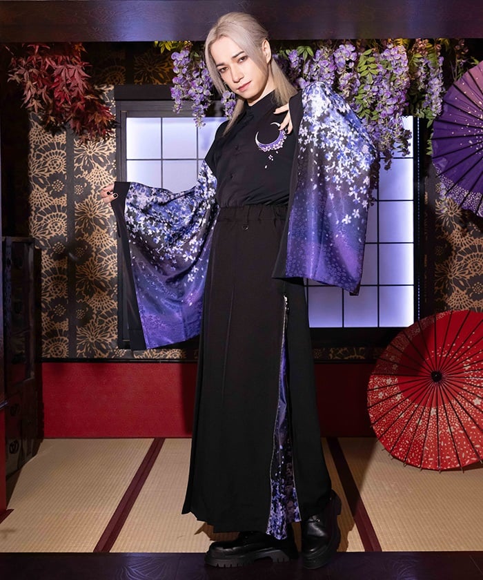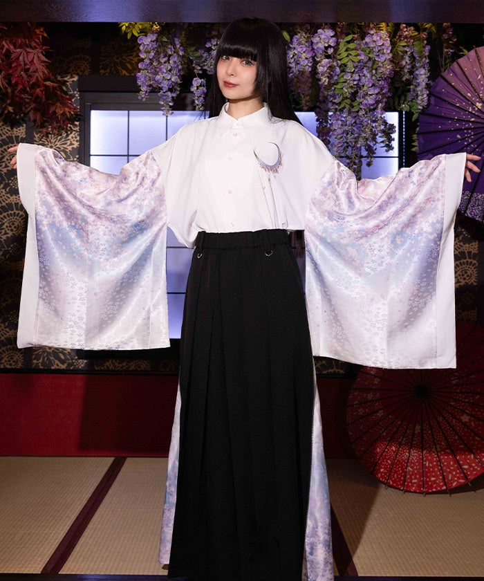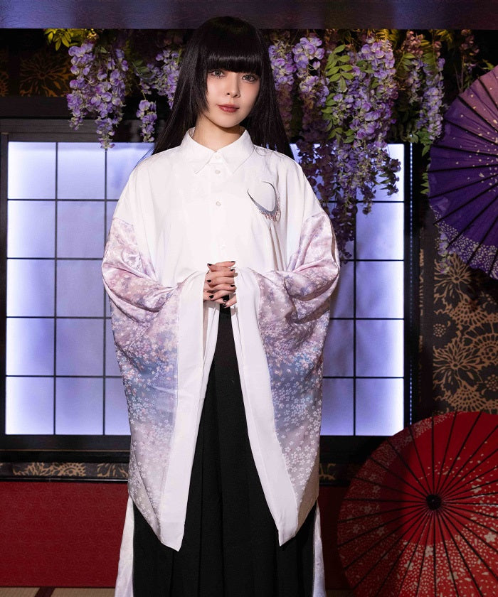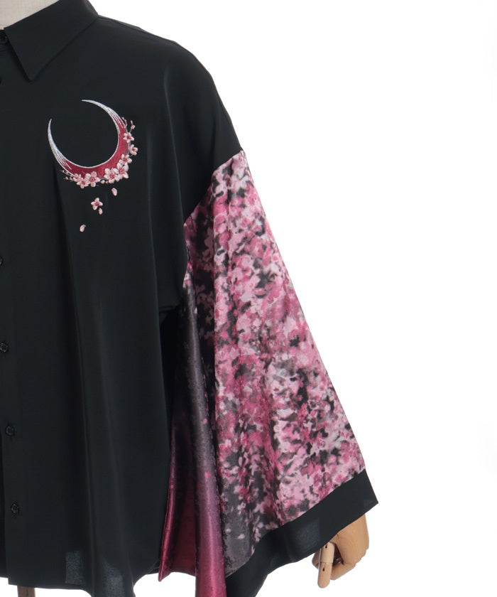 Crescent-shaped cherry blossom embroidery on the chest evokes the fleeting yet elegant atmosphere of cherry blossoms at night.