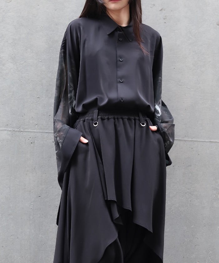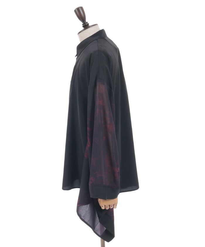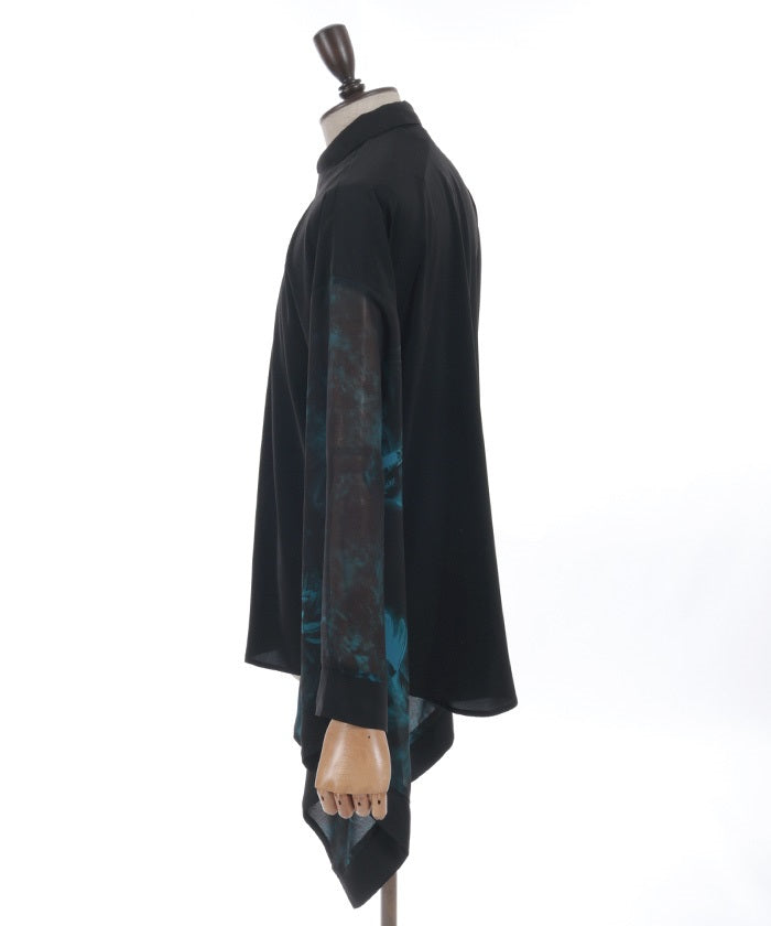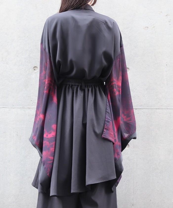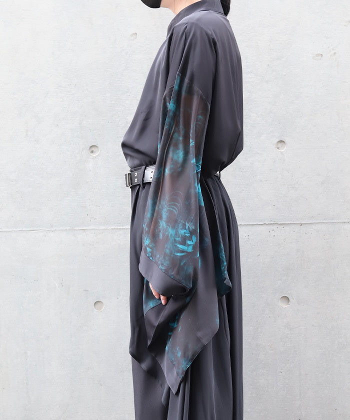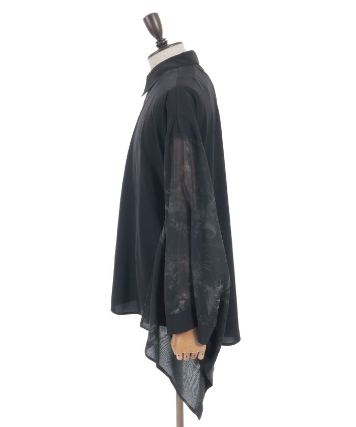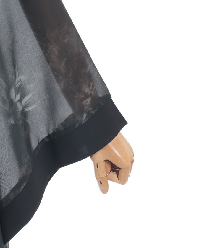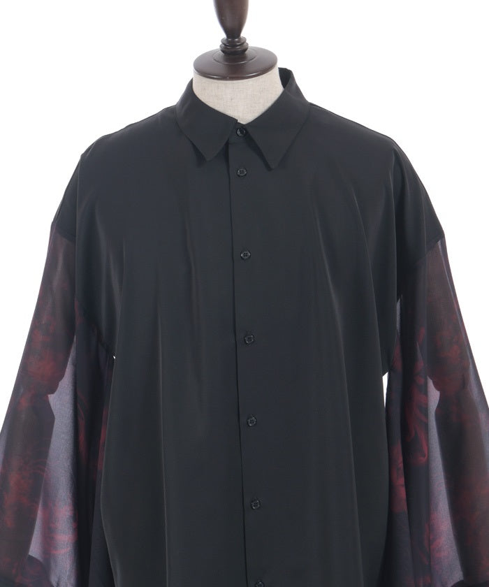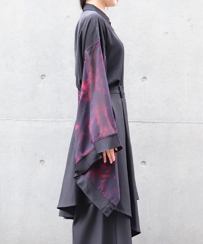 Sheer fabric is used for the sleeve portion, creating a sense of transparency.