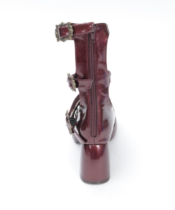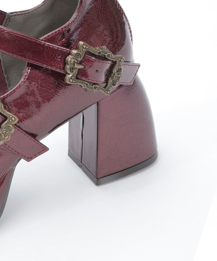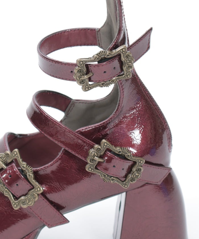 A pair of pumps featuring four classical buckles. The black version features a matte synthetic leather finish with antique silver buckles, while the wine version features a crinkled patent leather finish with fine pearlescent glitter and antique gold buckles. The back zippers make them easy to put on and take off. The strap lengths are adjustable.