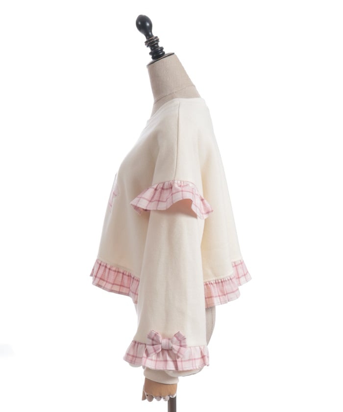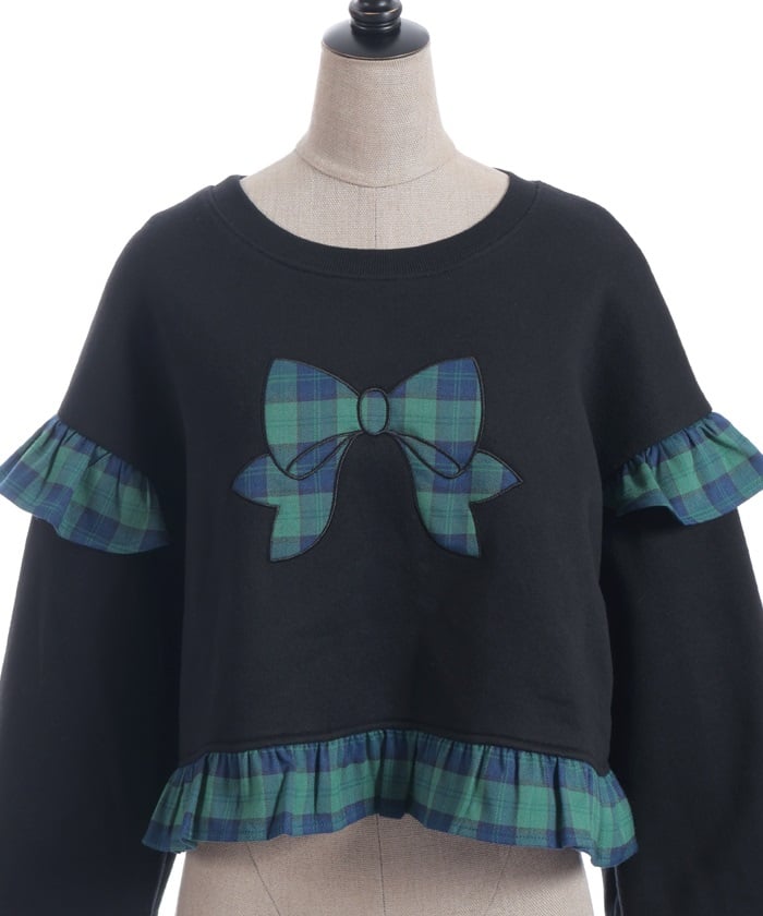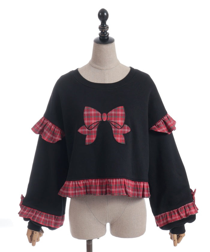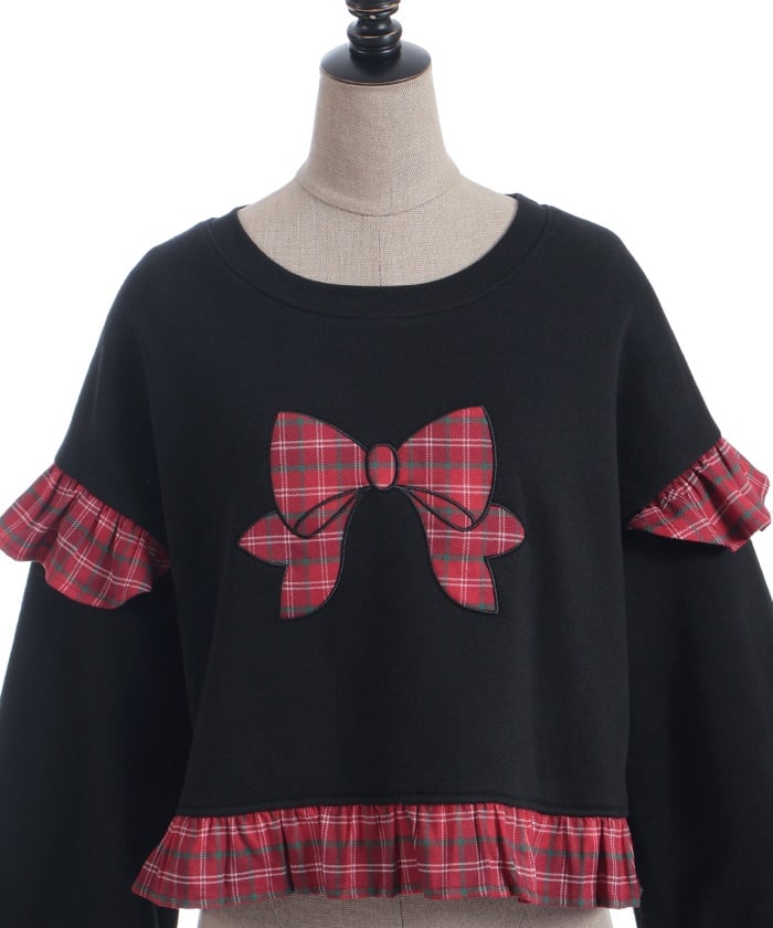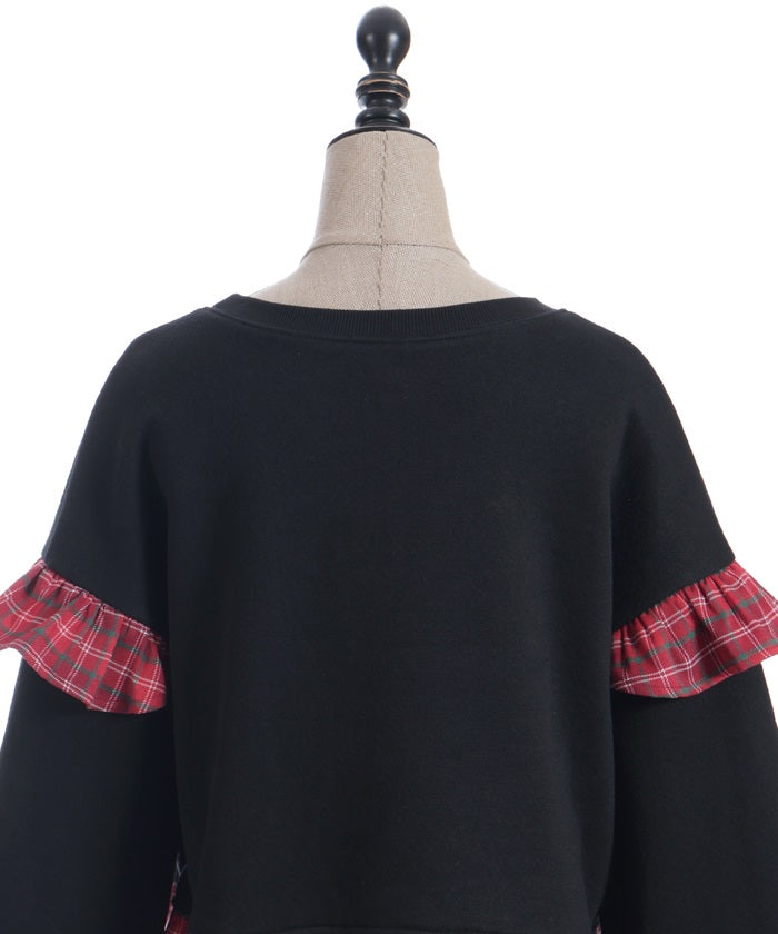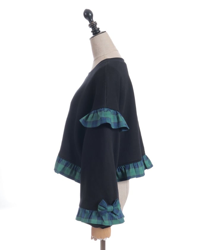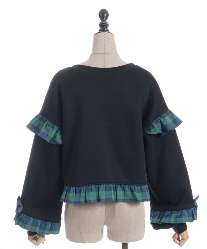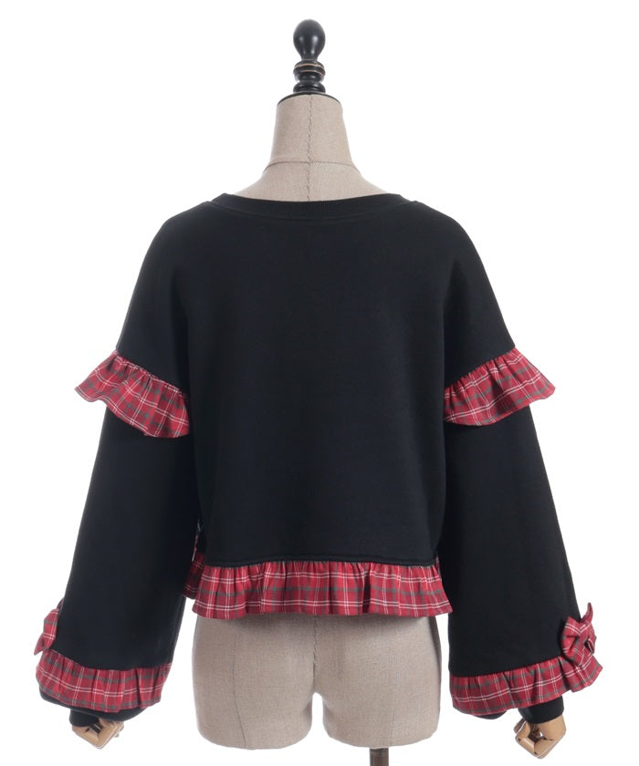 A short-length pullover featuring original tartan fabric frills on the sleeves and hem, along with a ribbon patch.