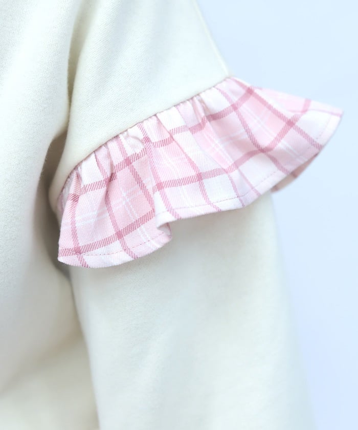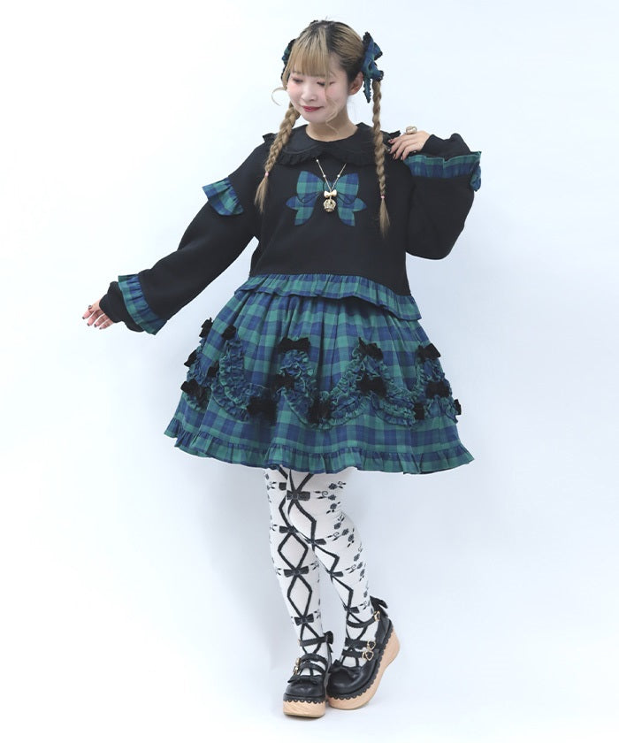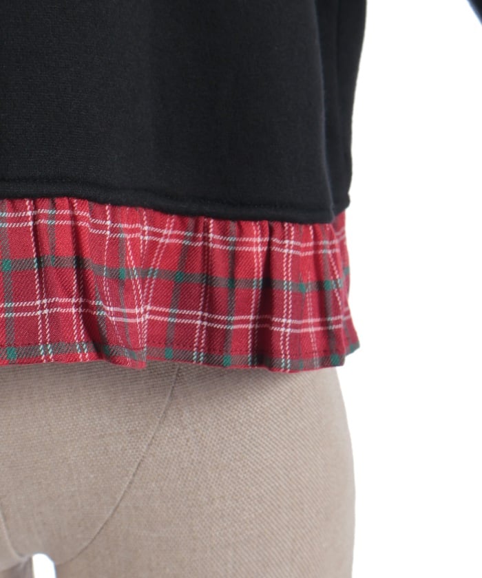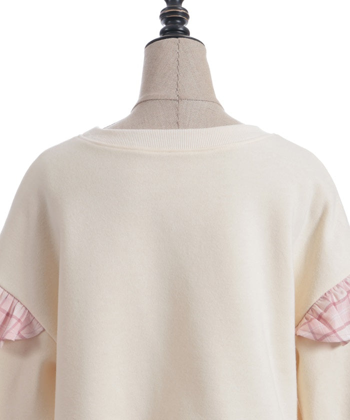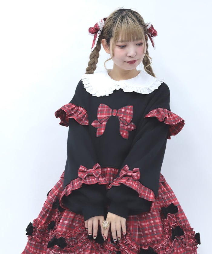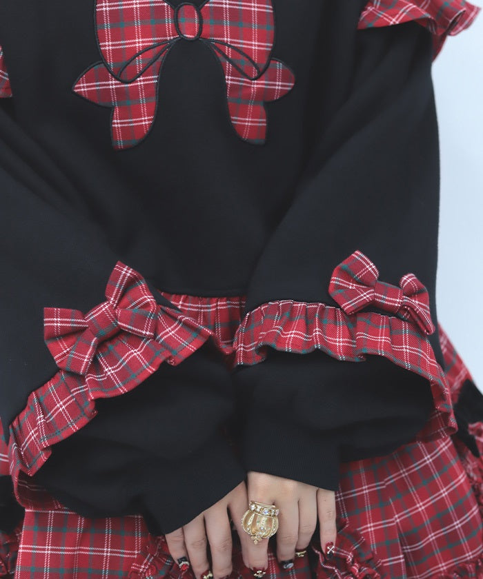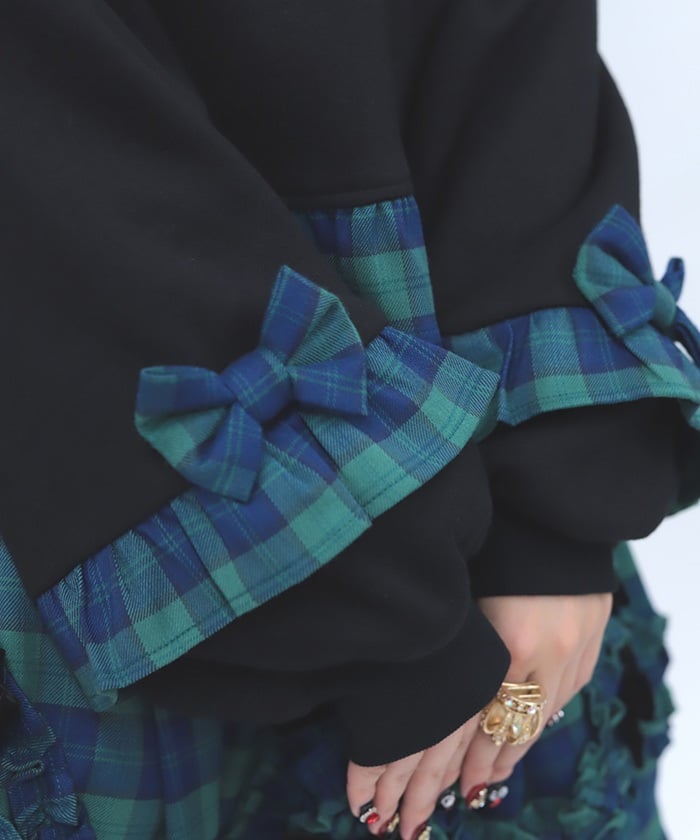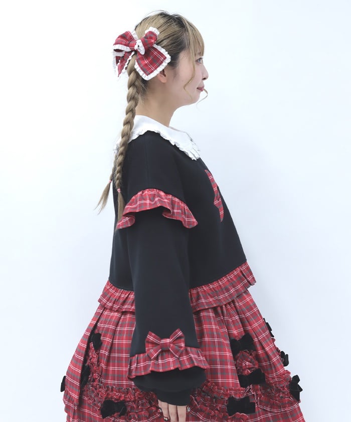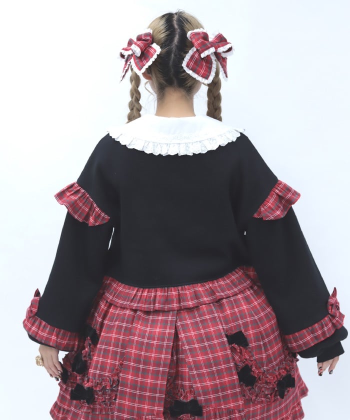 A short-length pullover featuring original tartan fabric frills on the sleeves and hem, along with a ribbon patch.