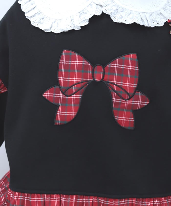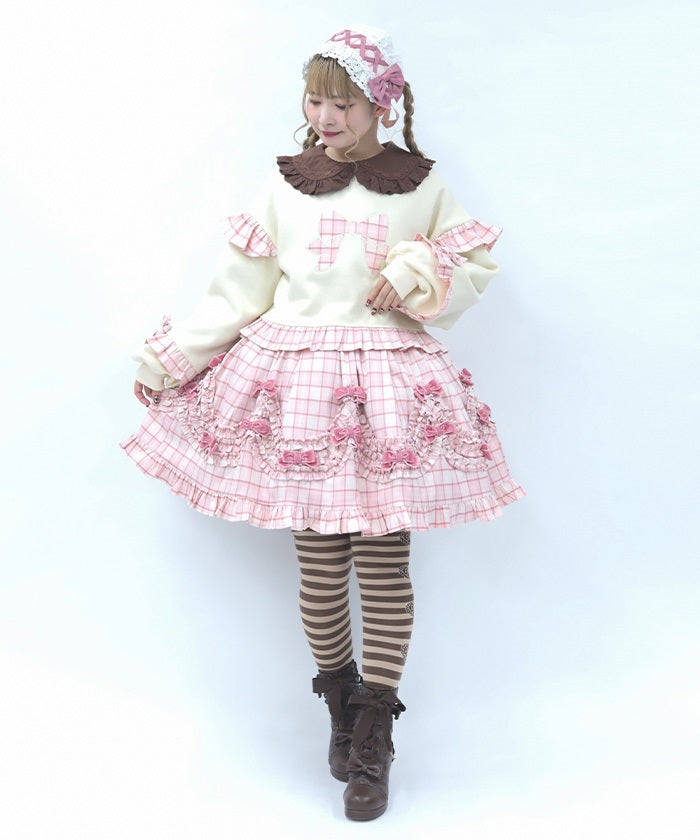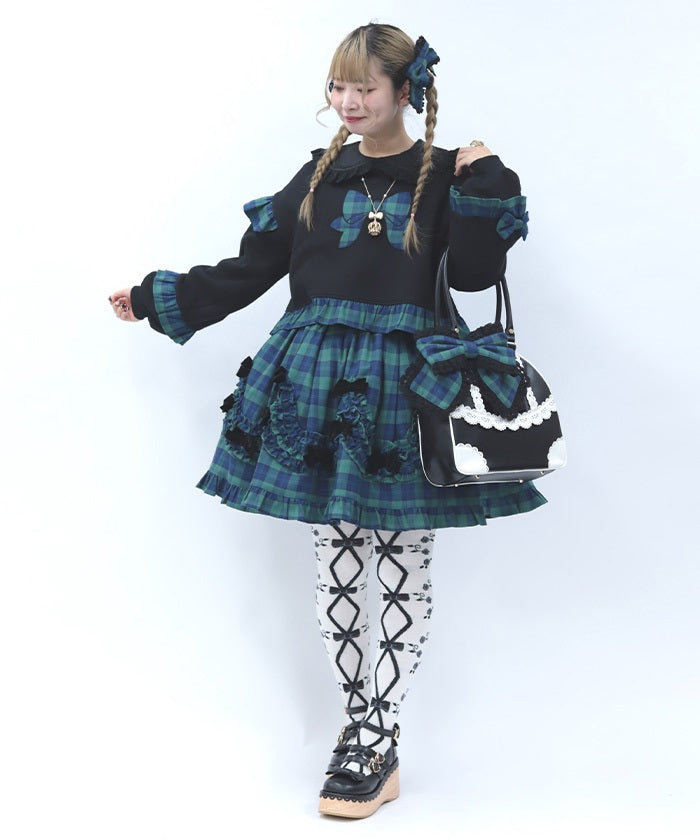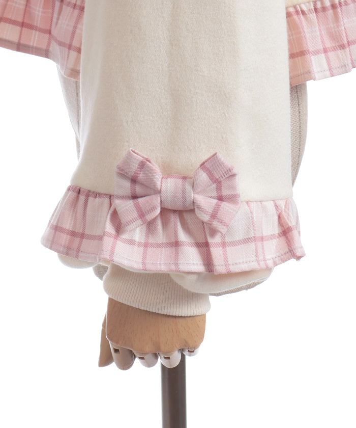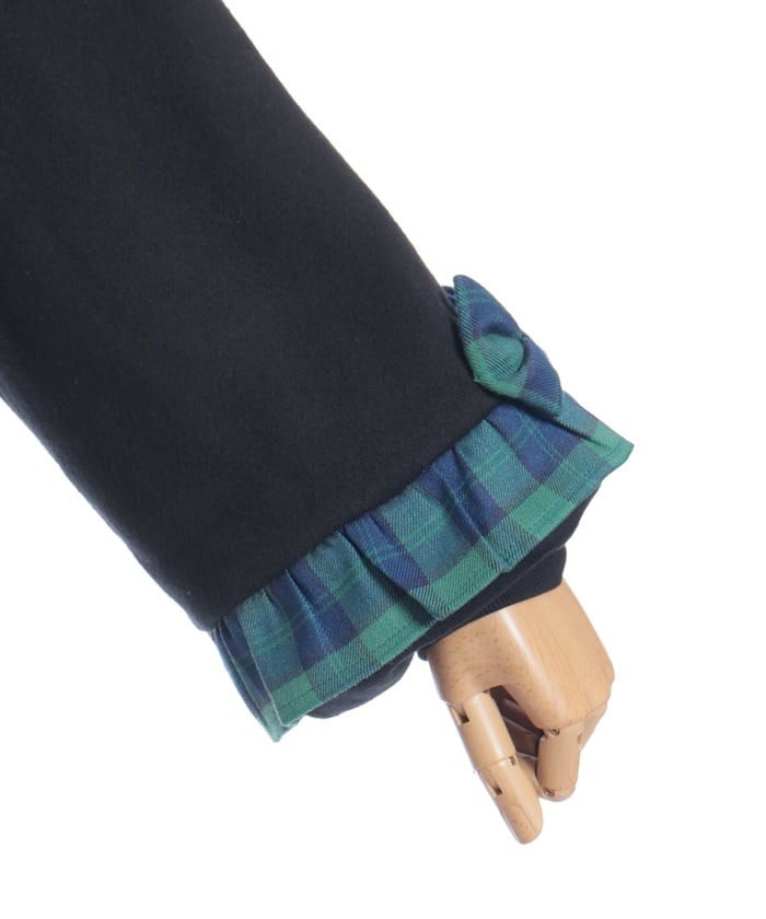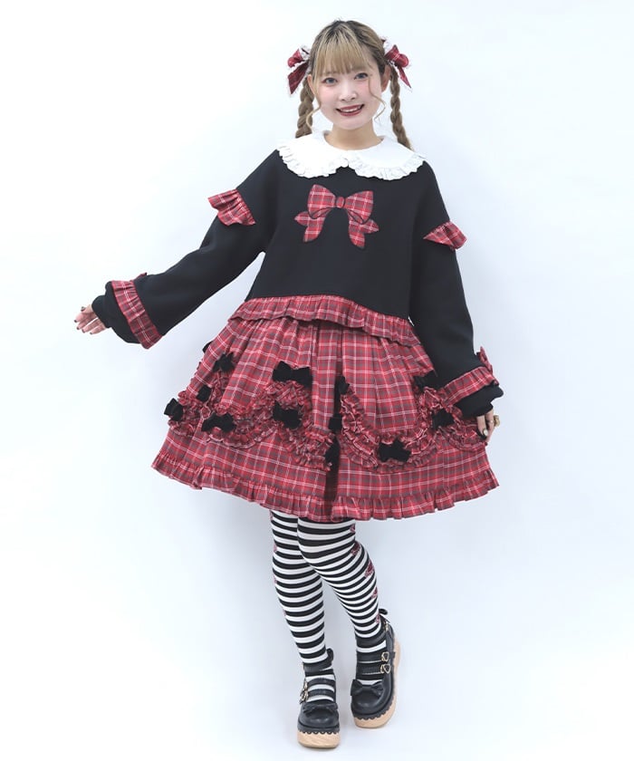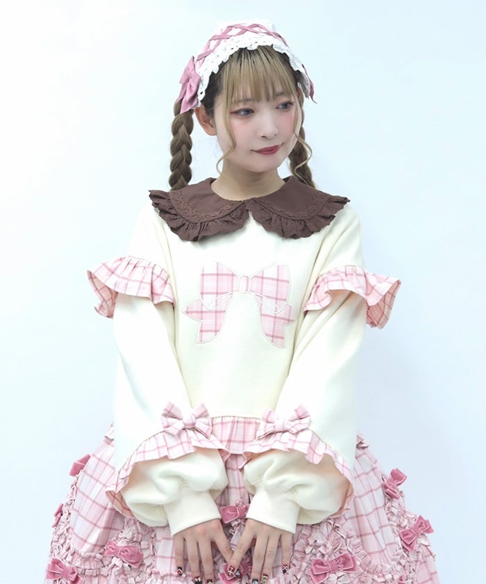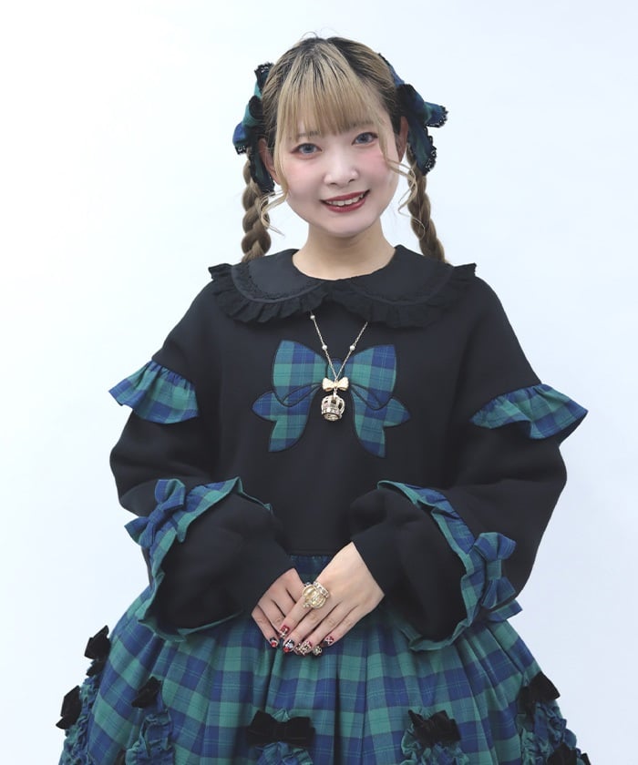 A short-length pullover featuring original tartan fabric frills on the sleeves and hem, along with a ribbon patch.