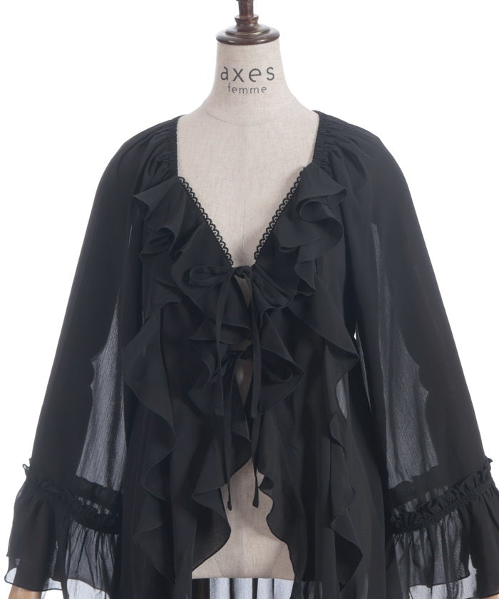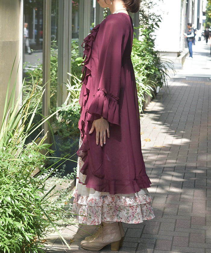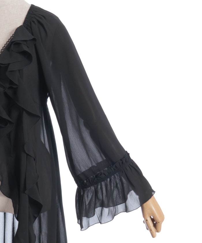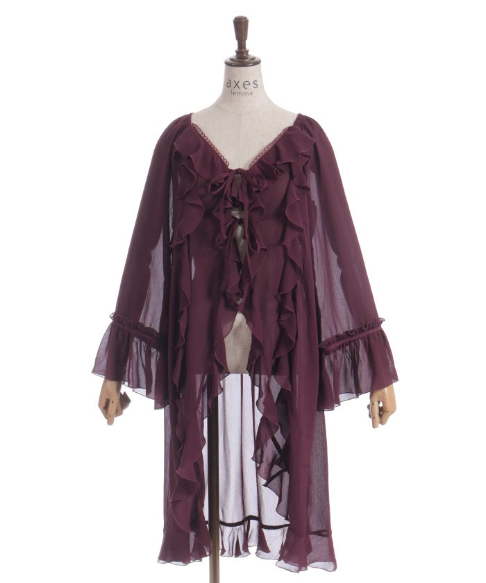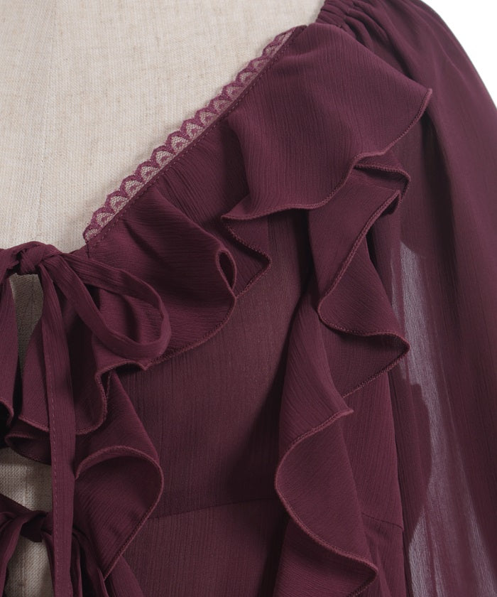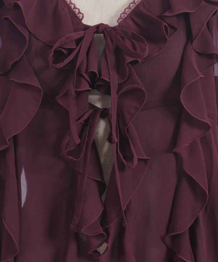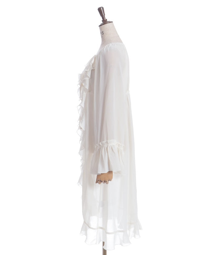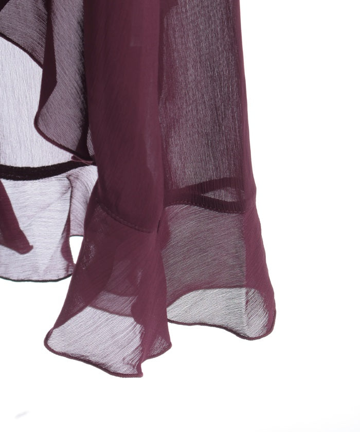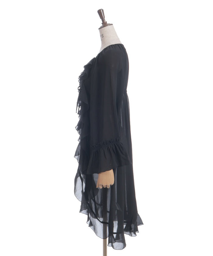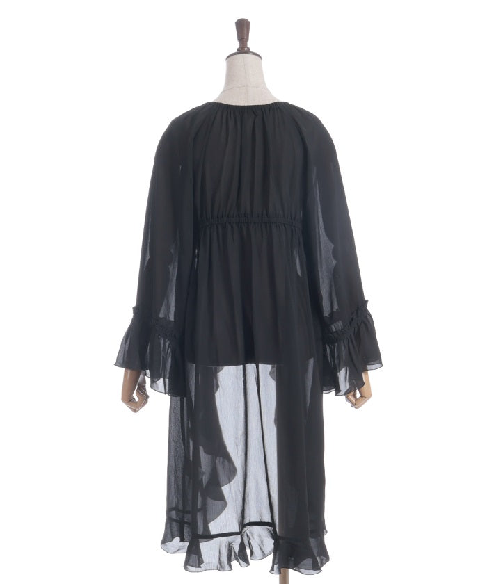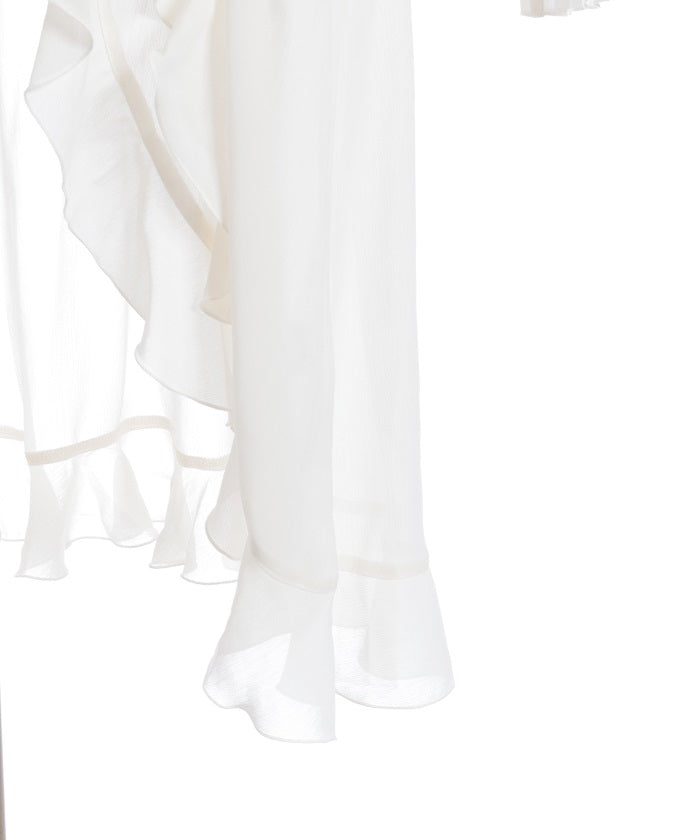 A chiffon gown with a gorgeous lightweight look and flowing ruffle frills. Simply throw this on for an elegant look. The classy sheer fabric can be worn all the way to autumn.