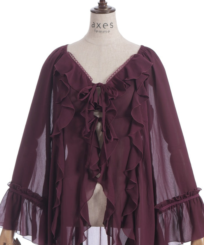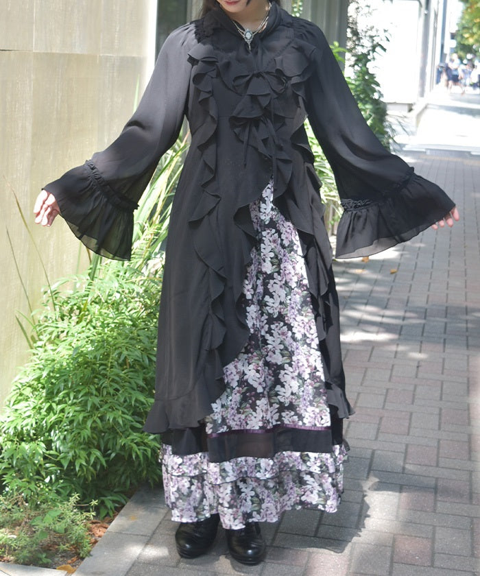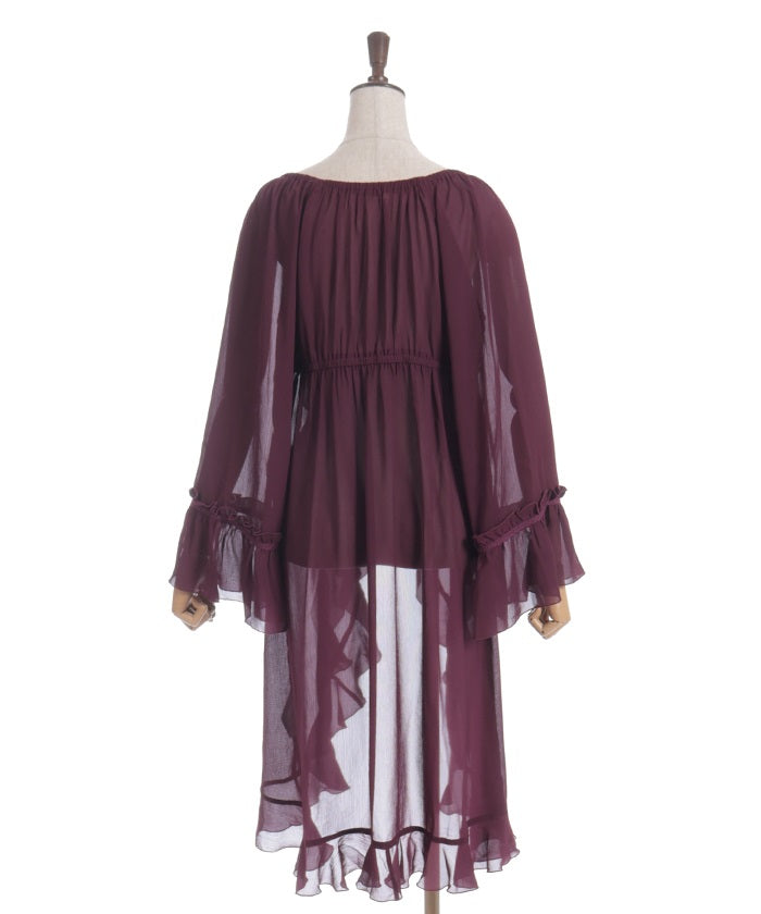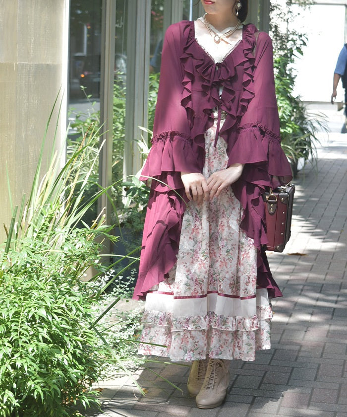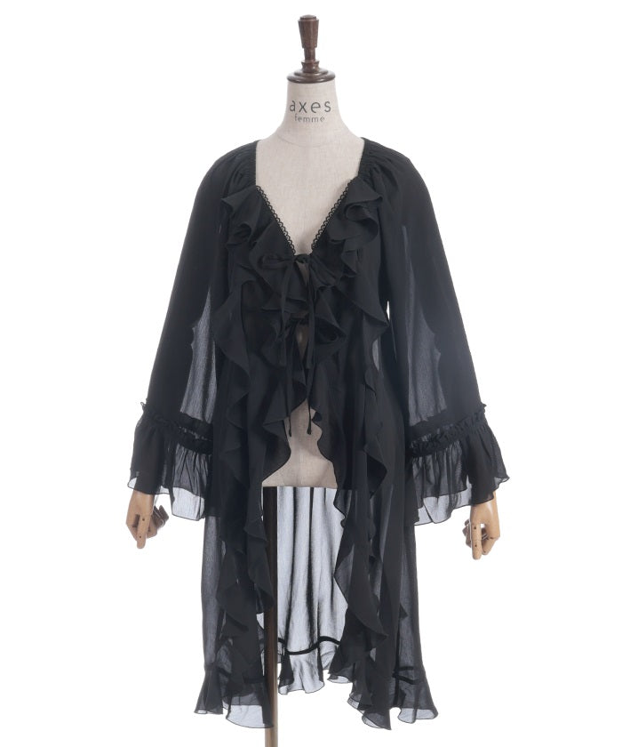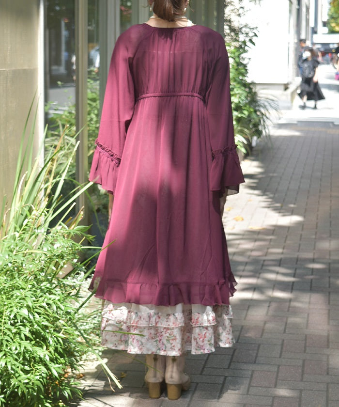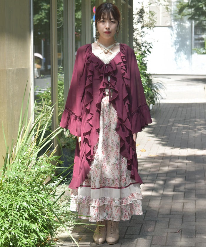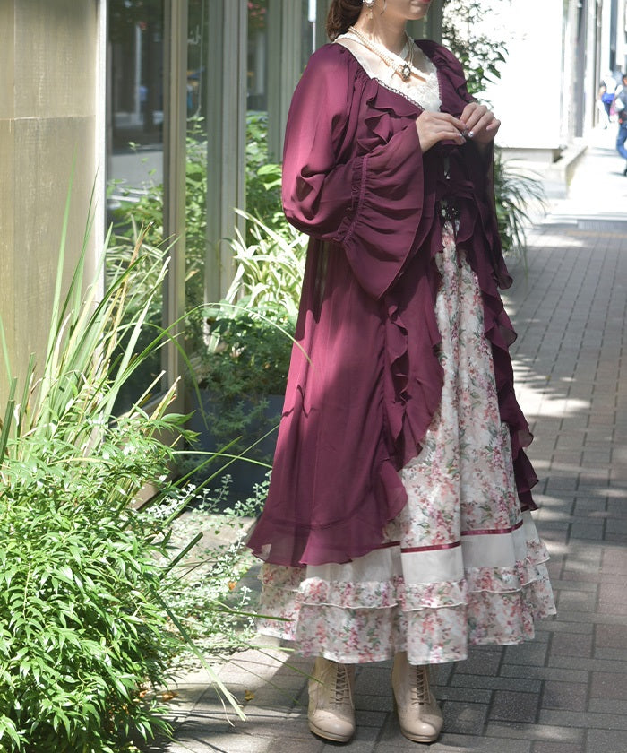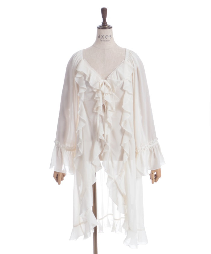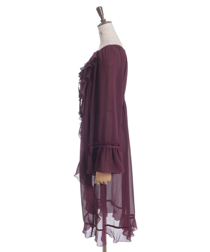 A chiffon gown with a gorgeous lightweight look and flowing ruffle frills. Simply throw this on for an elegant look. The classy sheer fabric can be worn all the way to autumn.