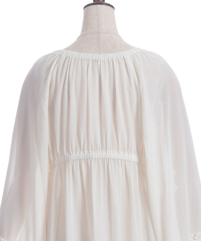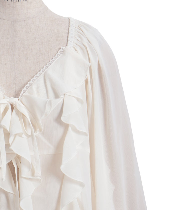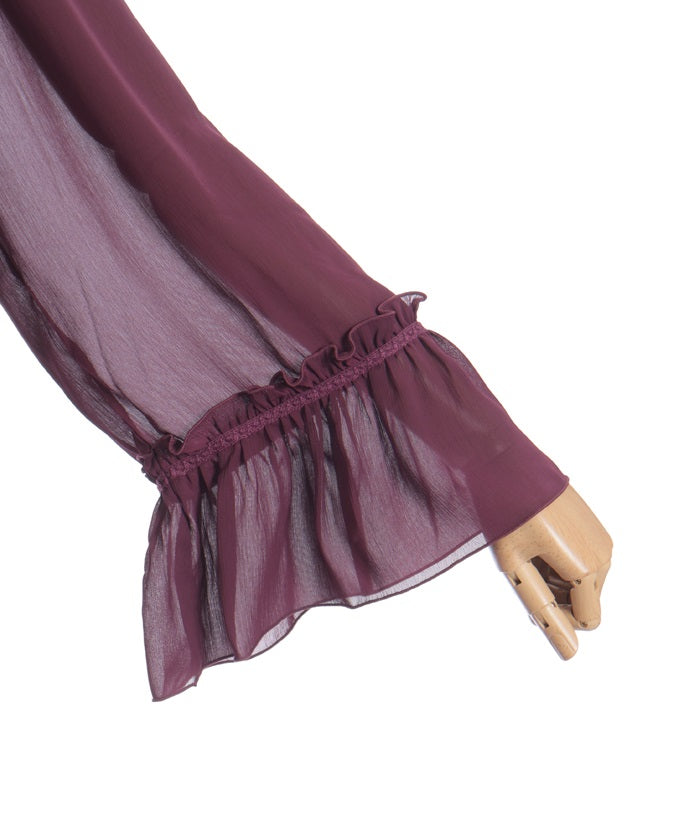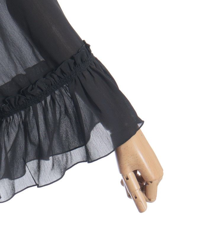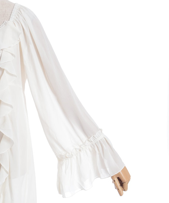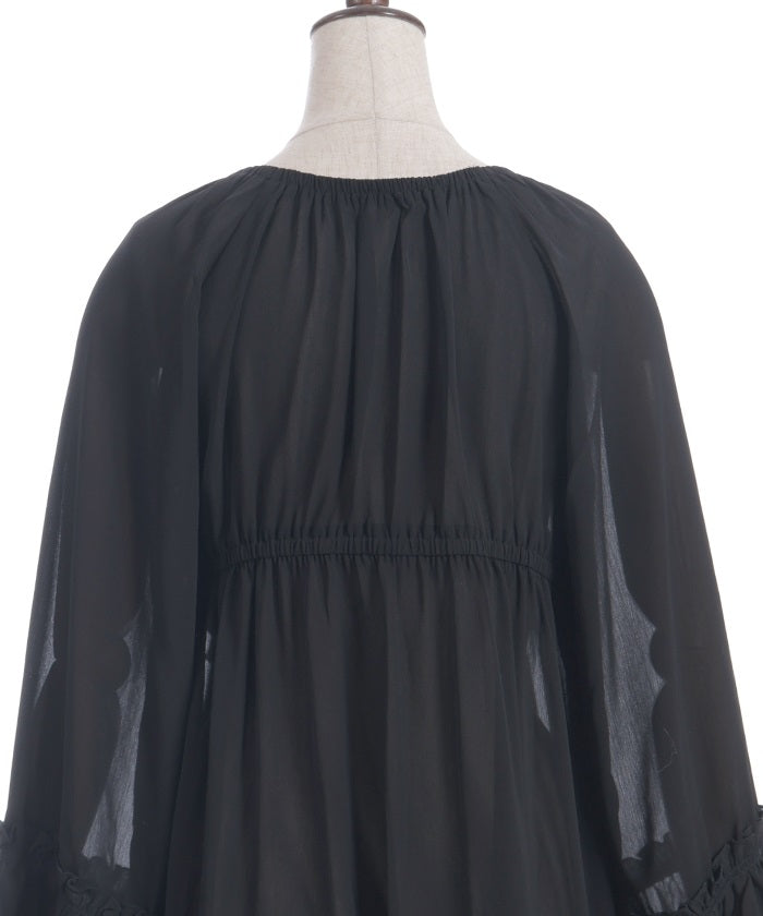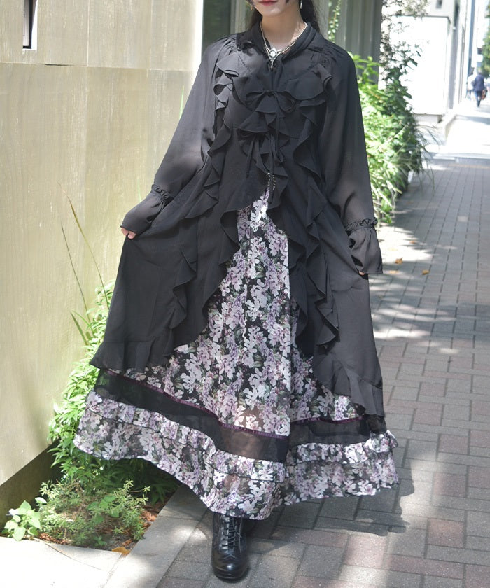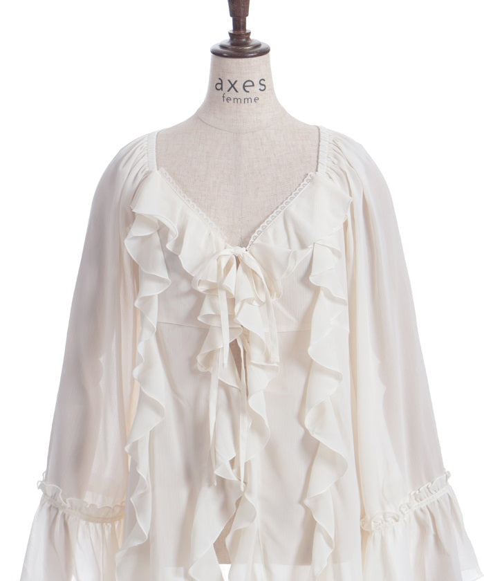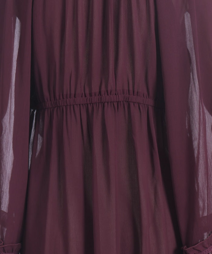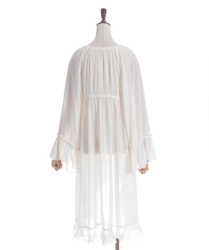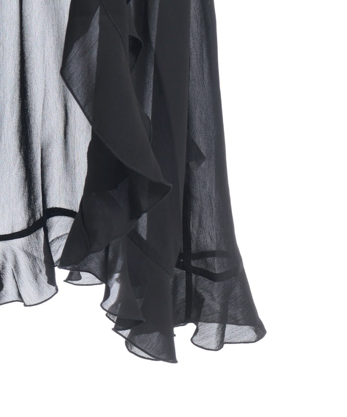 A chiffon gown with a gorgeous lightweight look and flowing ruffle frills. Simply throw this on for an elegant look. The classy sheer fabric can be worn all the way to autumn.