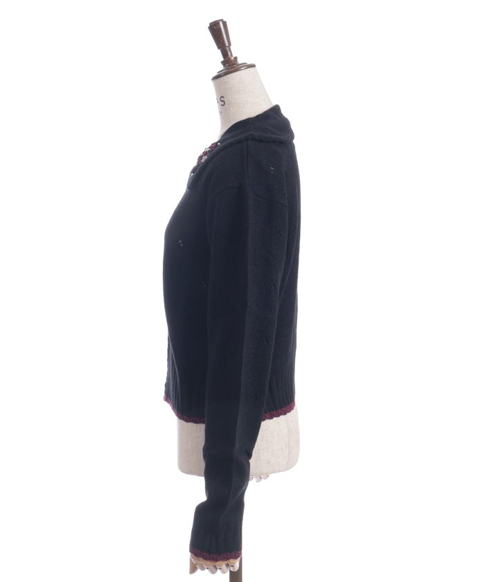 This knit cardigan features a gorgeous collar featuring ribbon-embroidered flowers and satin-wrapped roses.