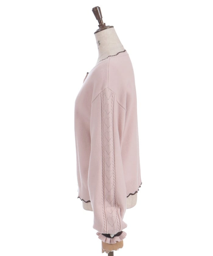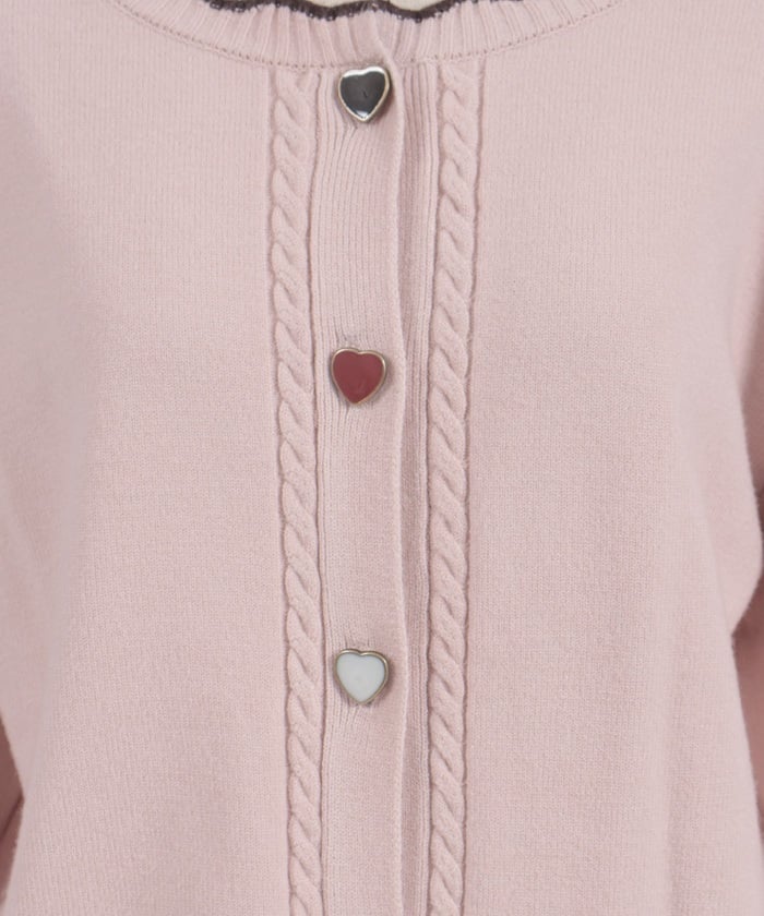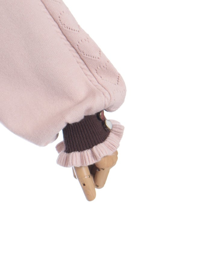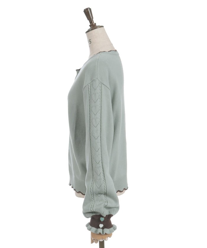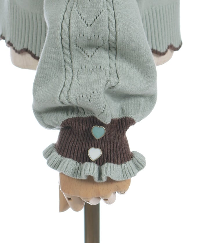 It uses the same threads and buttons as our Heart Button Bicolor Knit Pullover, so it can be layered like an ensemble.