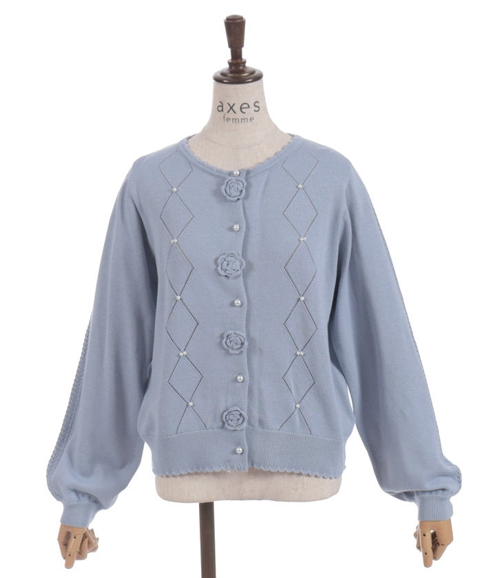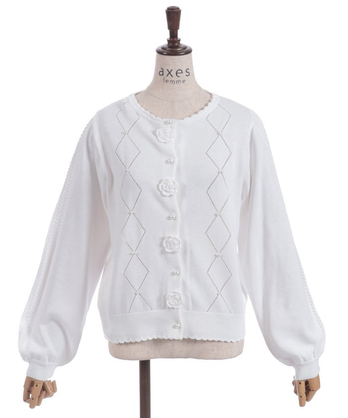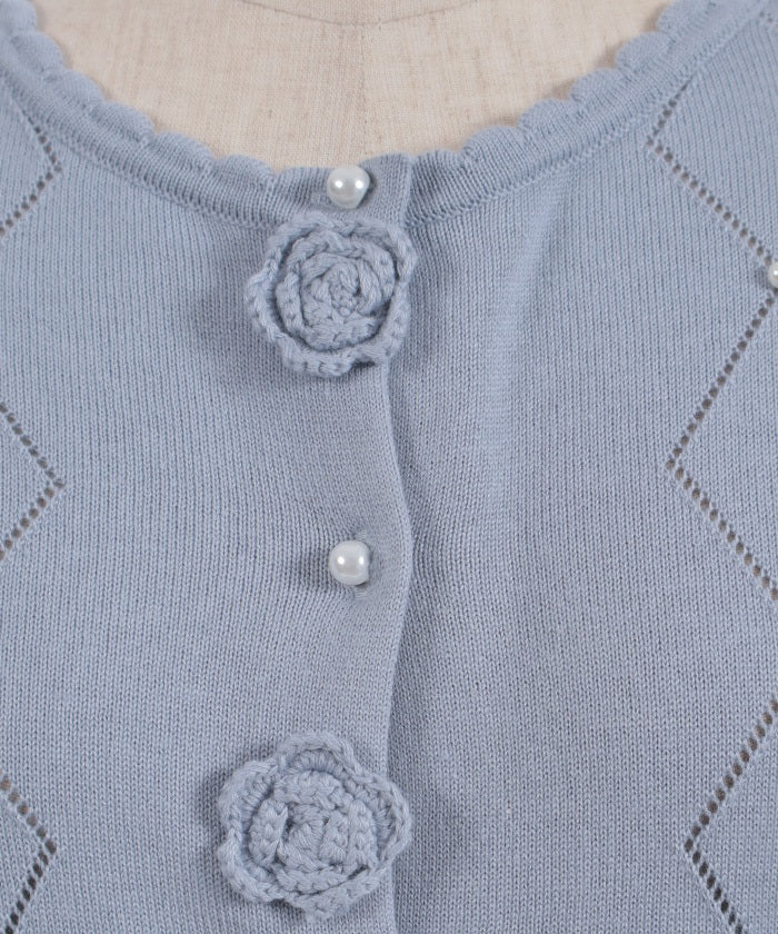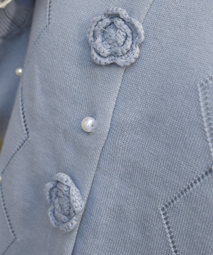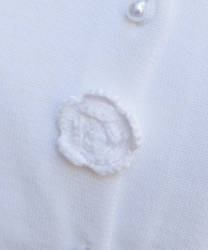 The gorgeous design features three-dimensional crocheted roses on the placket, alternating with pearl buttons.