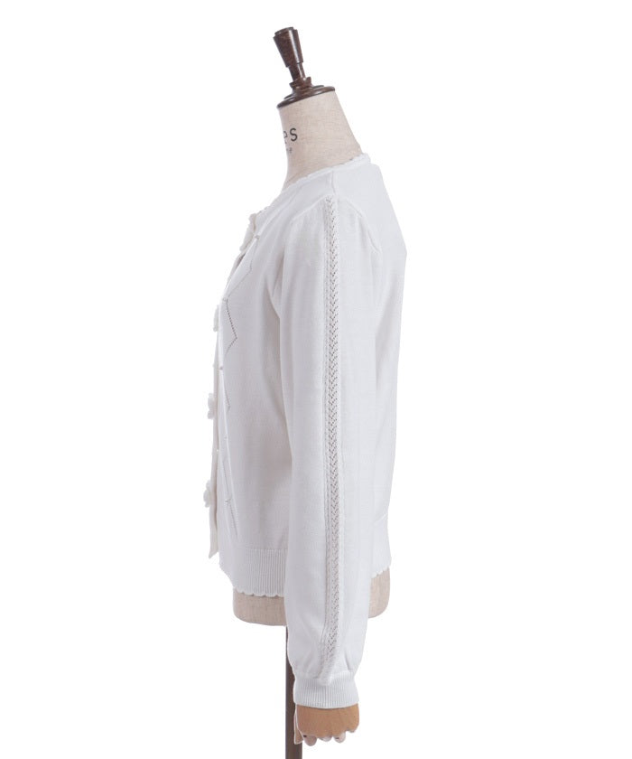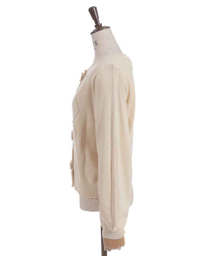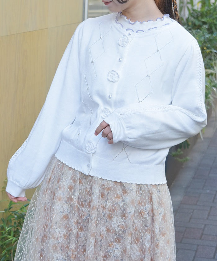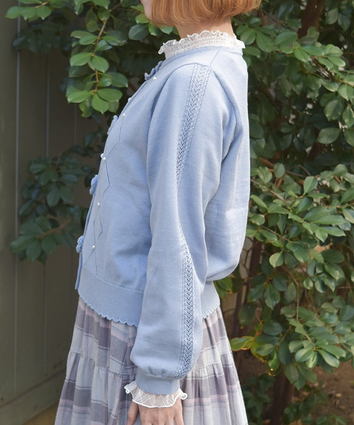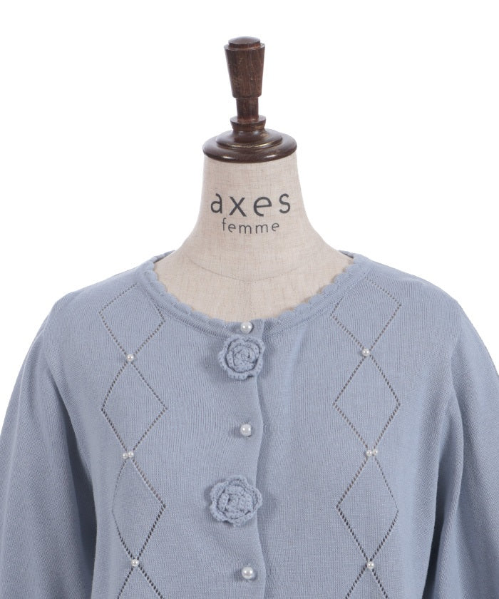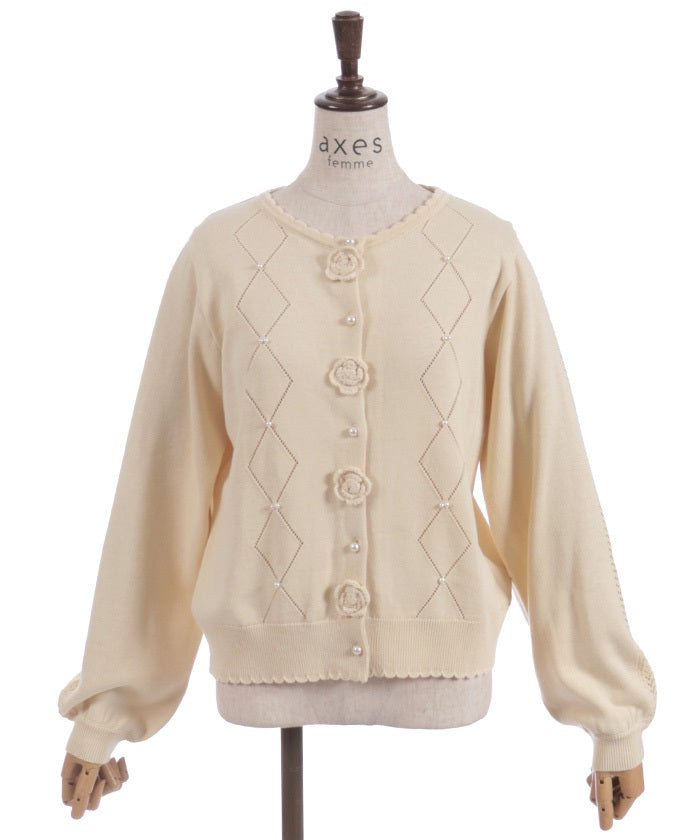 The gorgeous design features three-dimensional crocheted roses on the placket, alternating with pearl buttons.