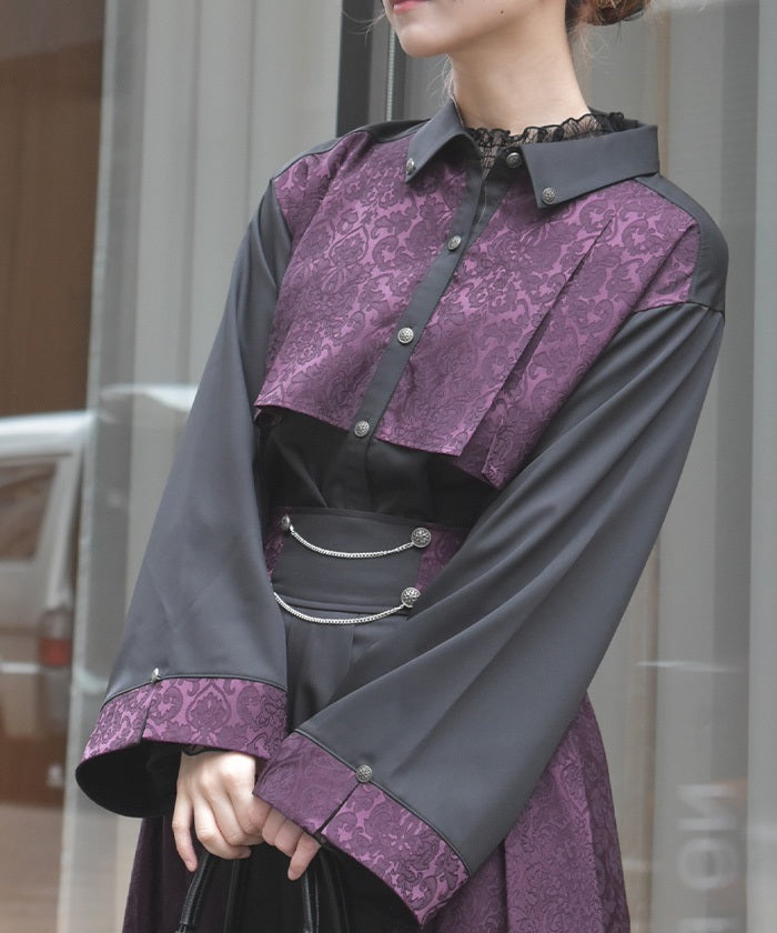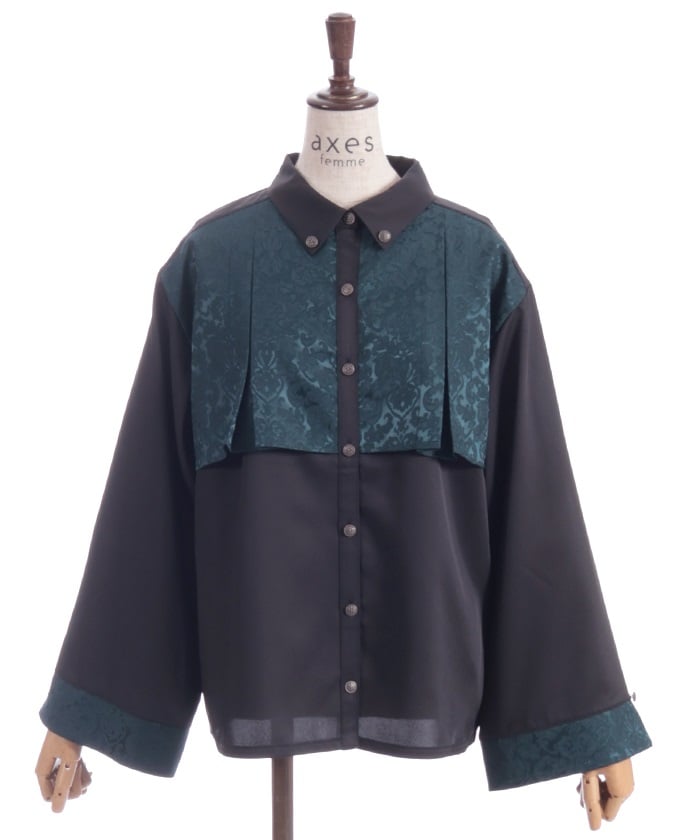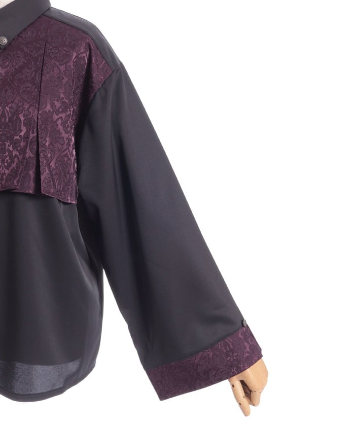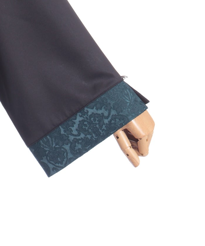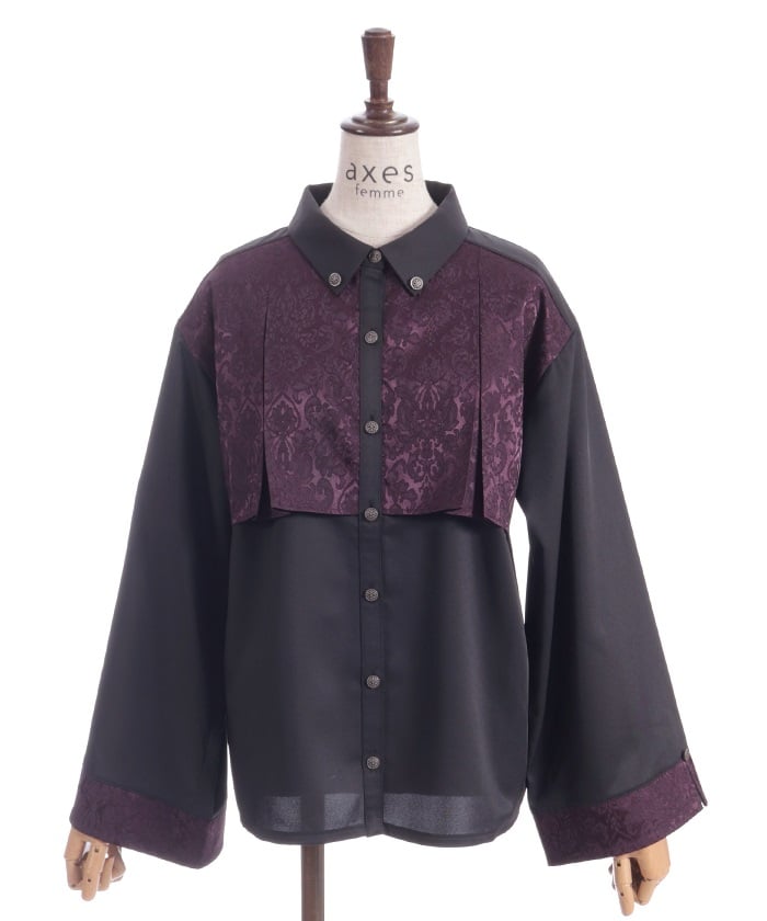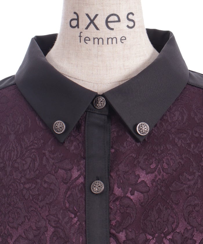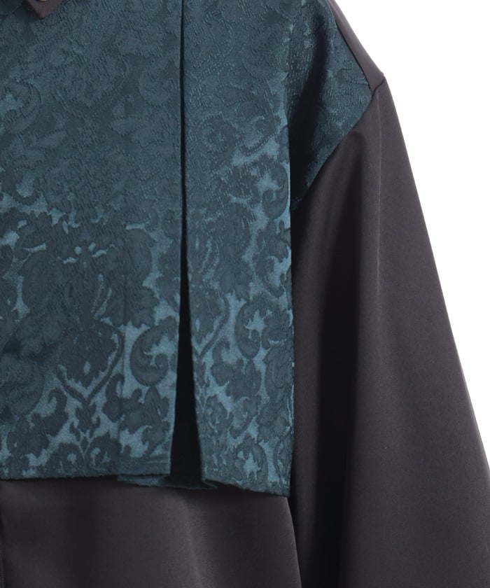 A bicolor blouse that pairs elegant jacquard with solid-colored fabric. The luxurious woven pattern is eye-catching, creating a classic, high-fashion look.
