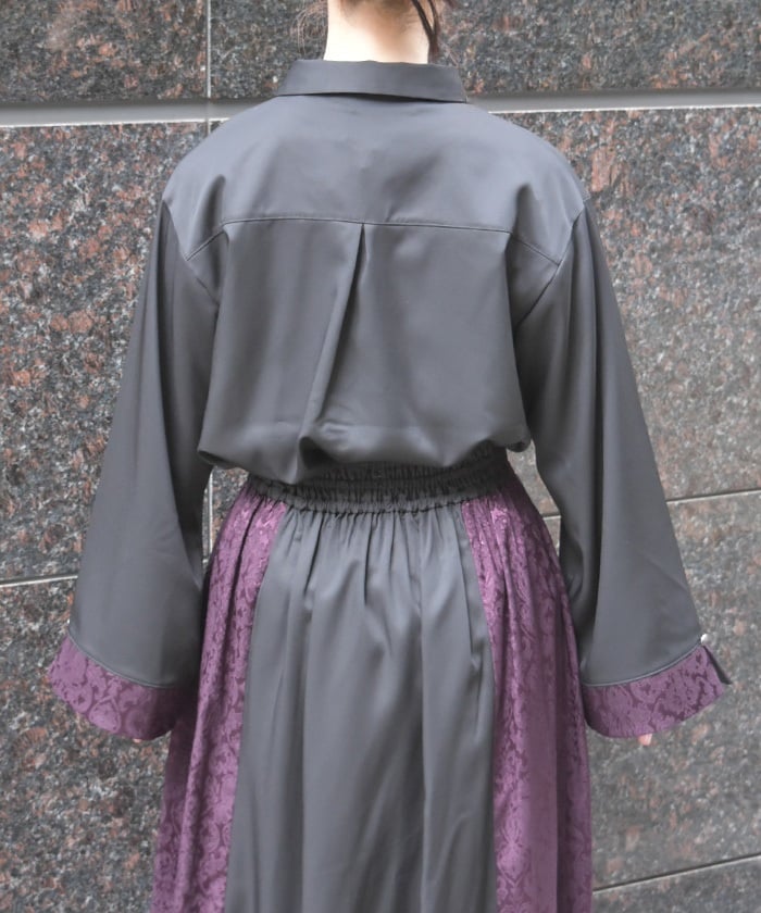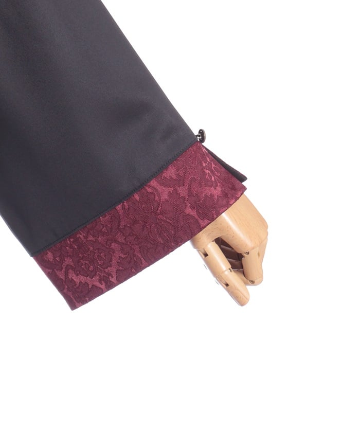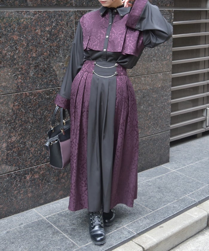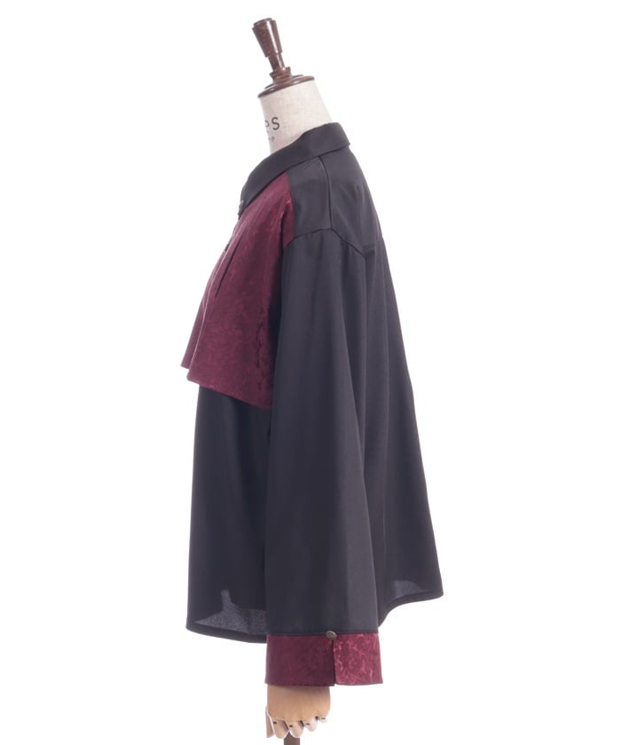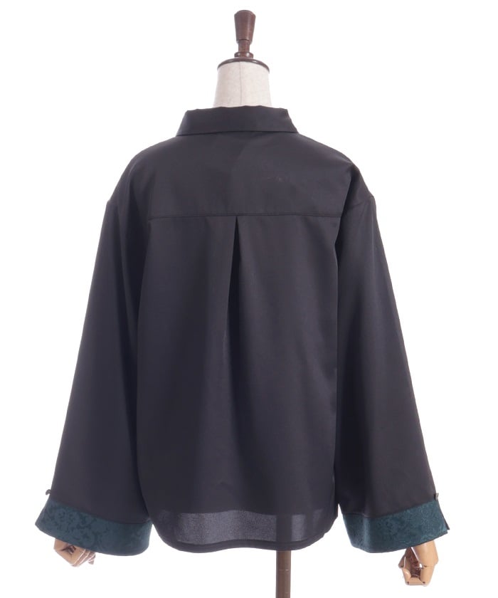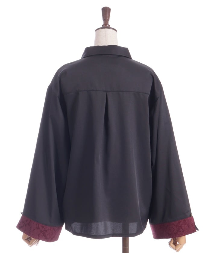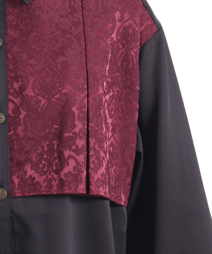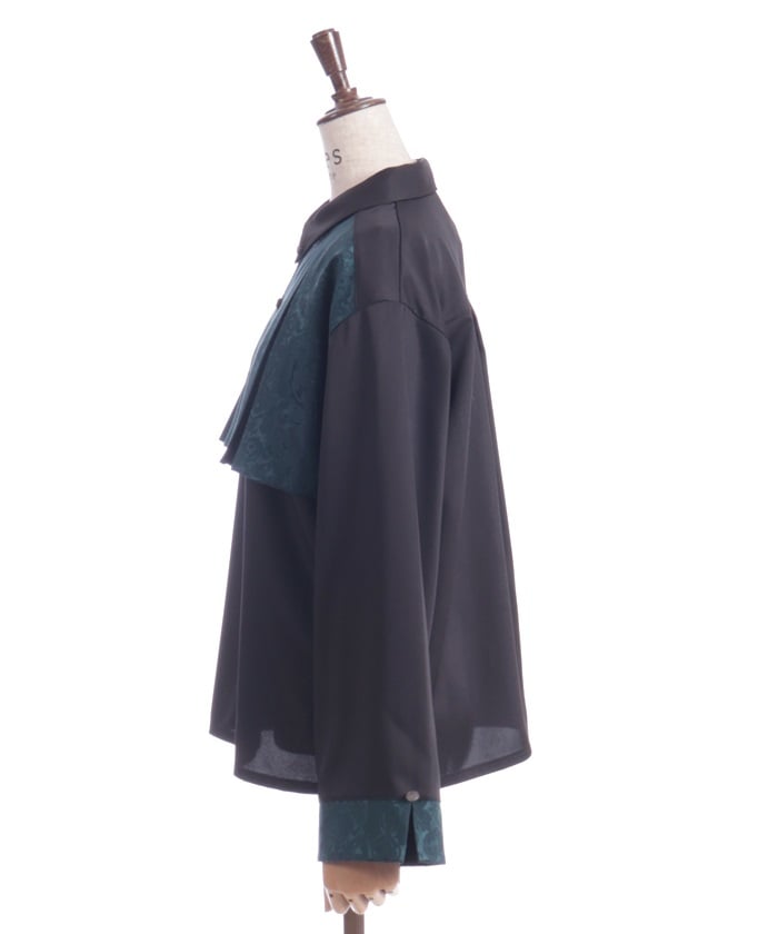 A bicolor blouse that pairs elegant jacquard with solid-colored fabric. The luxurious woven pattern is eye-catching, creating a classic, high-fashion look.