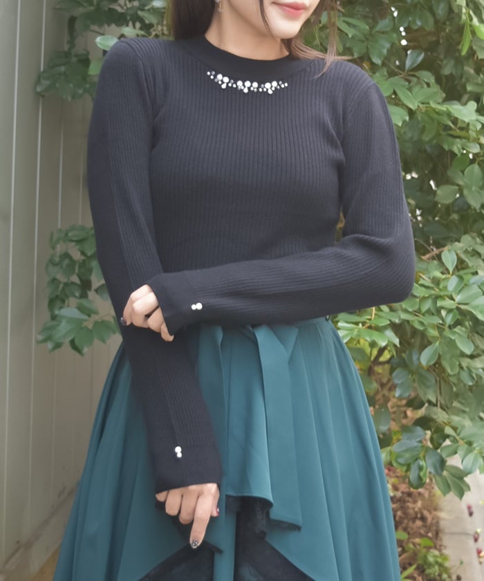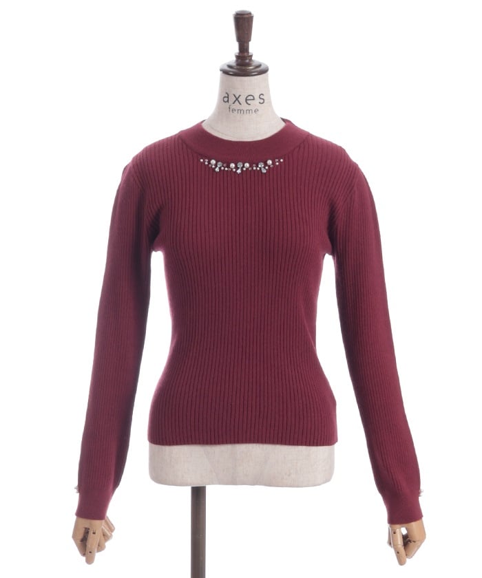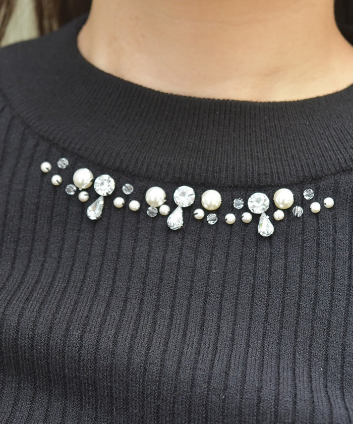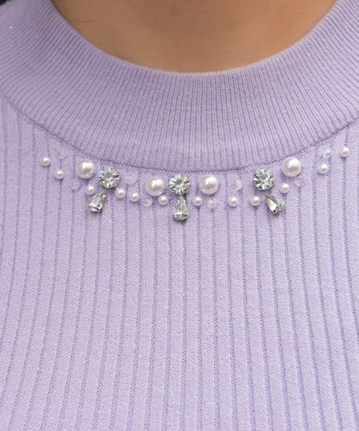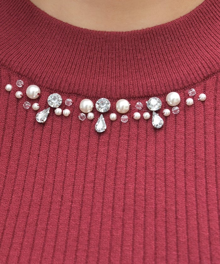 This knit pullover features sparkling claw-shaped jewels and pearls adorning the neck like a necklace.