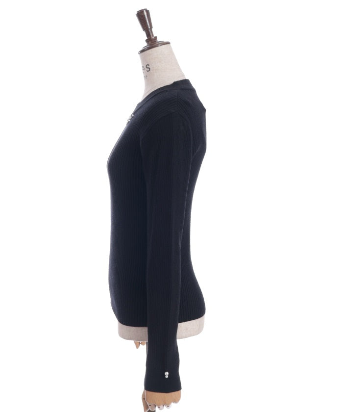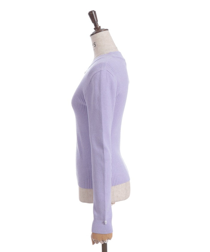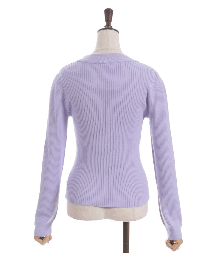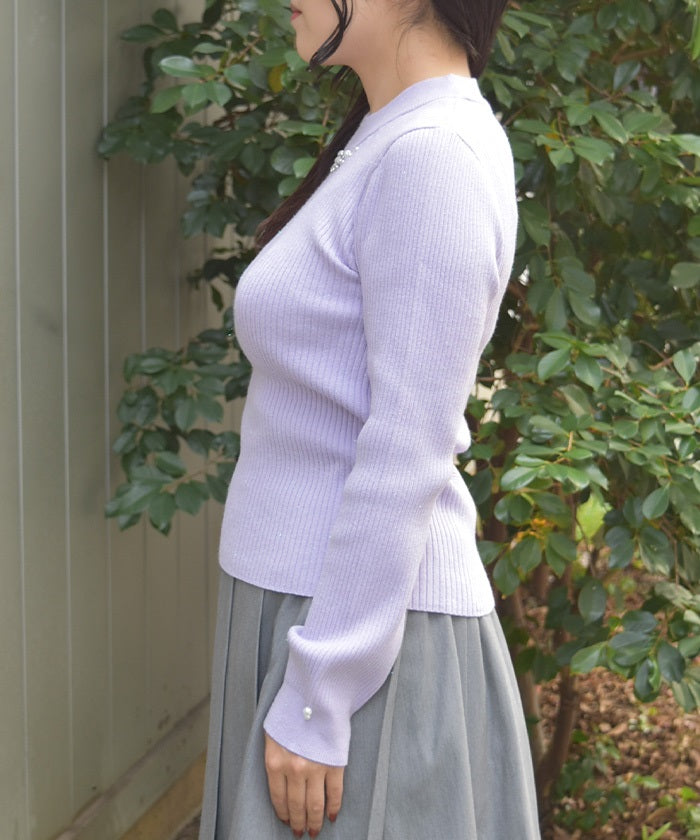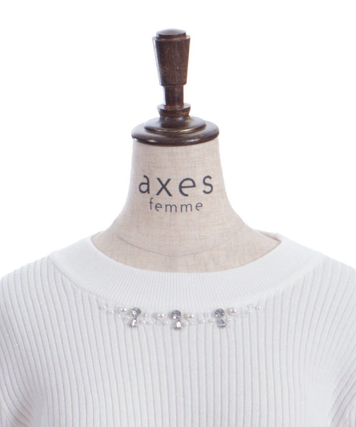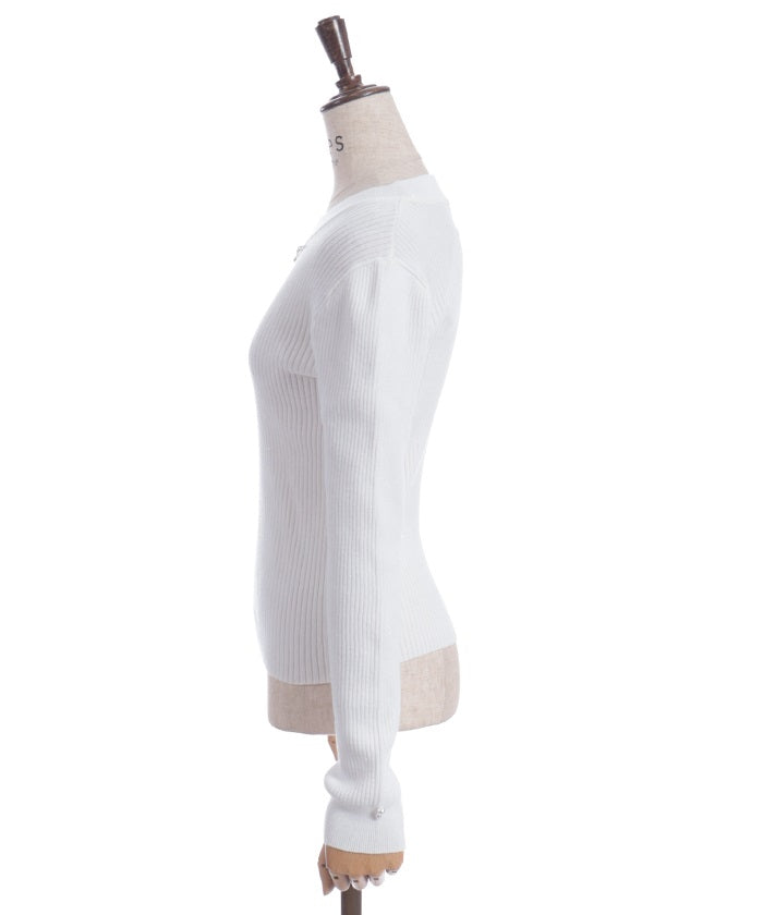 This knit pullover features sparkling claw-shaped jewels and pearls adorning the neck like a necklace.