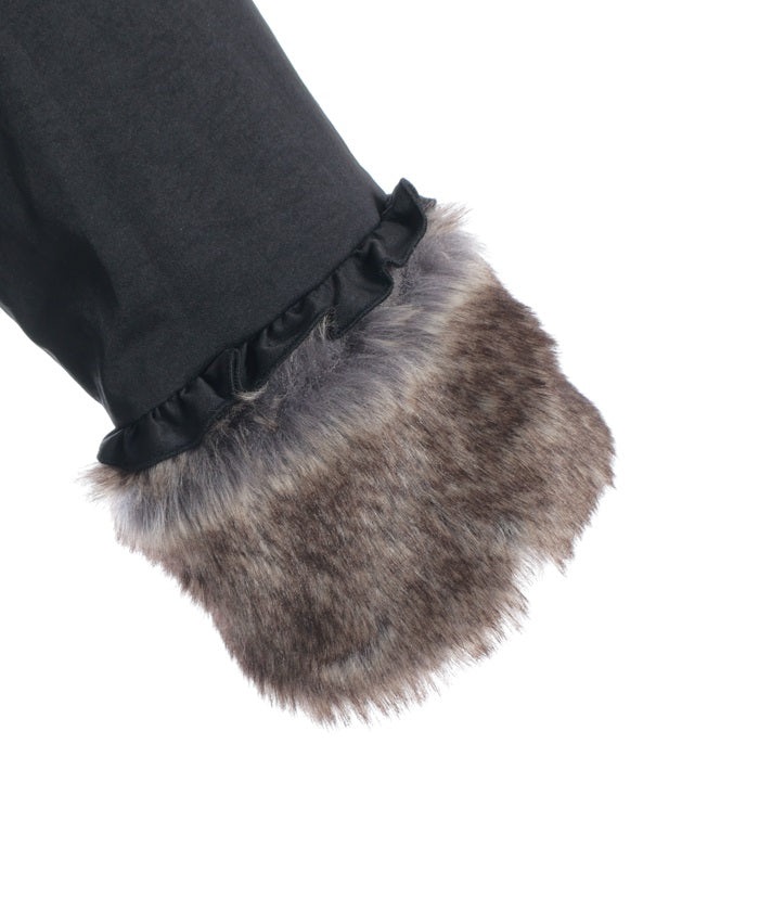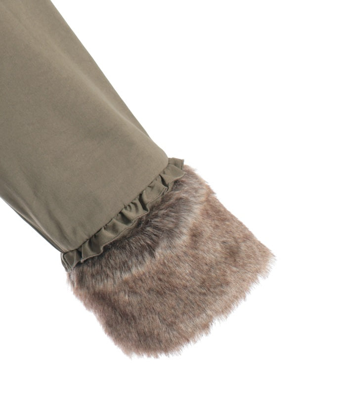 The design, accented with fur, frills, and lace-up detailing, maintains a subdued, sweet tone. It's the perfect outerwear piece for chilly weather.