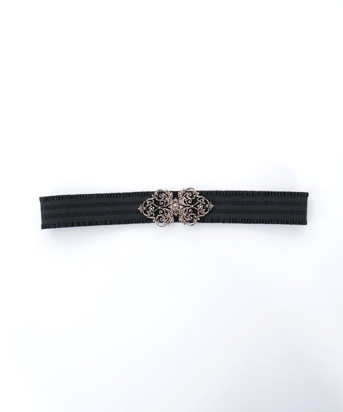 This elastic belt features an ornamental motif featuring delicate floral embellishments.