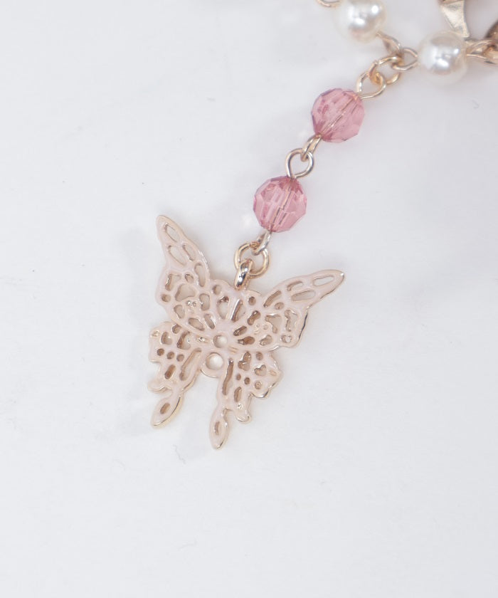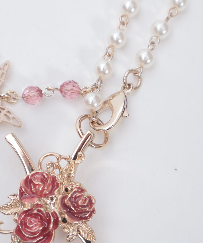 A gorgeous design features a delicate butterfly motif swaying alongside a vibrant rose motif.