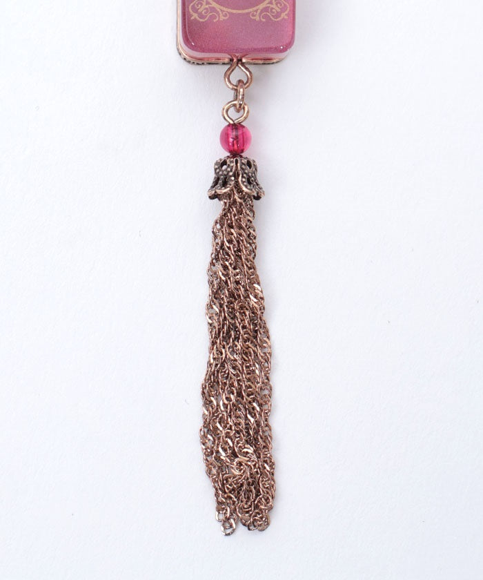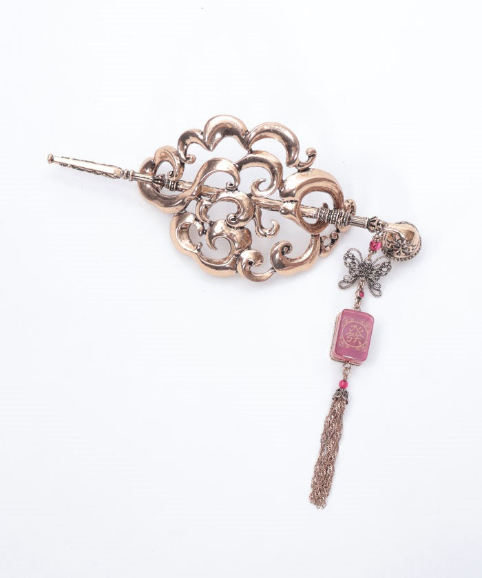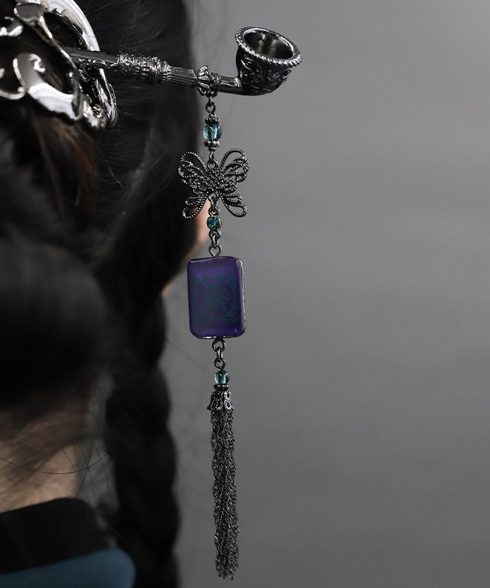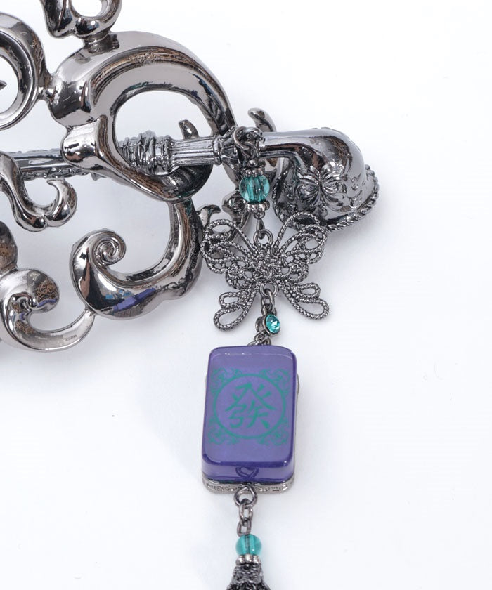 The braided cord-like butterfly parts and chain tassels add an accent.