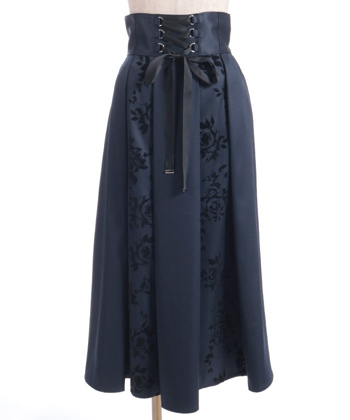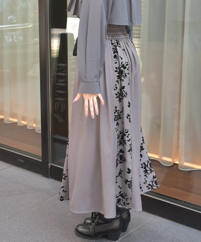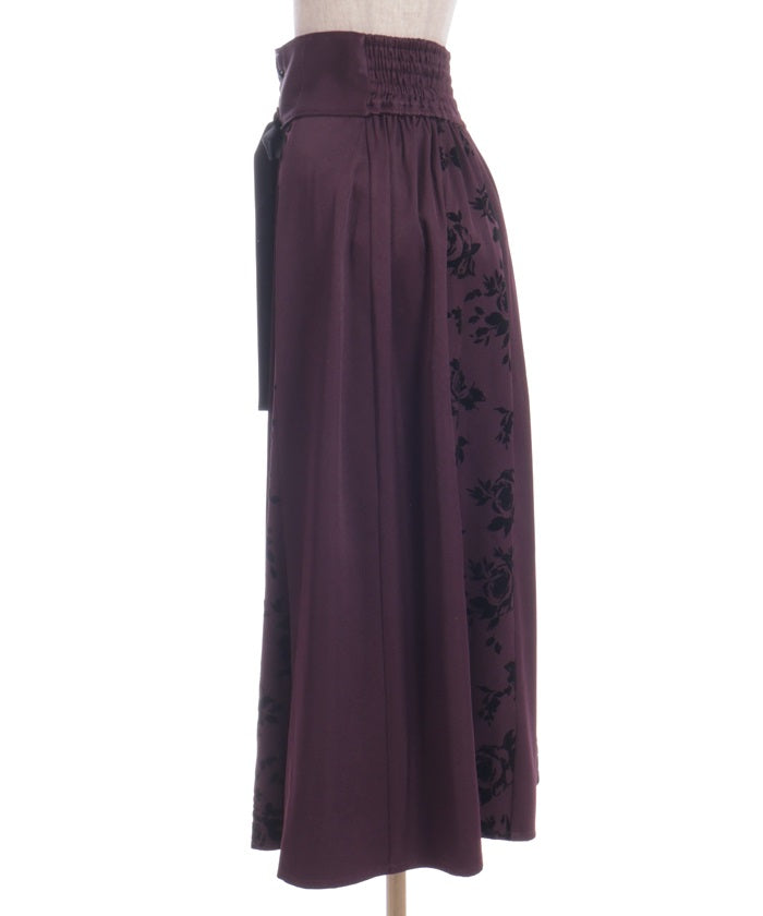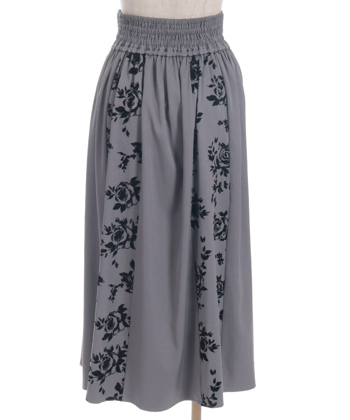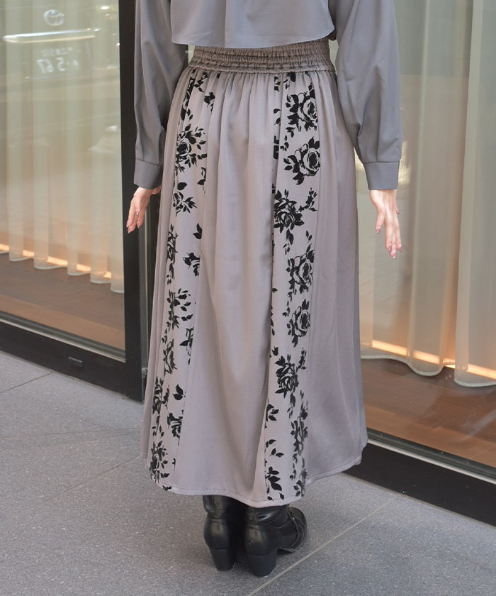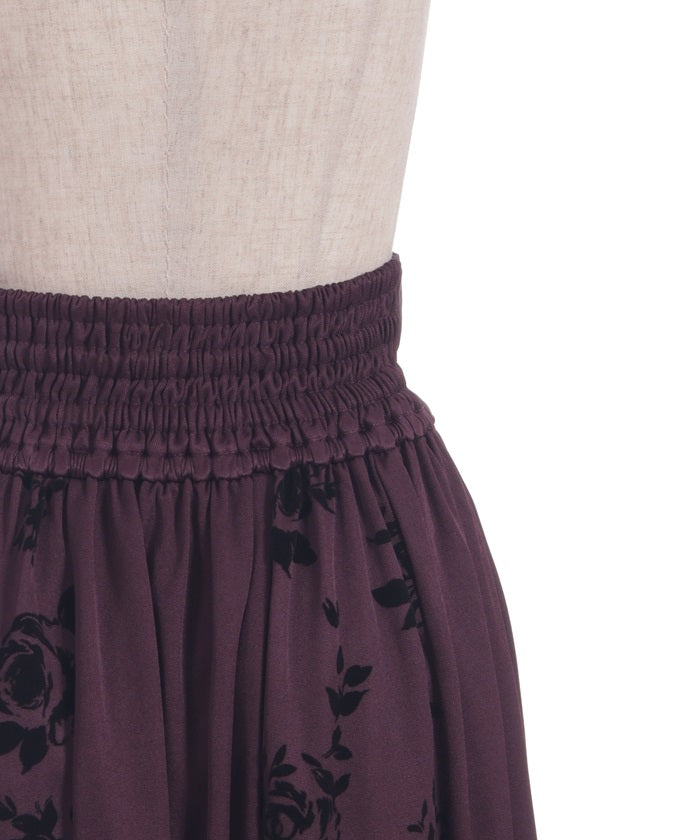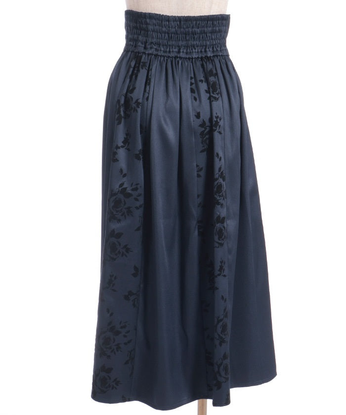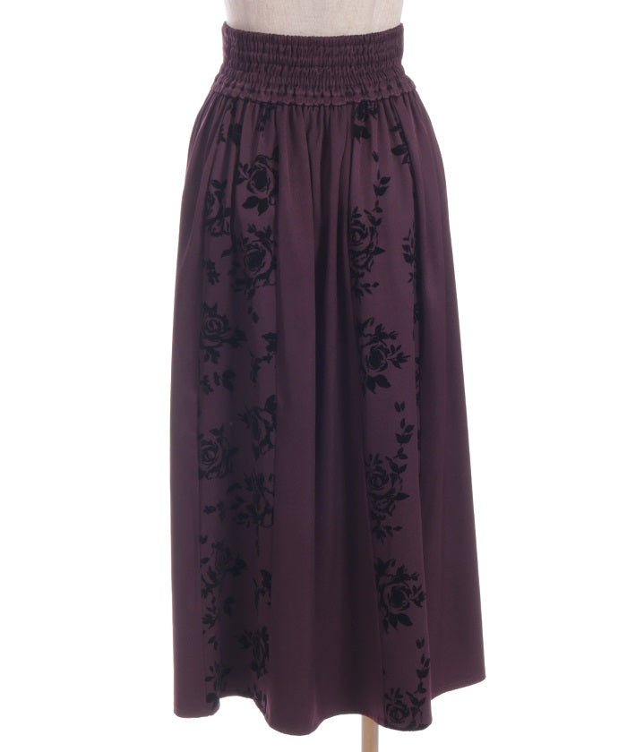 A long skirt combining elegance with a high-fashion look. The elegant rose pattern, expressed through a flocked print, adds a touch of elegance and depth.
