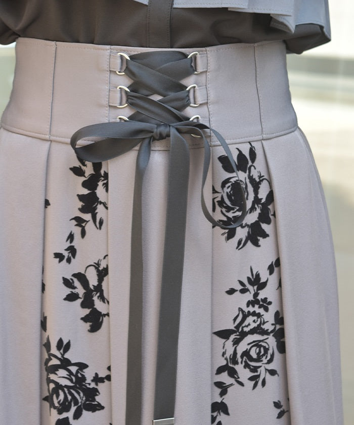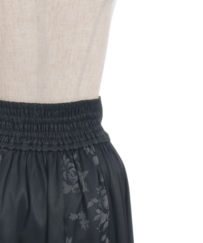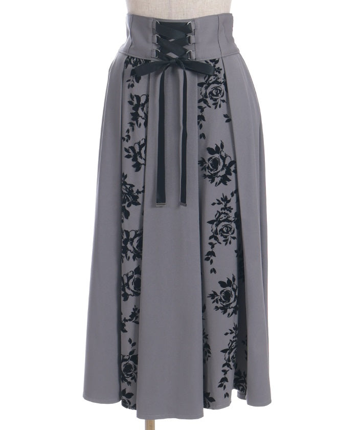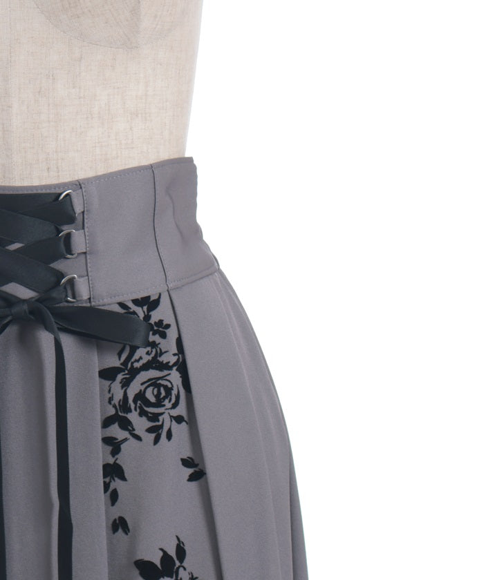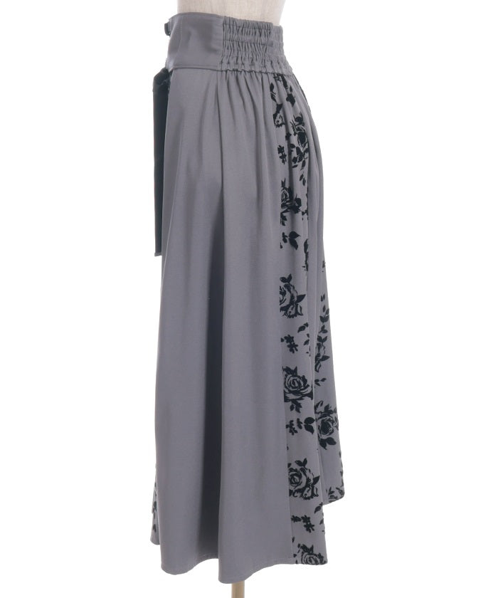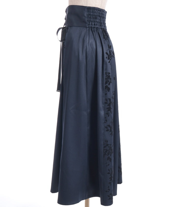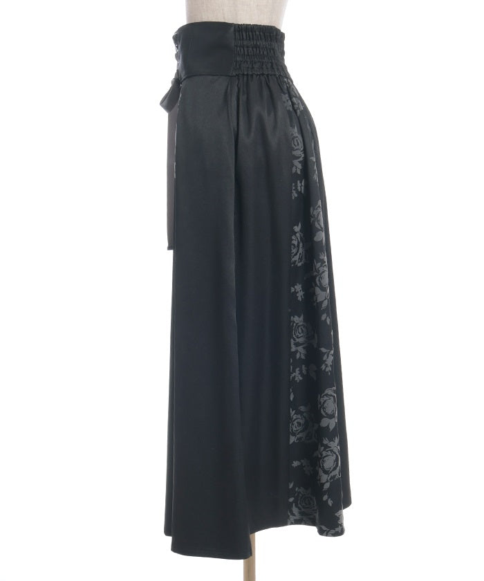 A long skirt combining elegance with a high-fashion look. The elegant rose pattern, expressed through a flocked print, adds a touch of elegance and depth.