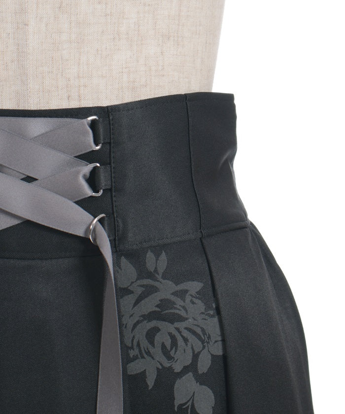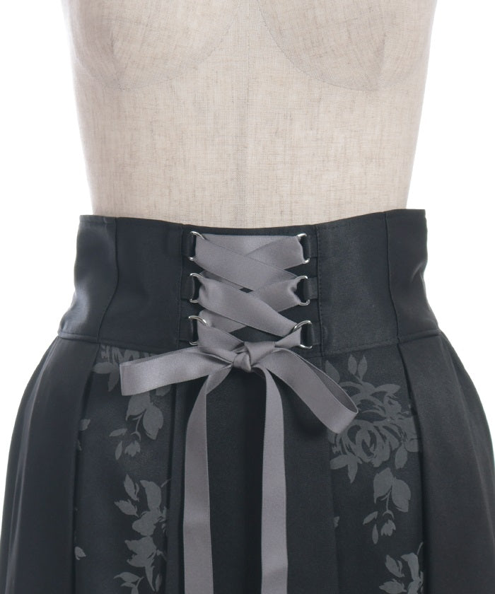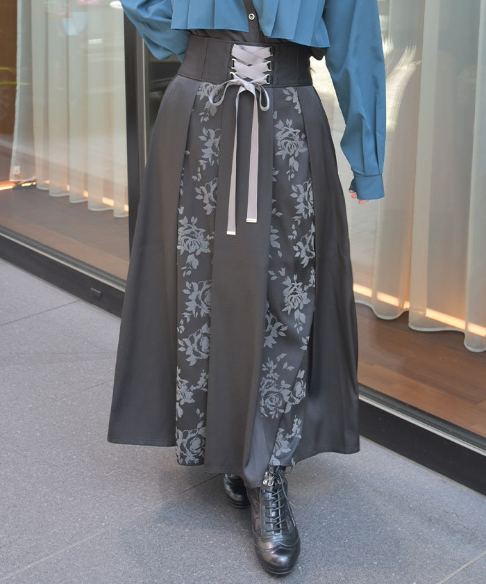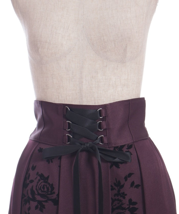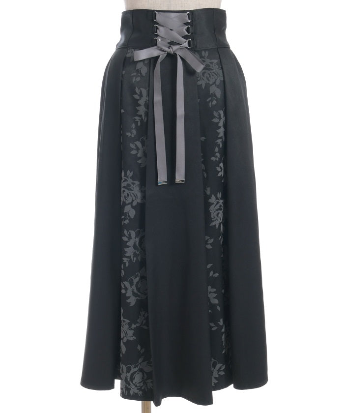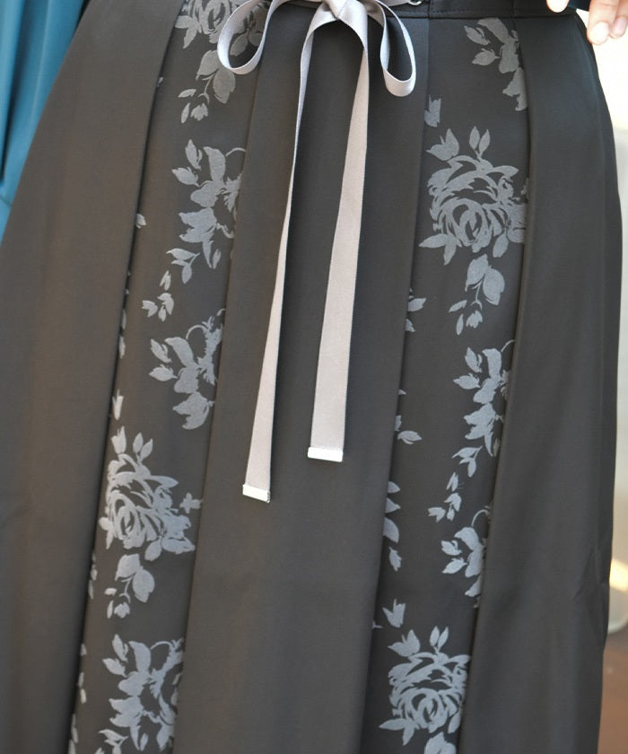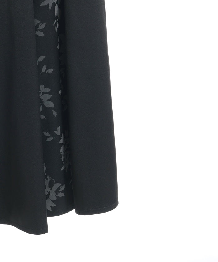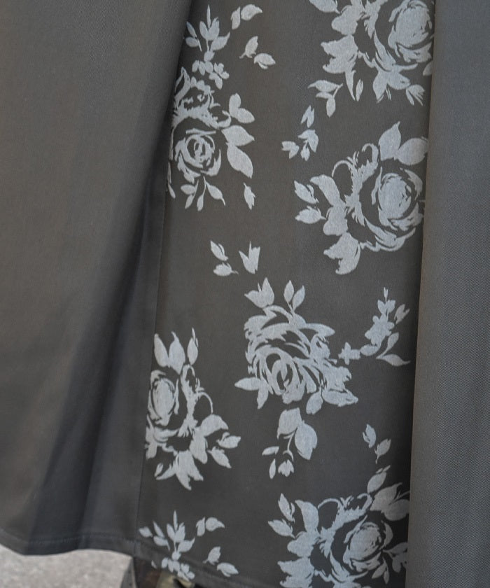 A long skirt combining elegance with a high-fashion look. The elegant rose pattern, expressed through a flocked print, adds a touch of elegance and depth.