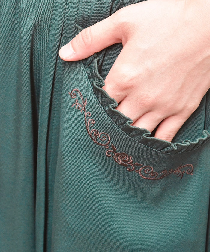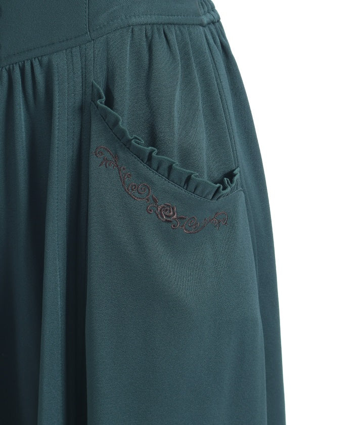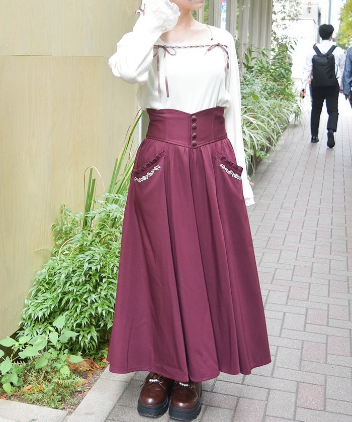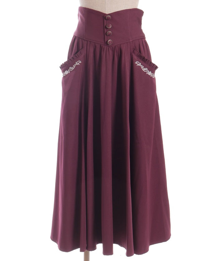 A high-waisted skirt featuring a striking silhouette with metal buttons at the waist and a high-positioned seam. Placed between the sleek vertical lines is a subtle accent from the delicate rose embroidery along the pockets.