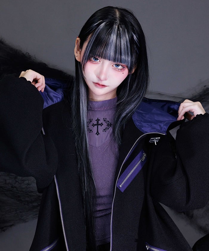 Complement the sleek I-silhouetted outfit with a voluminous outer layer!