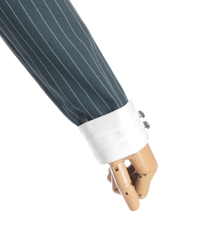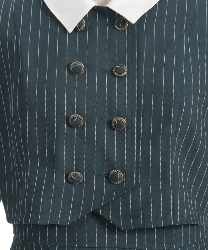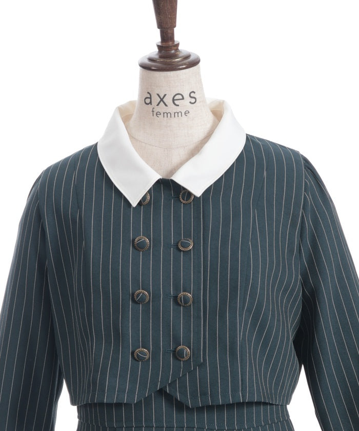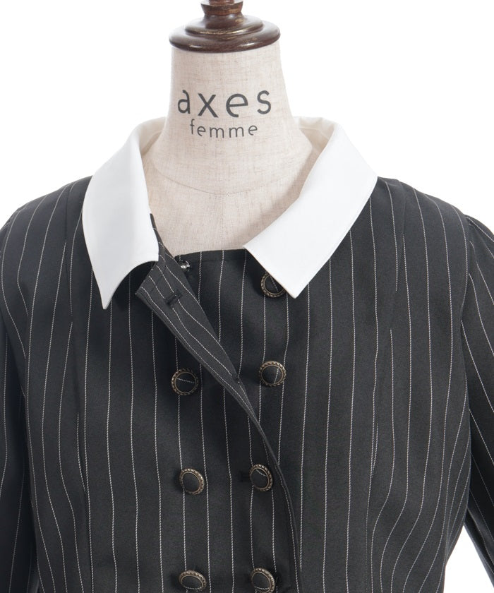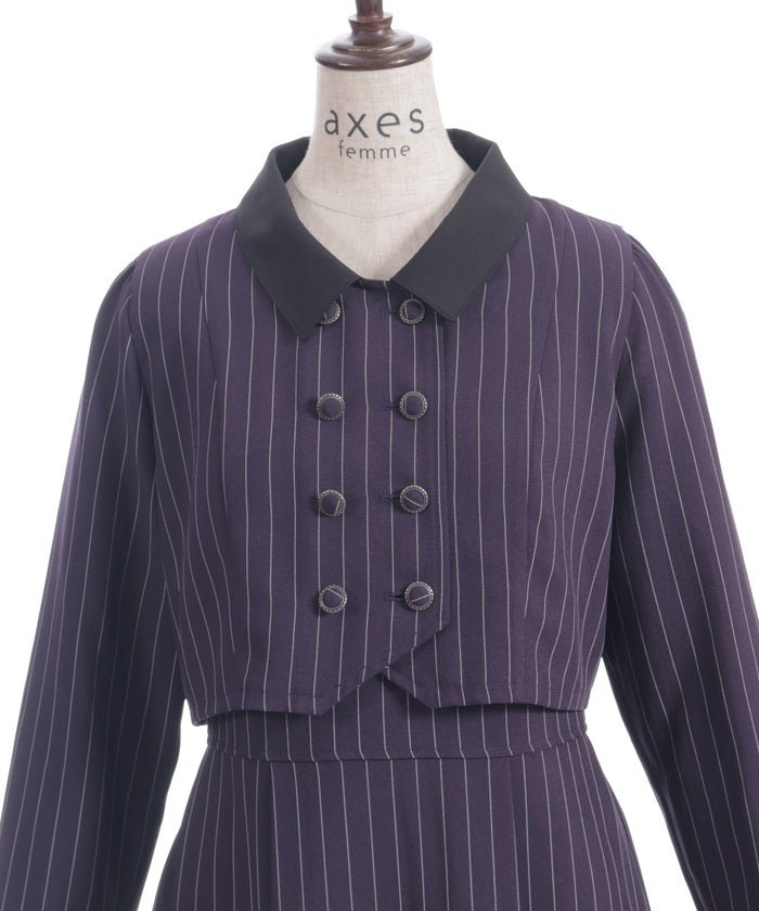 This dress features a gothic color scheme, combining striped and solid fabrics.