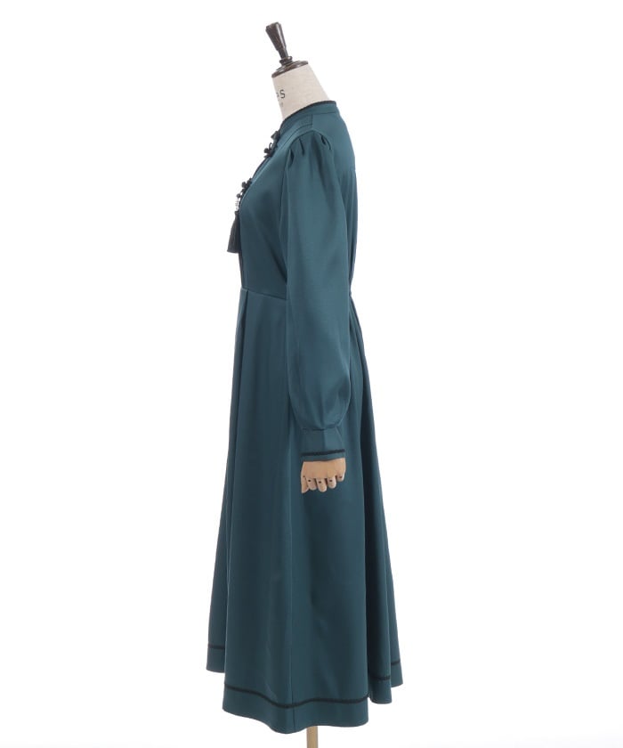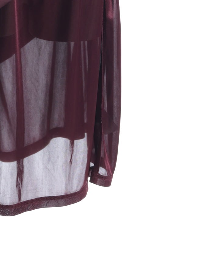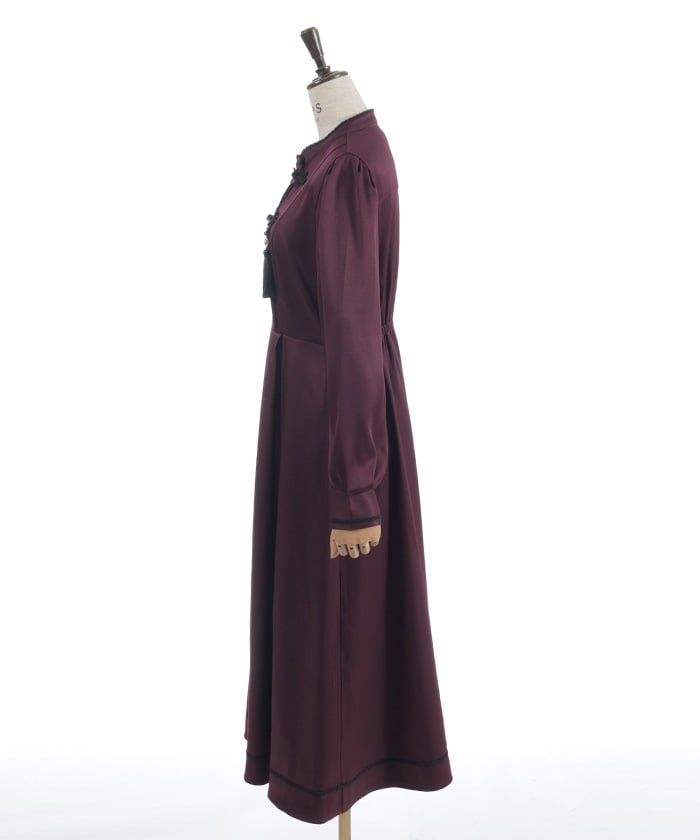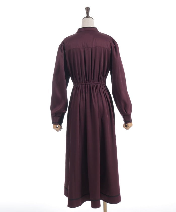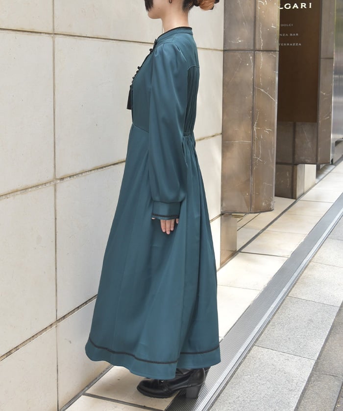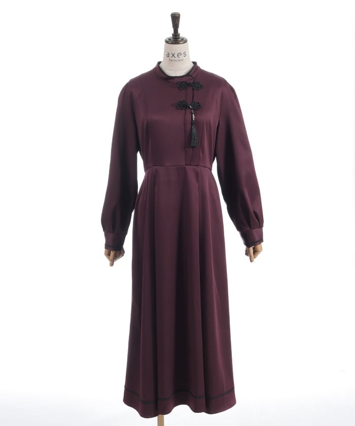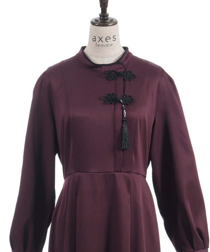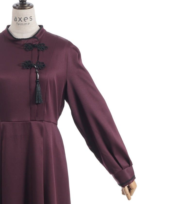 This long dress features a subdued color and elegant sheen, evoking an oriental aesthetic.