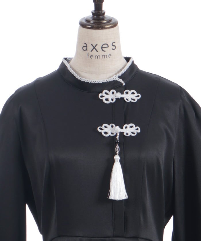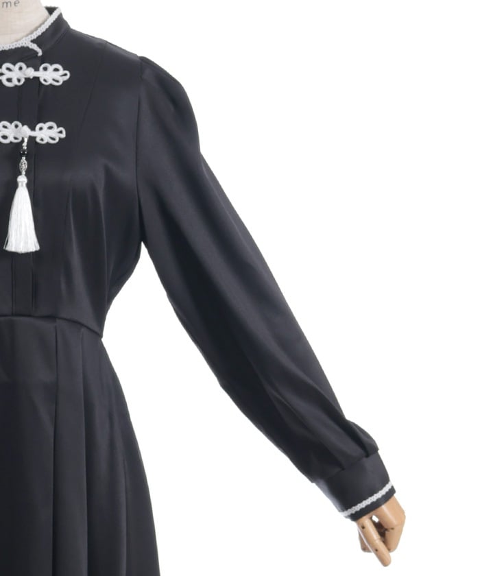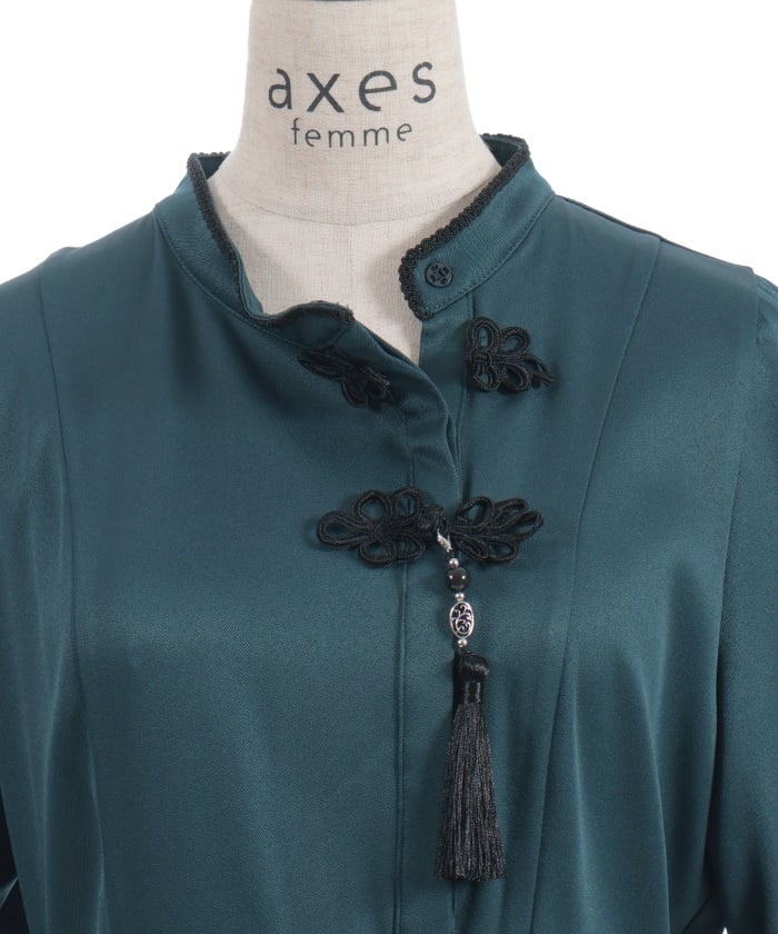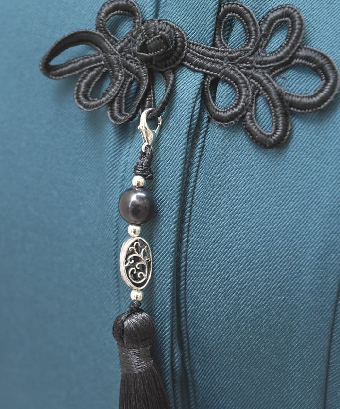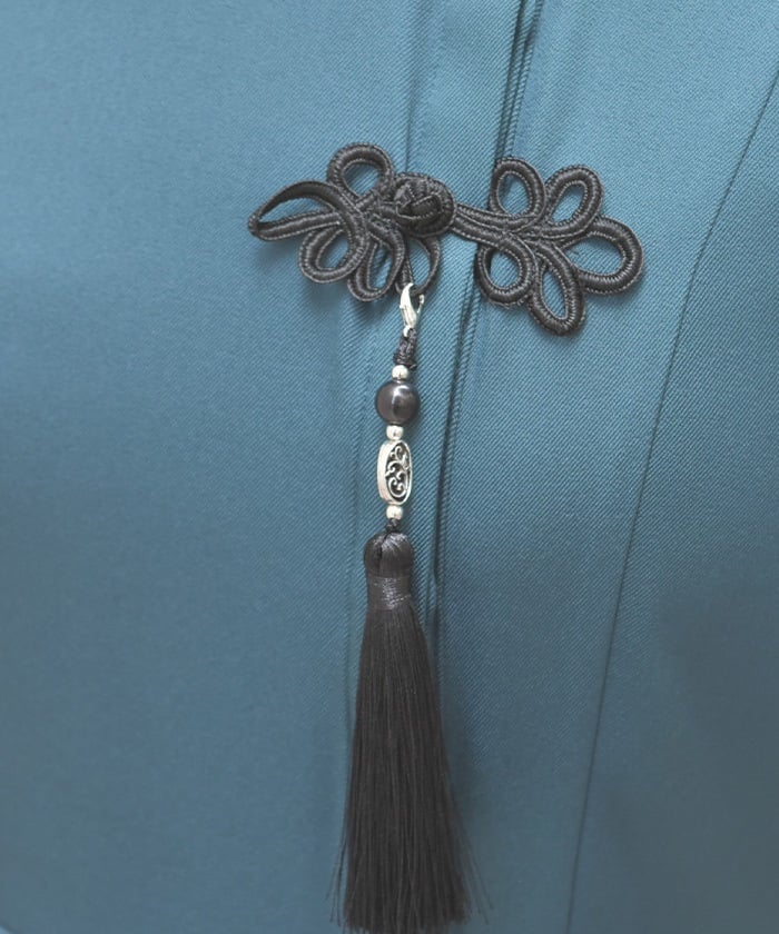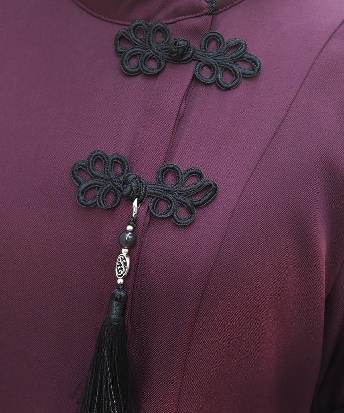 The stand-up collar creates a clean look, while the Chinese-inspired details on the front add a subtle accent, creating a beautiful silhouette with vertical lines.