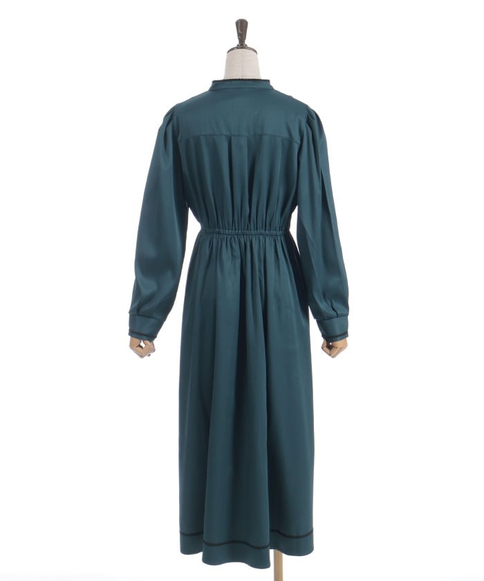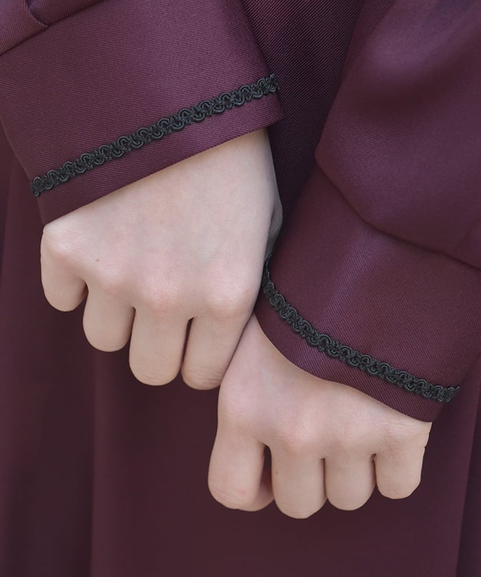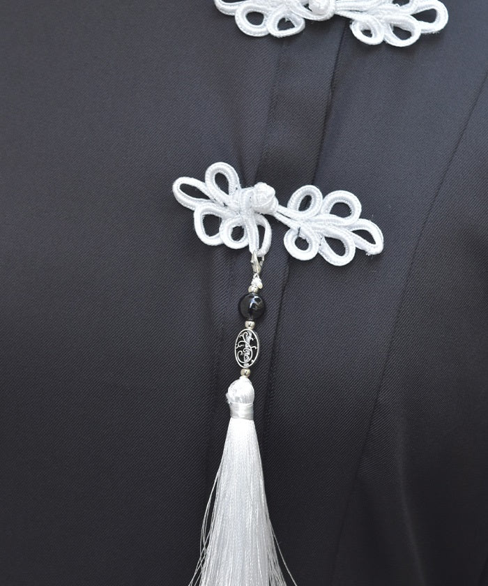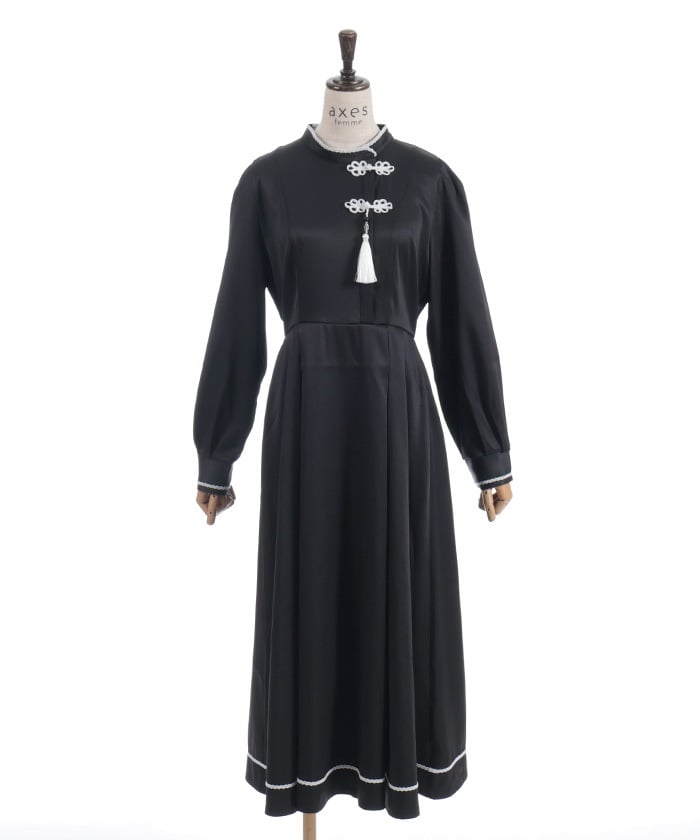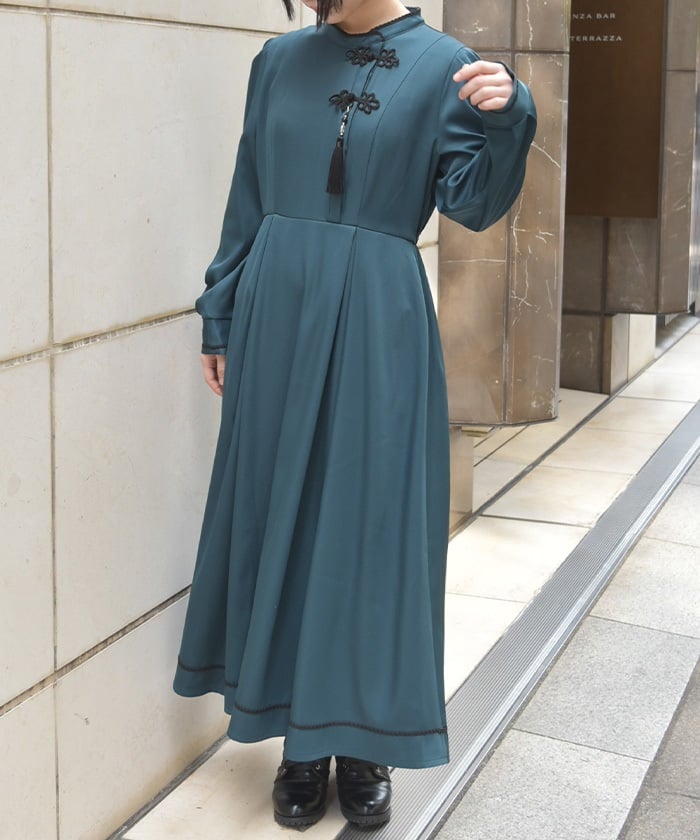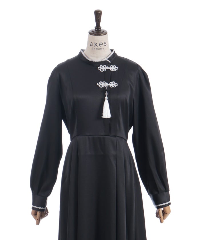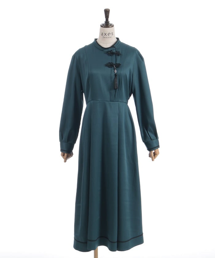 The stand-up collar creates a clean look, while the Chinese-inspired details on the front add a subtle accent, creating a beautiful silhouette with vertical lines.