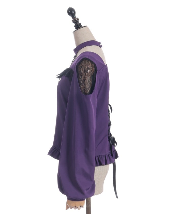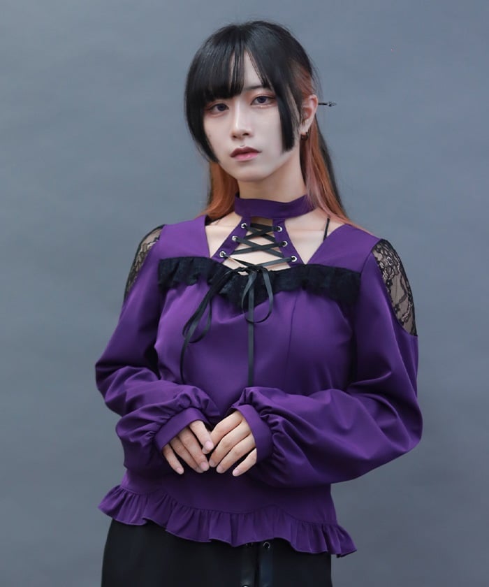 An eye-catching blouse with bold lace-up details adorning the décolleté.