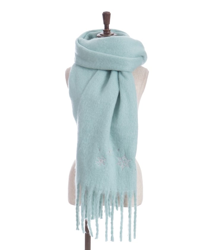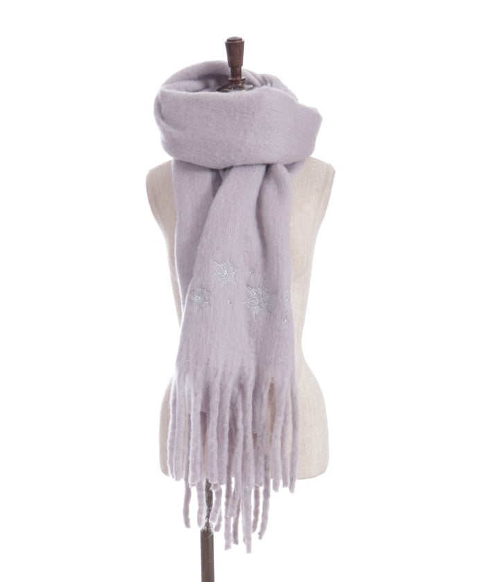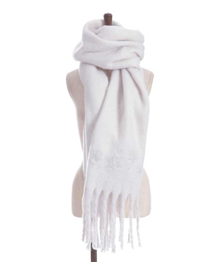 This shawl features a soft, fluffy, brushed fabric and embroidered snowflake motif.