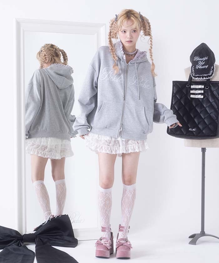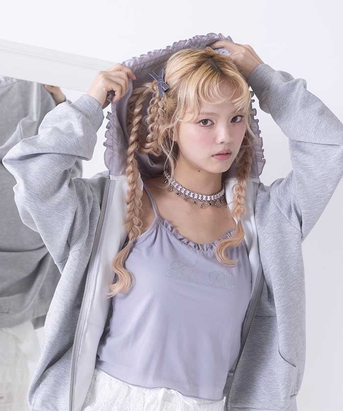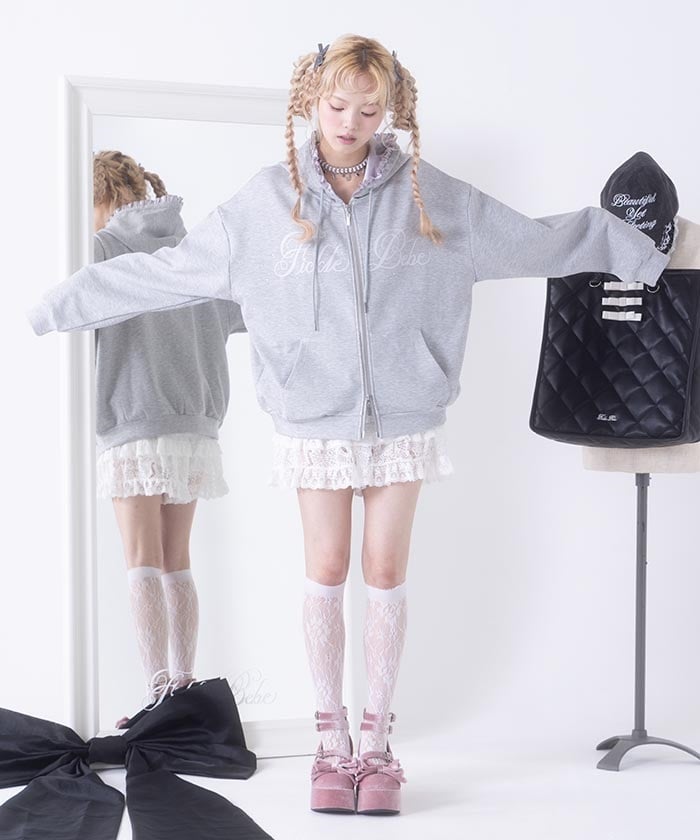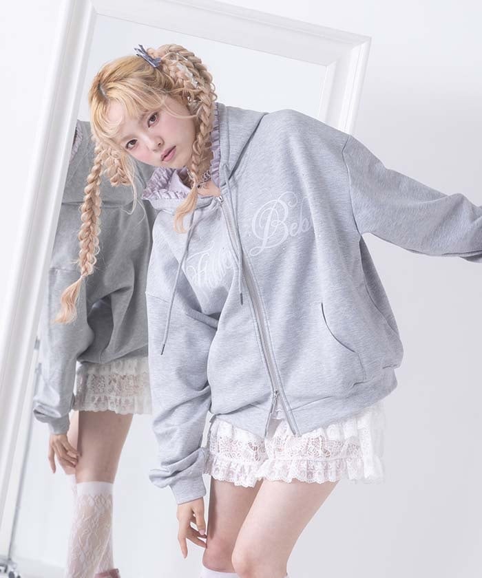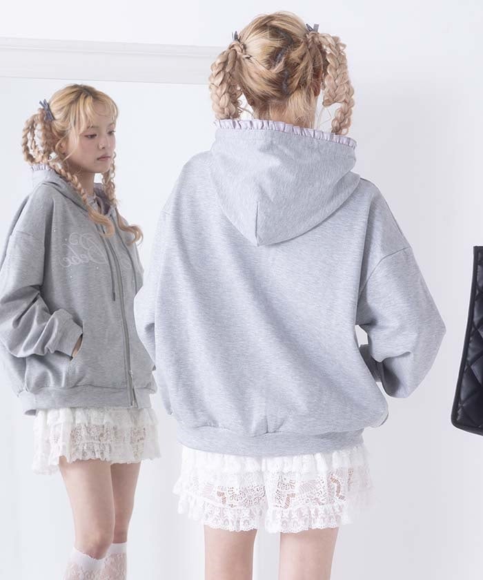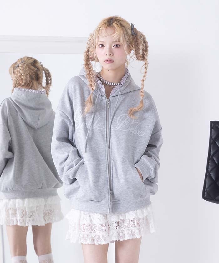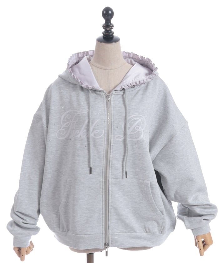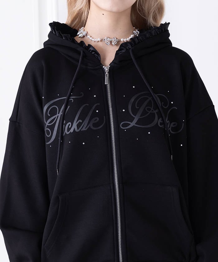 A cute zip-up hoodie with a large logo and jeweled edges.