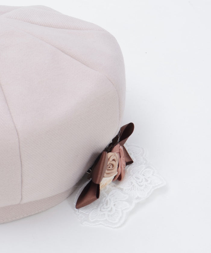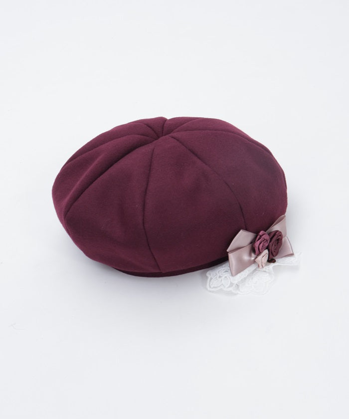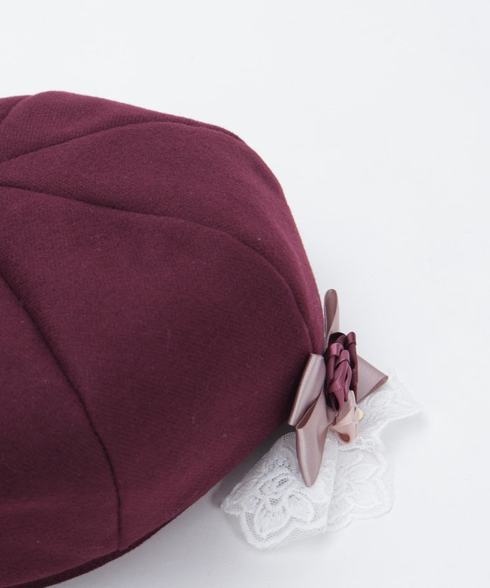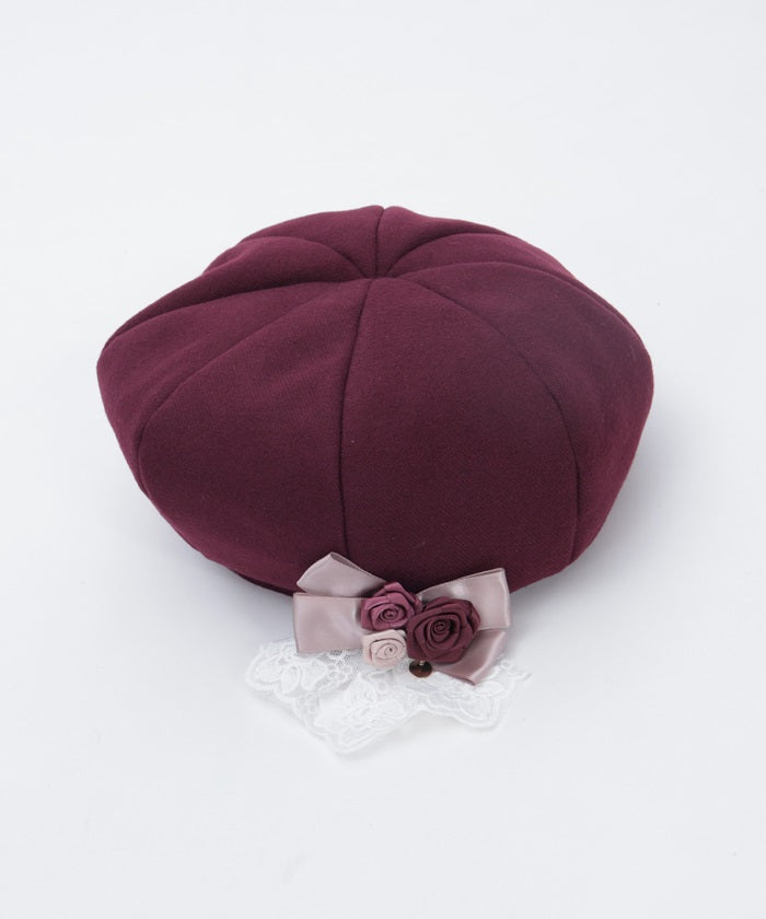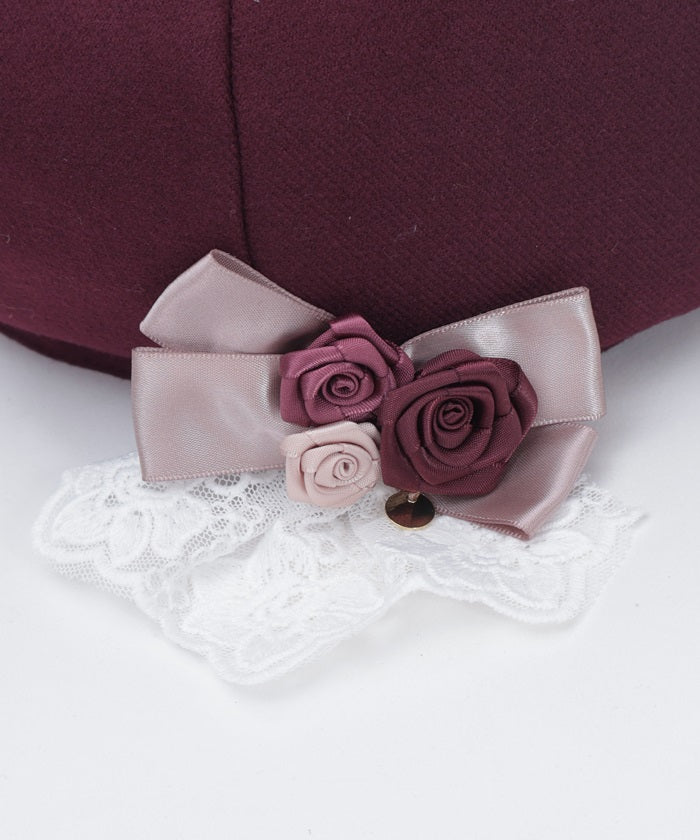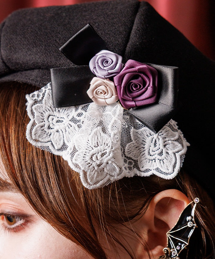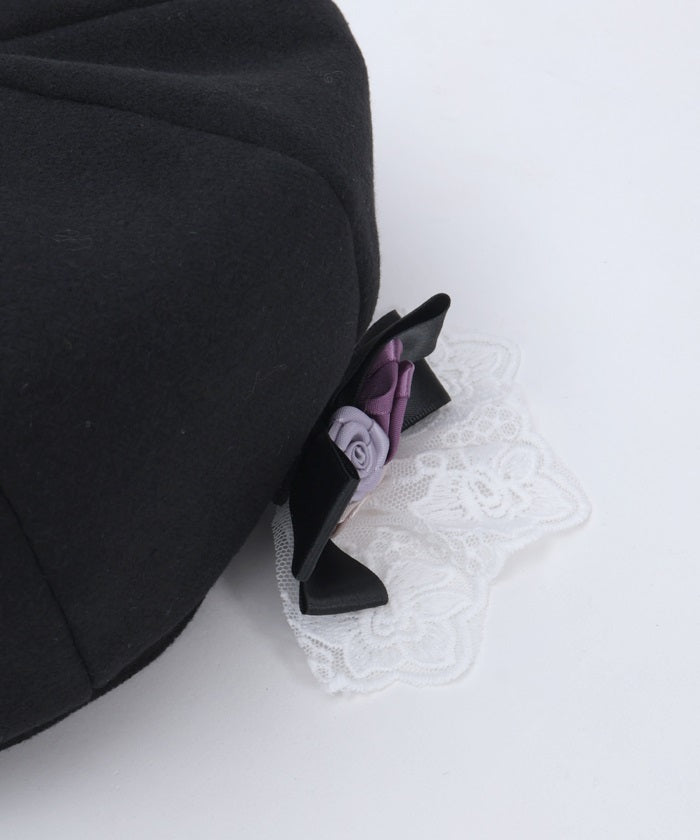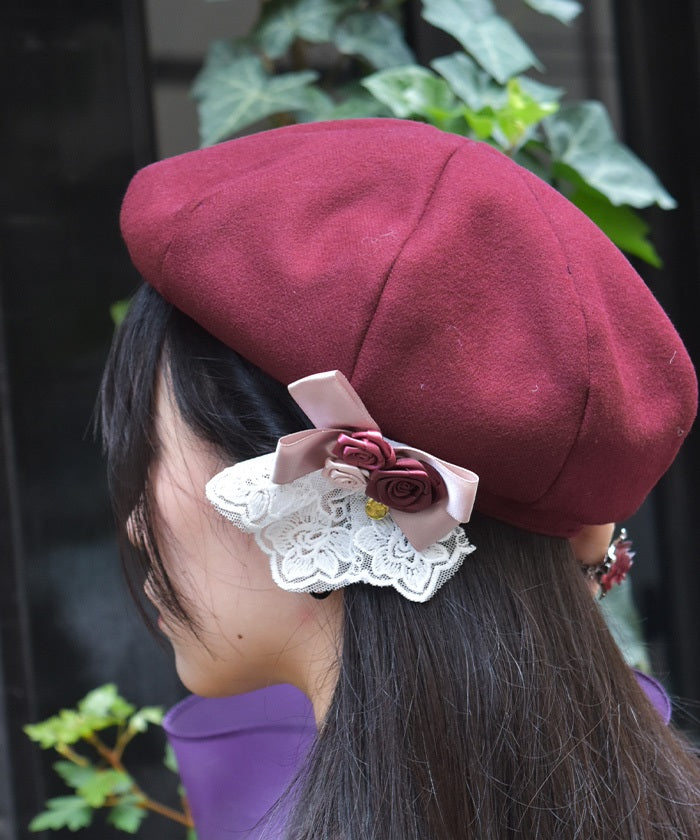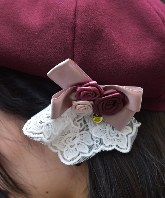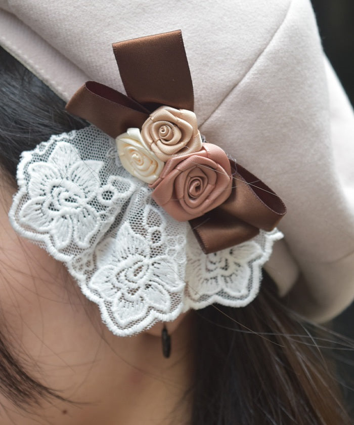 The ribbon rose brooch, accented with ribbons and lace, complements the body of the beret.