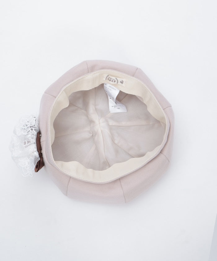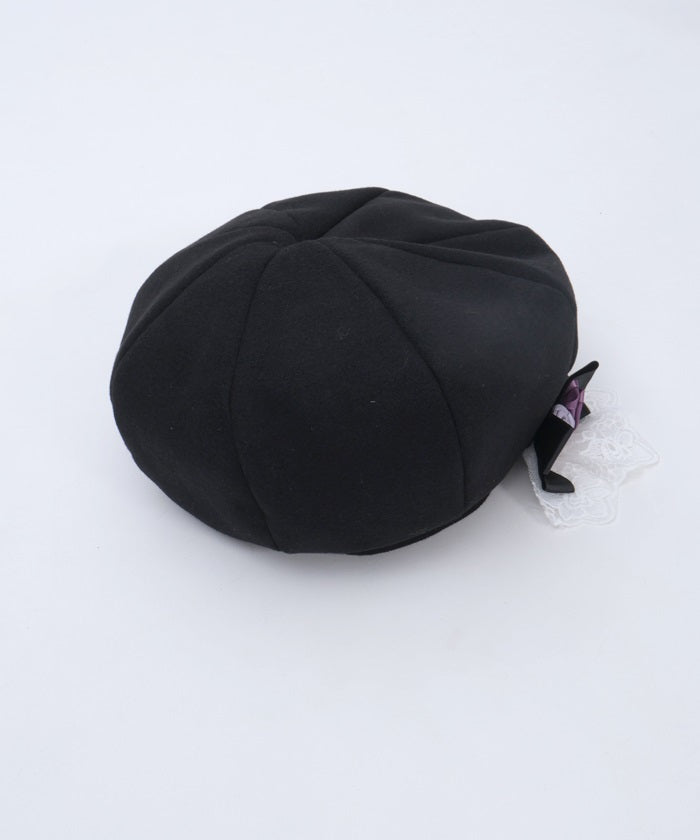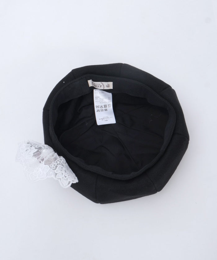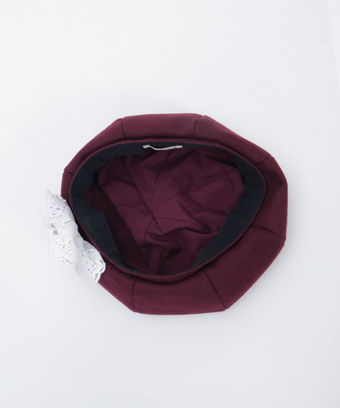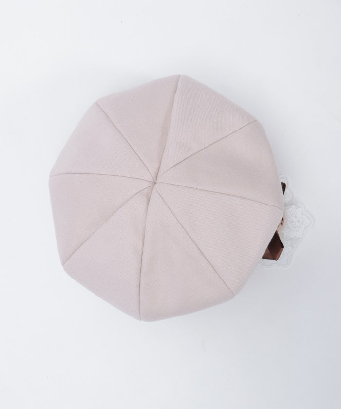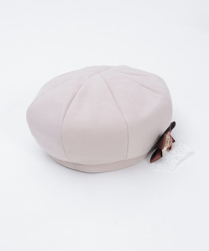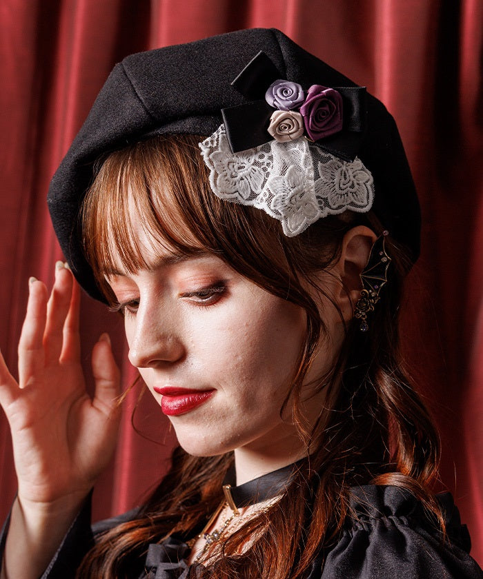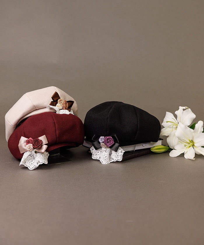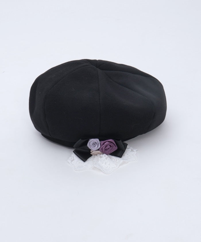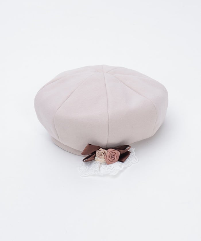 The ribbon rose brooch, accented with ribbons and lace, complements the body of the beret.