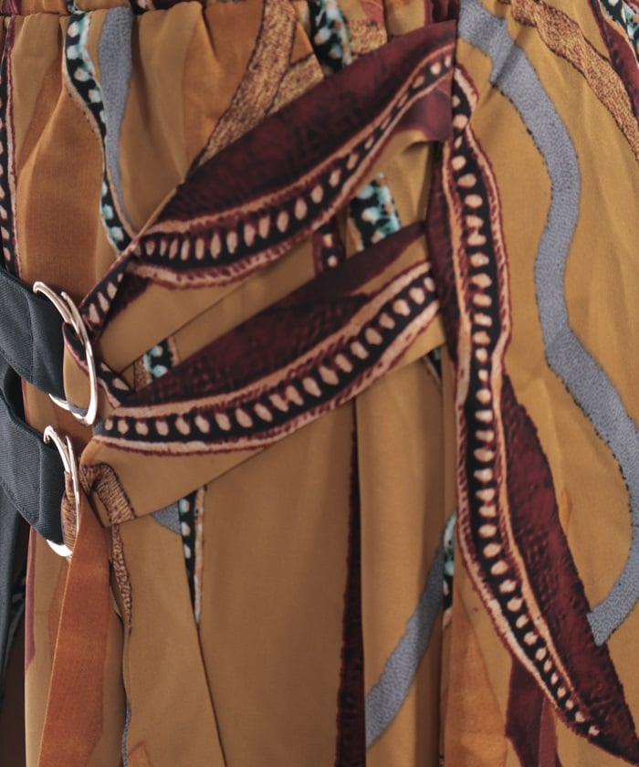 The boldly patterned asymmetrical elements and belt accents are the highlights.